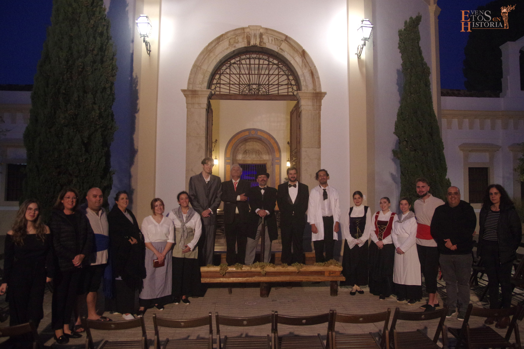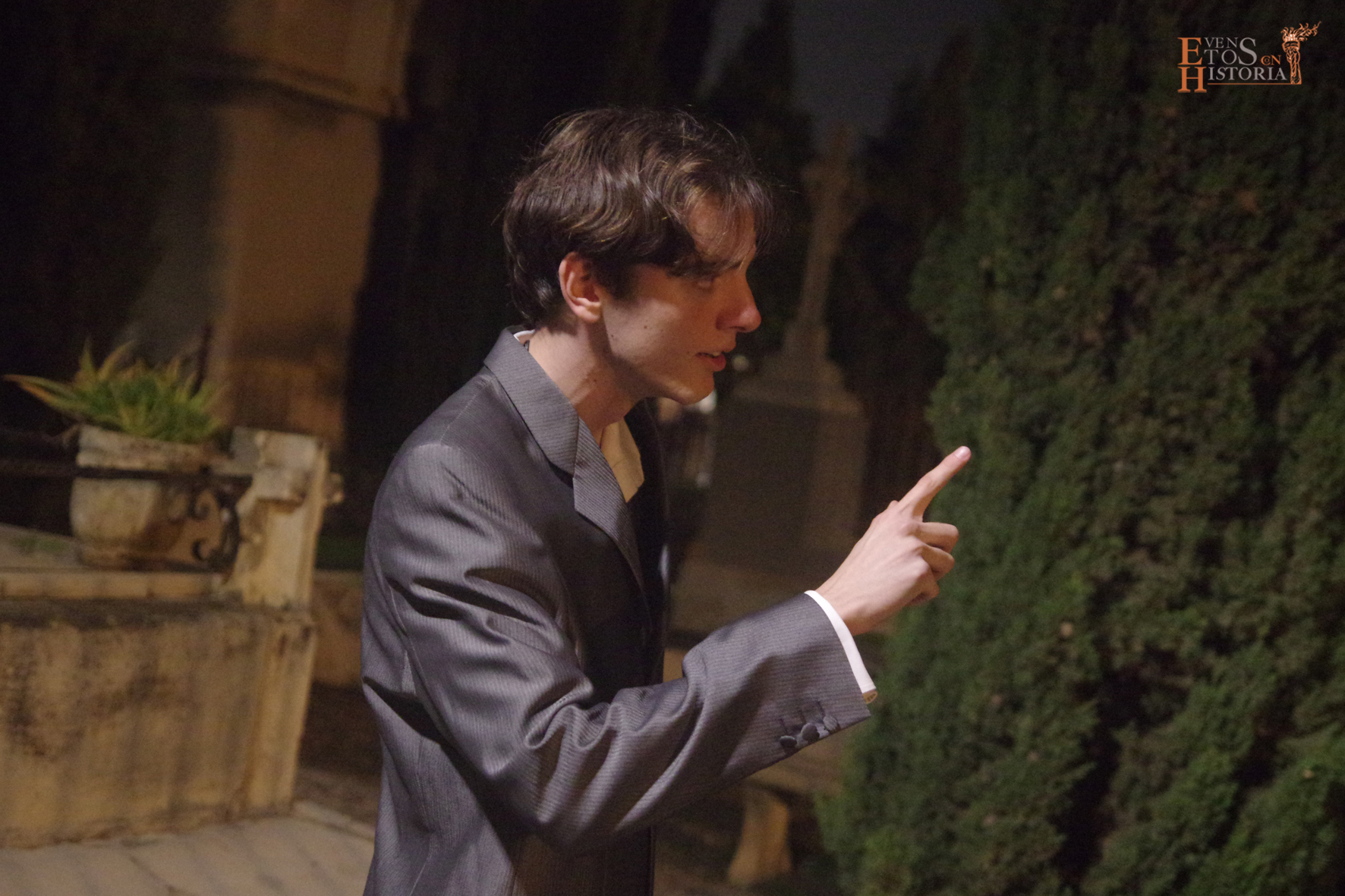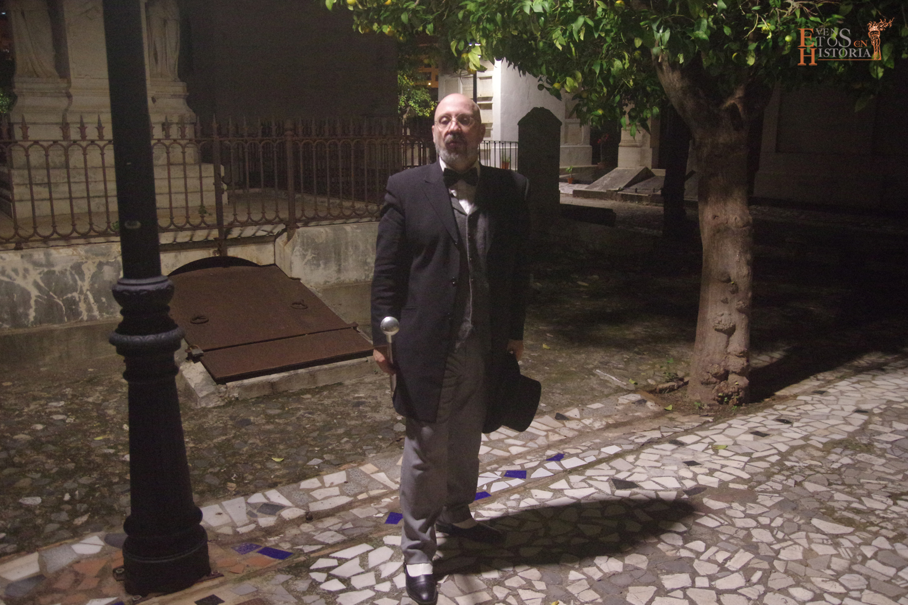 Es por ello que rescatamos de la historia a personajes relacionados con el mundo del vino y las pasas. Cuatro anfitrionas trabajadoras en este gremio acompañaron a los 100 asistentes por los mausoleos de distintas familias bodegueras que se encuentran en este espacio tan singular con una explicación basada en la documentación del profesor de la Universidad de Málaga Francisco José Rodríguez Marín. Los actores dieron vida a Narciso Díaz de Escovar, José Aurelio Larios, a Baldomero Ghiara, a Carlos Juan Krauel y a Quirico López junto a sus dos sobrinas, Trini y Rita.