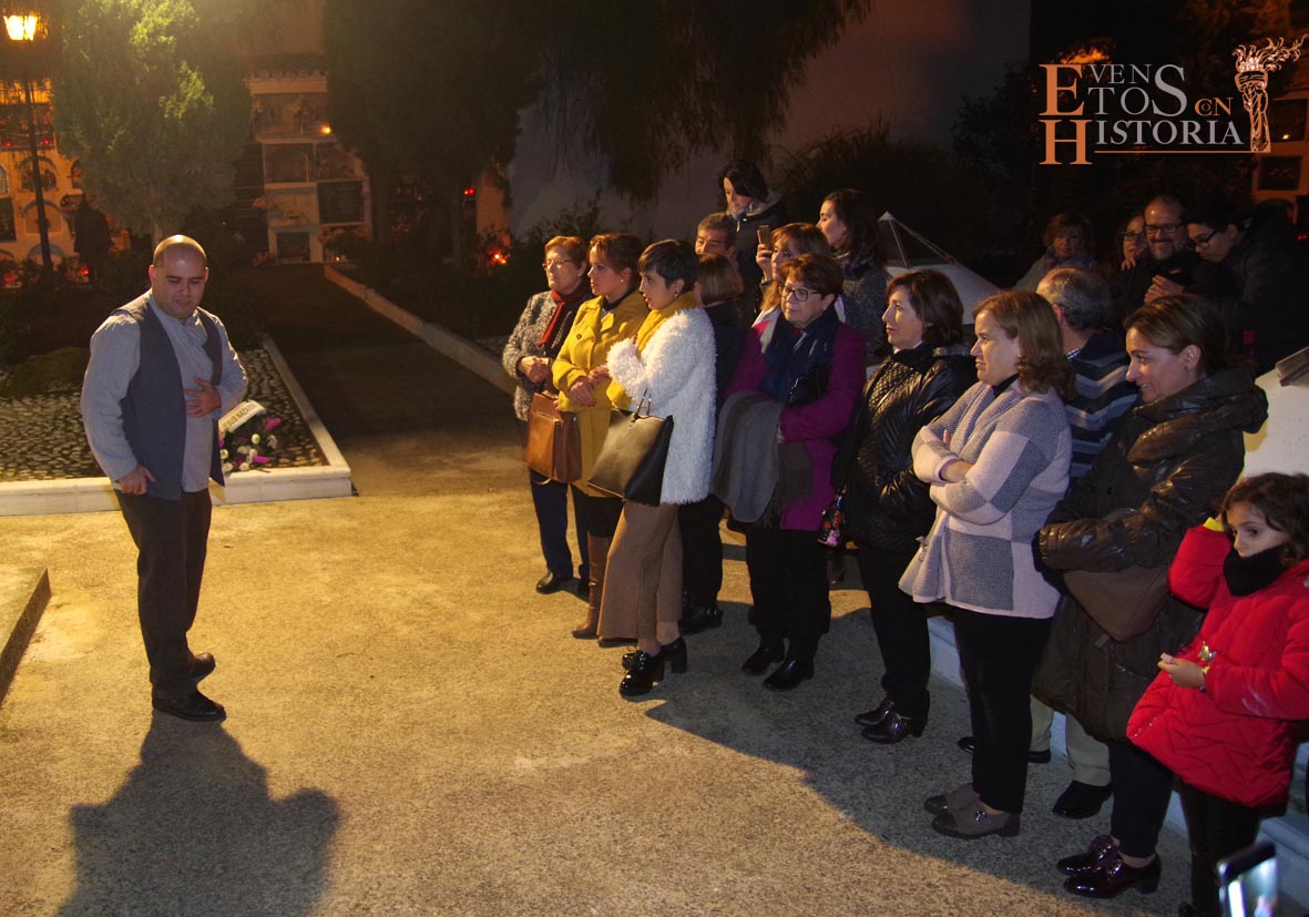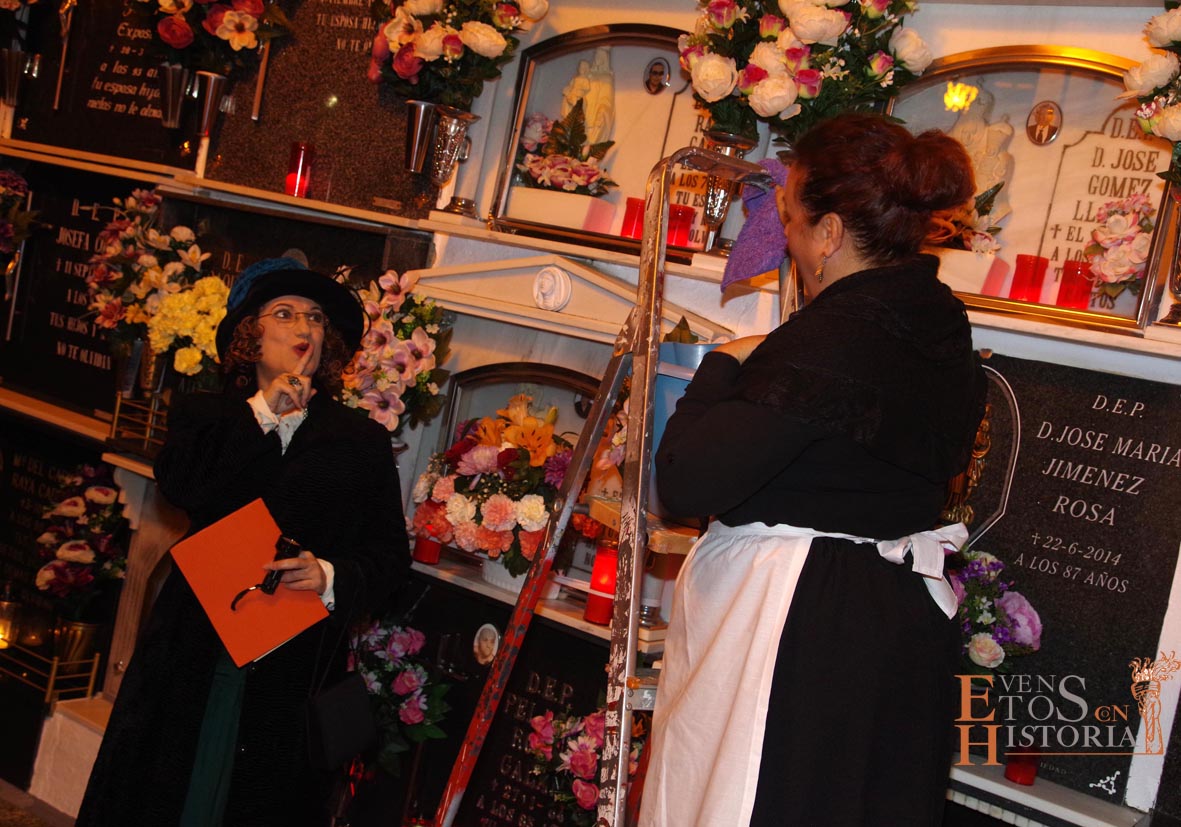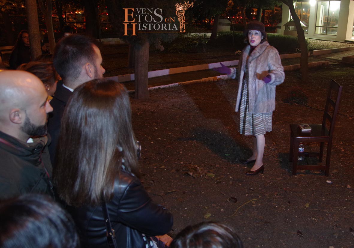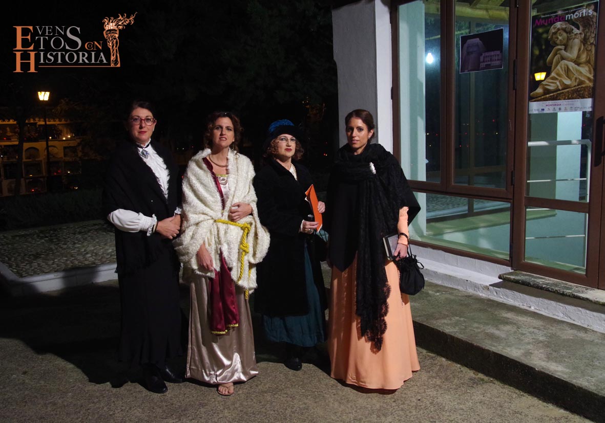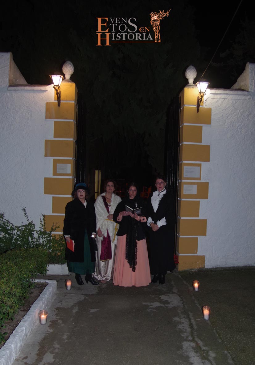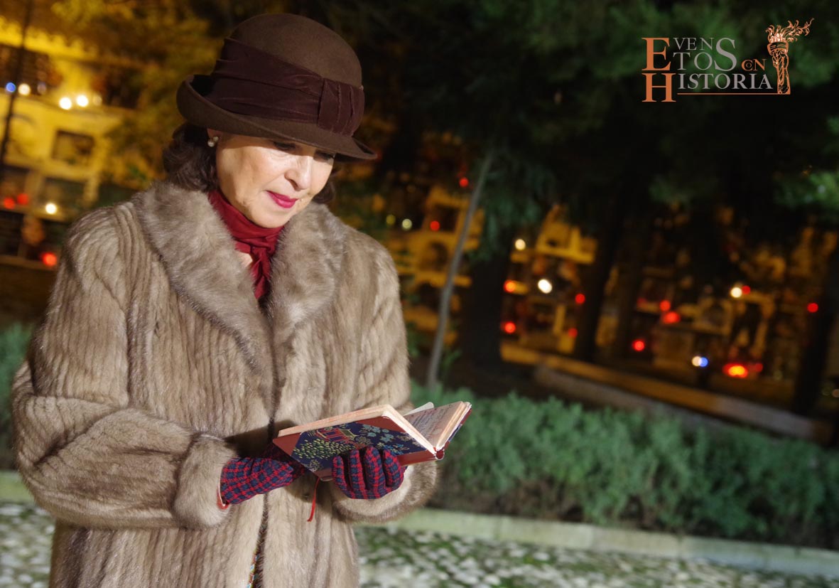 María Gallardo, poetisa de la Generación del 27, recibía al público en la entrada del cementerio. Todo el entorno le inspiraba en su recorrido. Nos habló de la flora, de algunas lápidas, sus epitafios, del agua presente en las fuentes… con melodías en directo de violín. Aparece Pablo Muñoz, joven militar caído en la Guerra Civil Española que impactó con el dolor vivido y dio desde su postura de alma un mensaje de unidad.