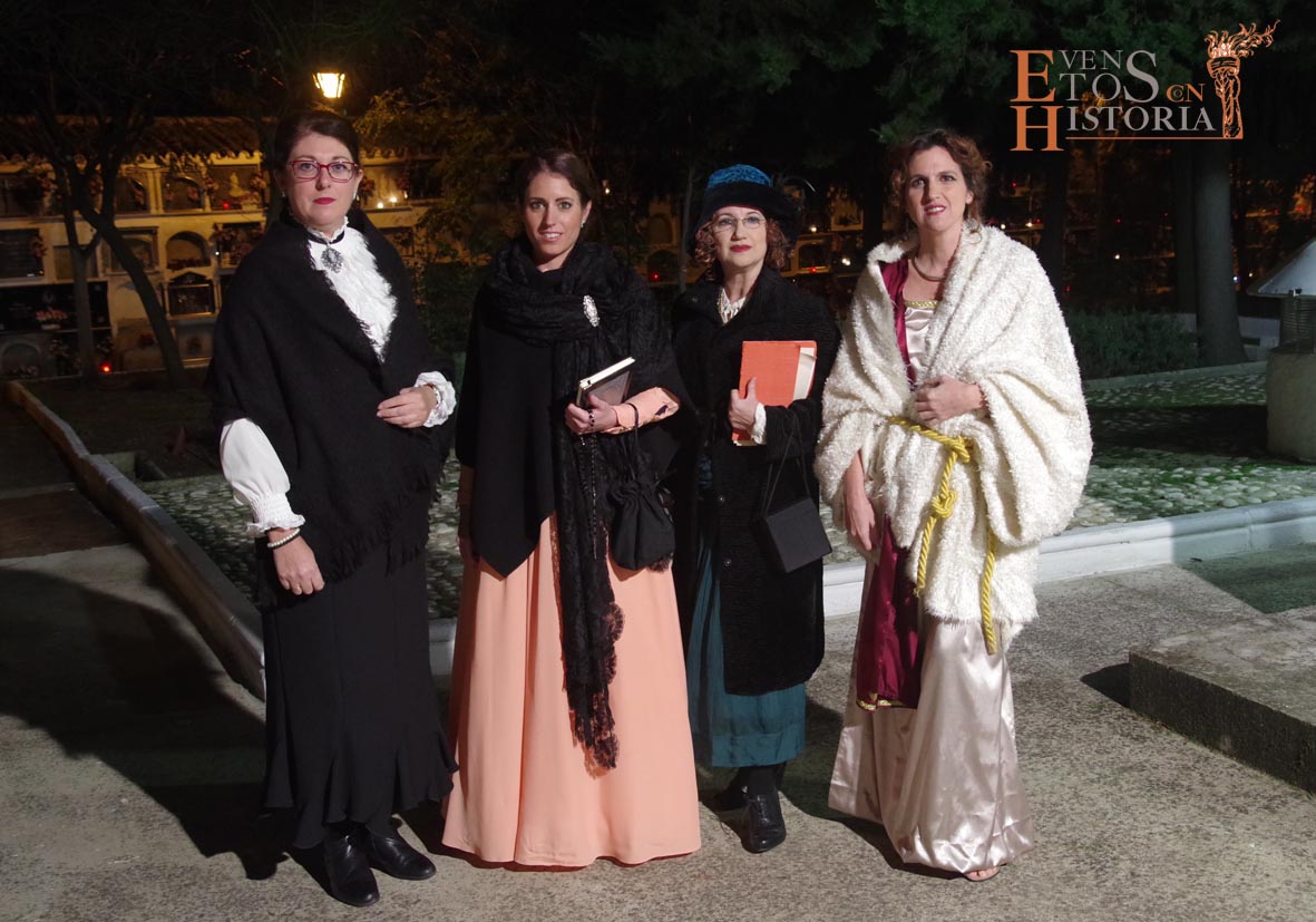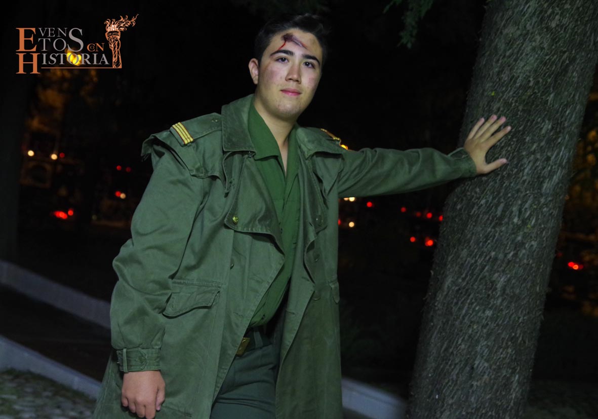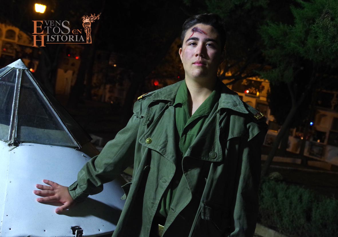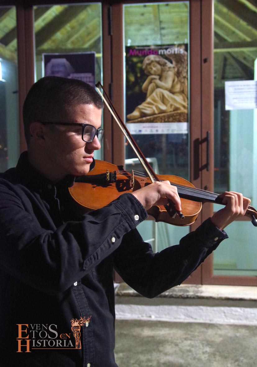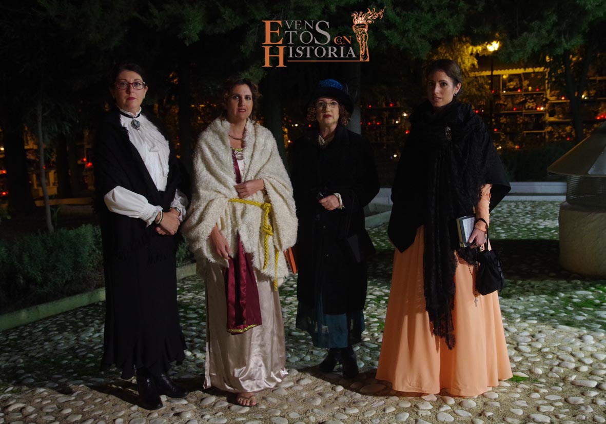 María Gallardo, poetisa de la Generación del 27, recibía al público en la entrada del cementerio. Todo el entorno le inspiraba en su recorrido. Nos habló de la flora, de algunas lápidas, sus epitafios, del agua presente en las fuentes… con melodías en directo de violín. Aparece Pablo Muñoz, joven militar caído en la Guerra Civil Española que impactó con el dolor vivido y dio desde su postura de alma un mensaje de unidad.