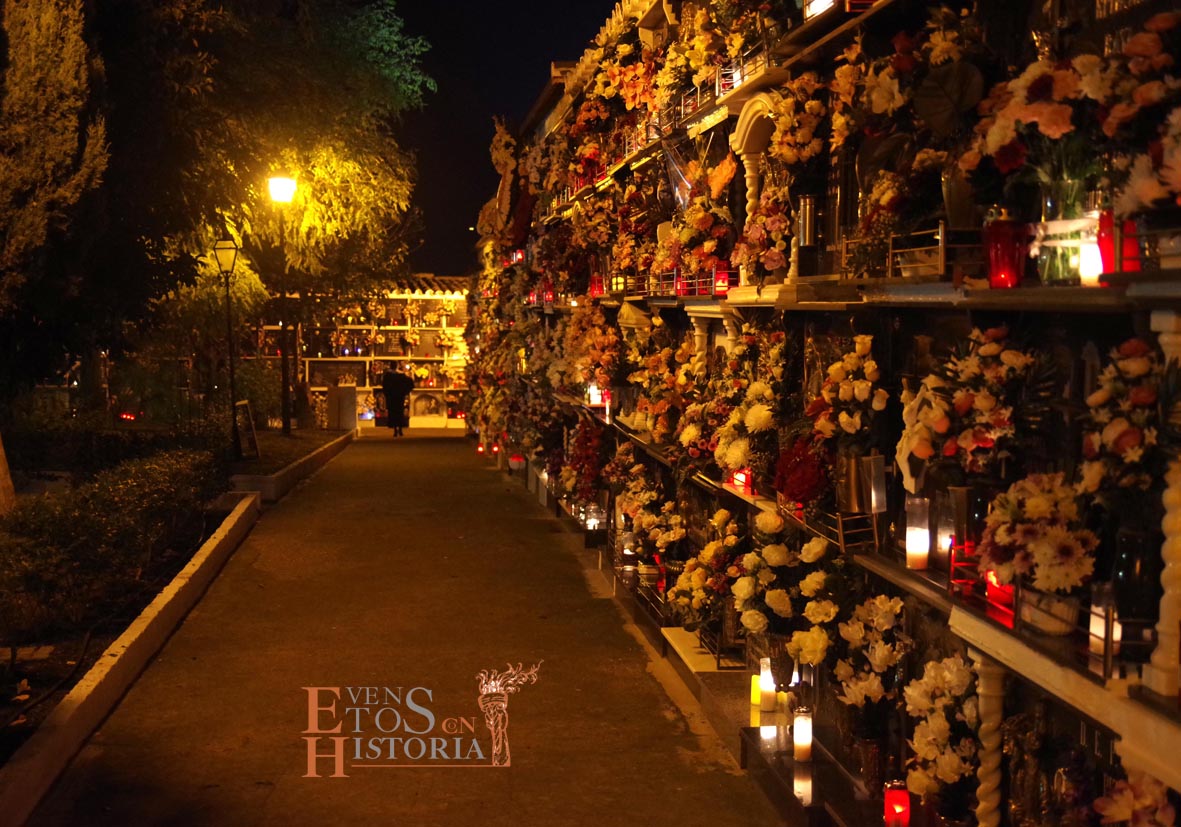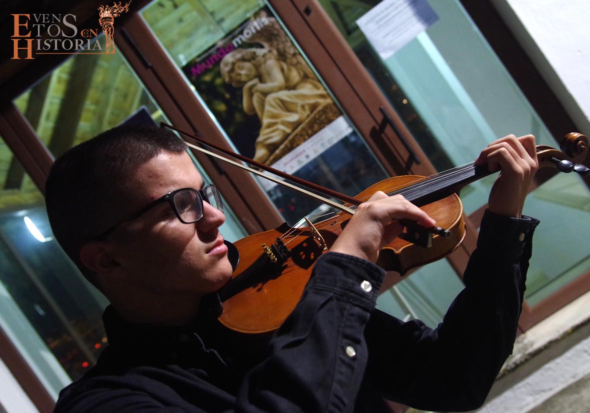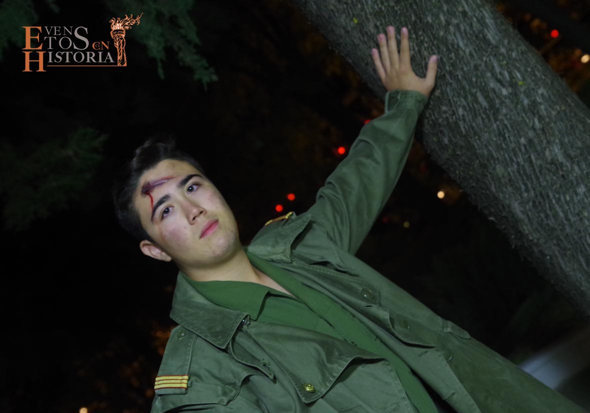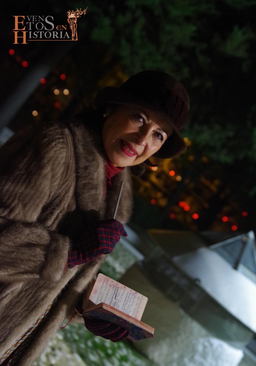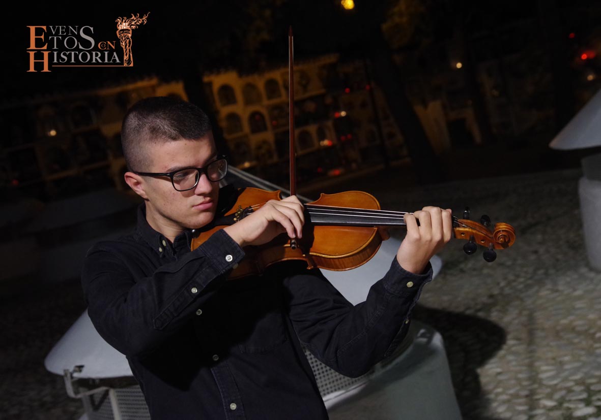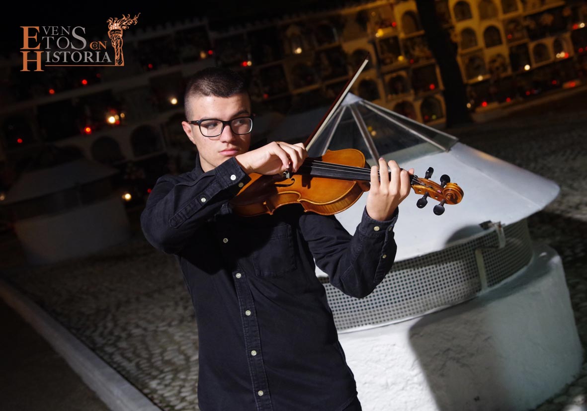 María Gallardo, poetisa de la Generación del 27, recibía al público en la entrada del cementerio. Todo el entorno le inspiraba en su recorrido. Nos habló de la flora, de algunas lápidas, sus epitafios, del agua presente en las fuentes… con melodías en directo de violín. Aparece Pablo Muñoz, joven militar caído en la Guerra Civil Española que impactó con el dolor vivido y dio desde su postura de alma un mensaje de unidad.