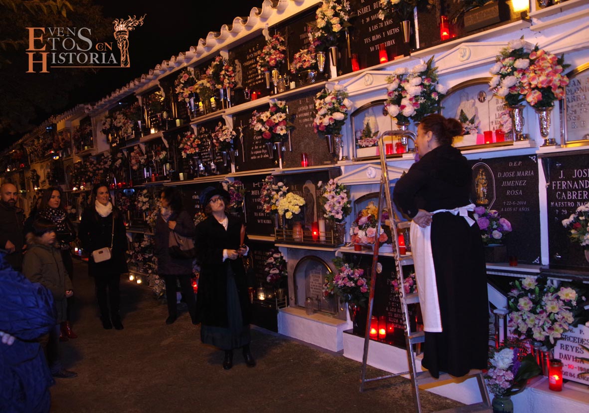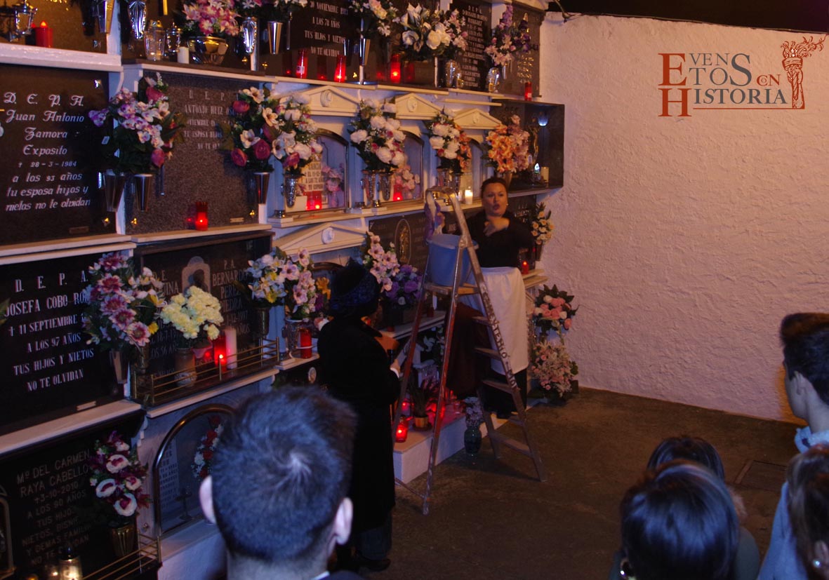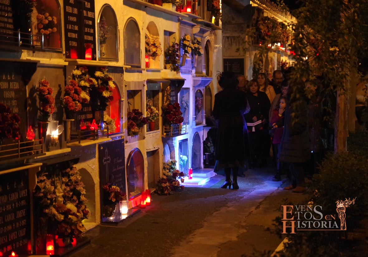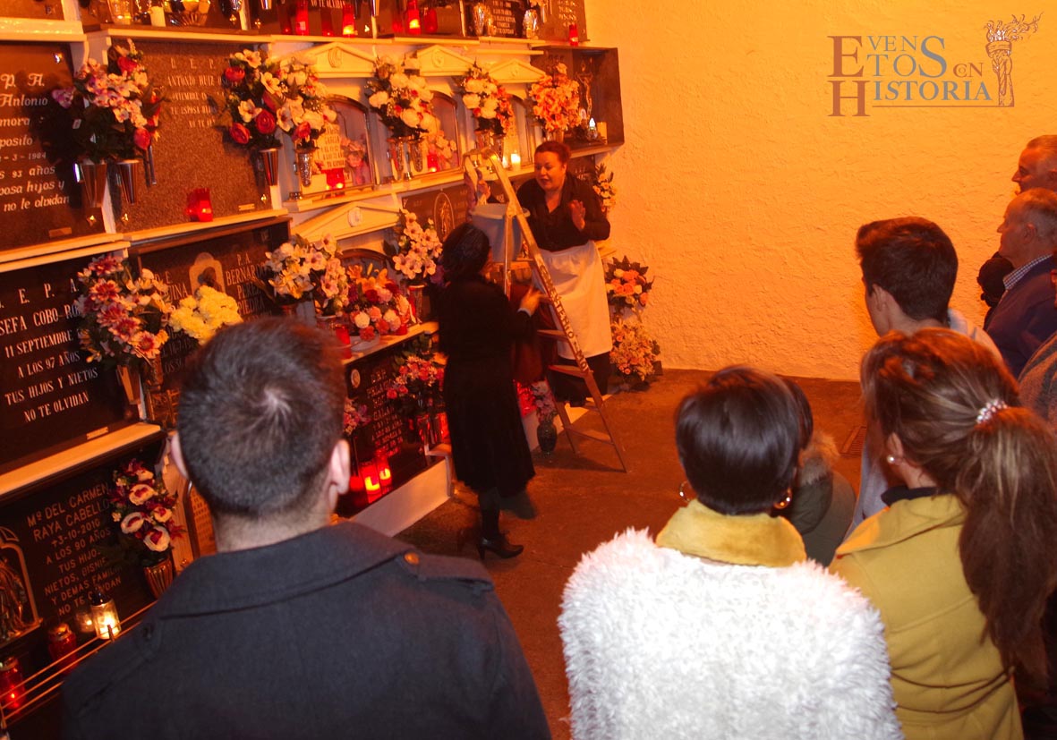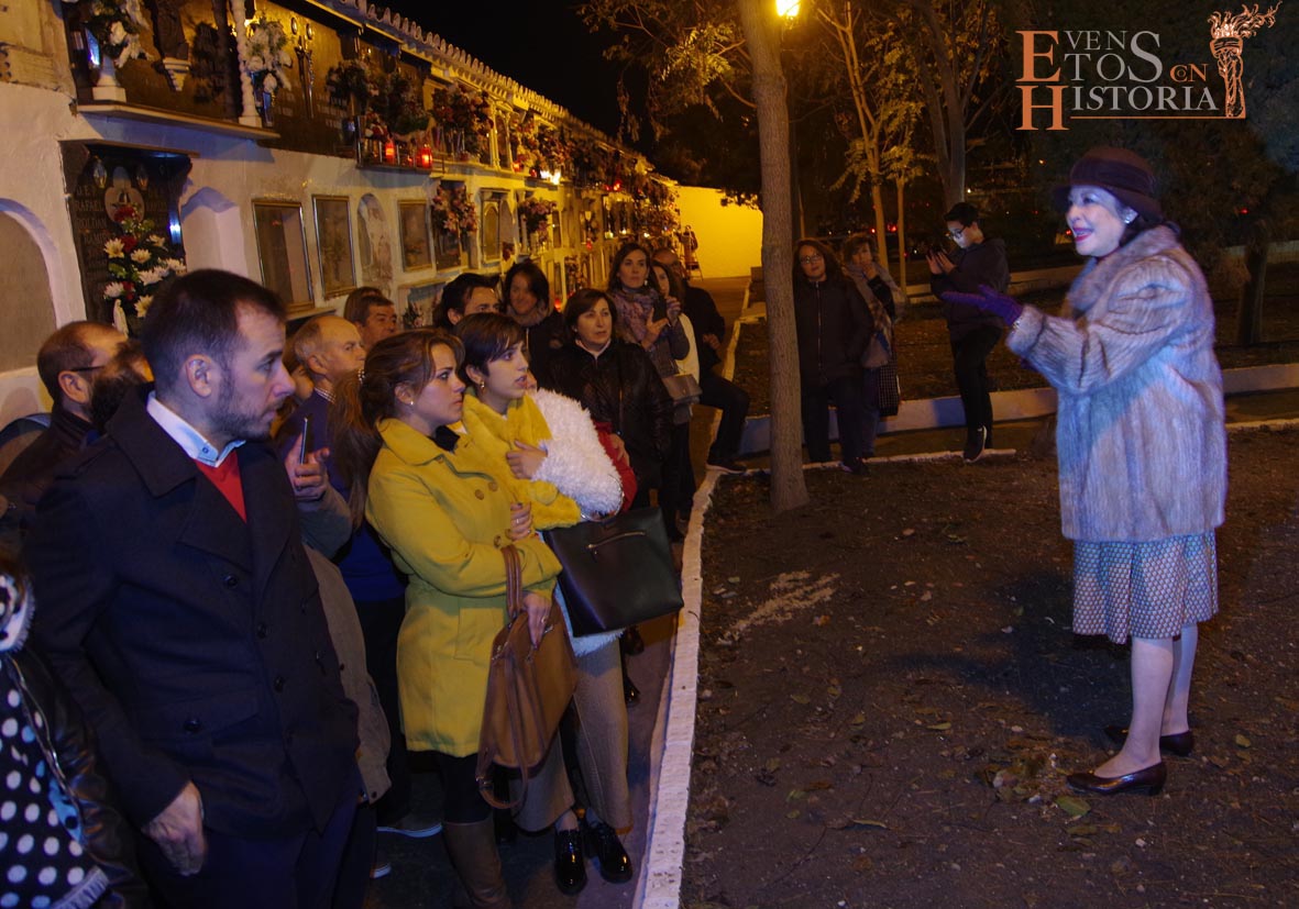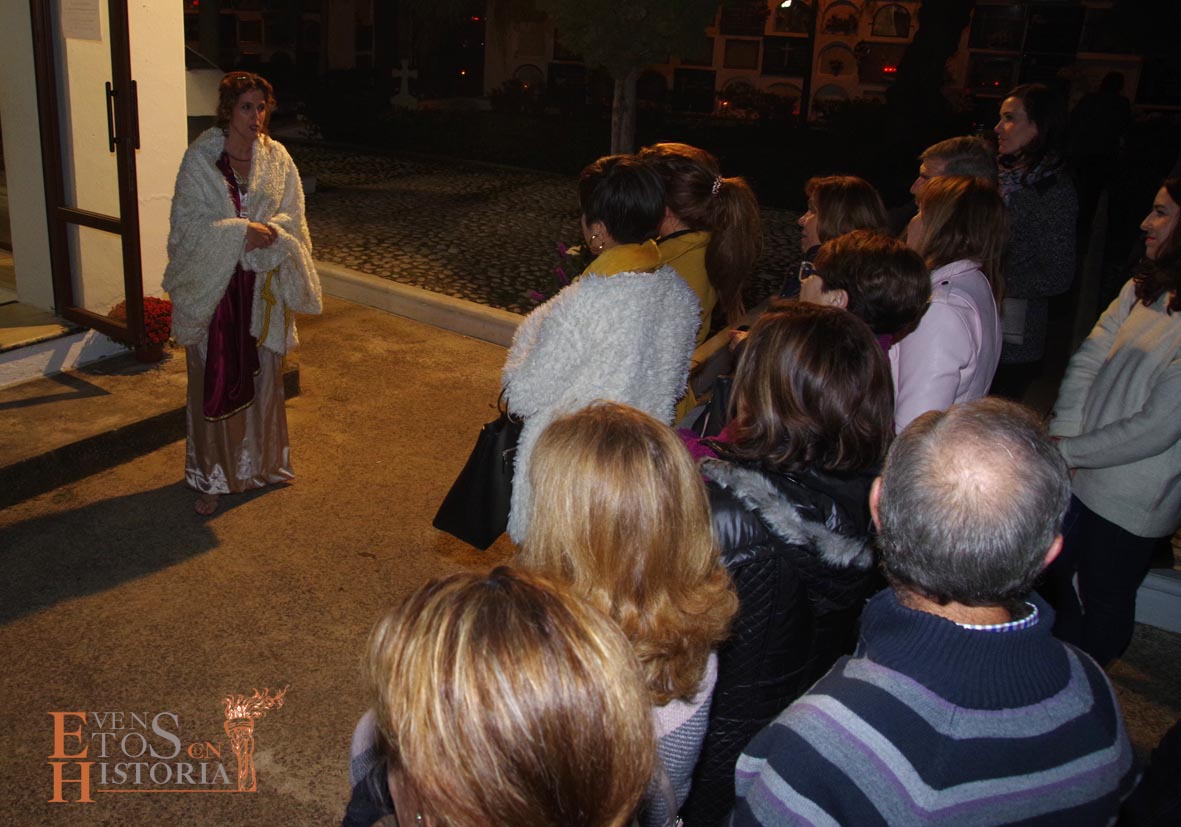 Continúa el recorrido en una atmósfera mágica entre tenues luces de velas que alumbran los nichos y Dolores «la Santera» irrumpe con su mensaje que habla de tradición en el mes de Todos los Santos. A pocos metros, esperaba en su silla «la maestra», Mª Carmen Corpas. La encontramos ensimismada eligiendo a los actores para su próxima obra de teatro. Cuando vio a los visitantes, les contó su gran pasión, la enseñanza a niños de párvulos que marcaría su vida y la de muchos monturqueños que aún hoy la recuerdan con cariño.