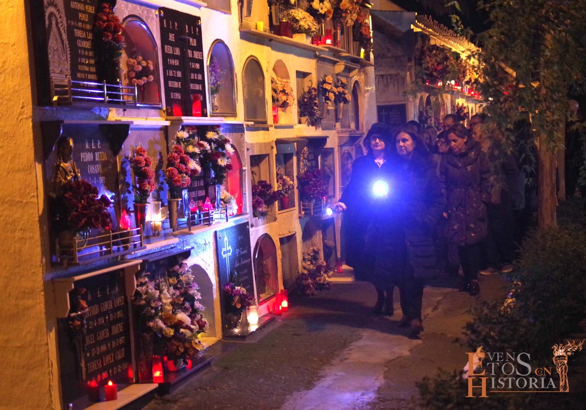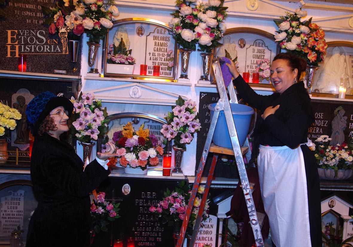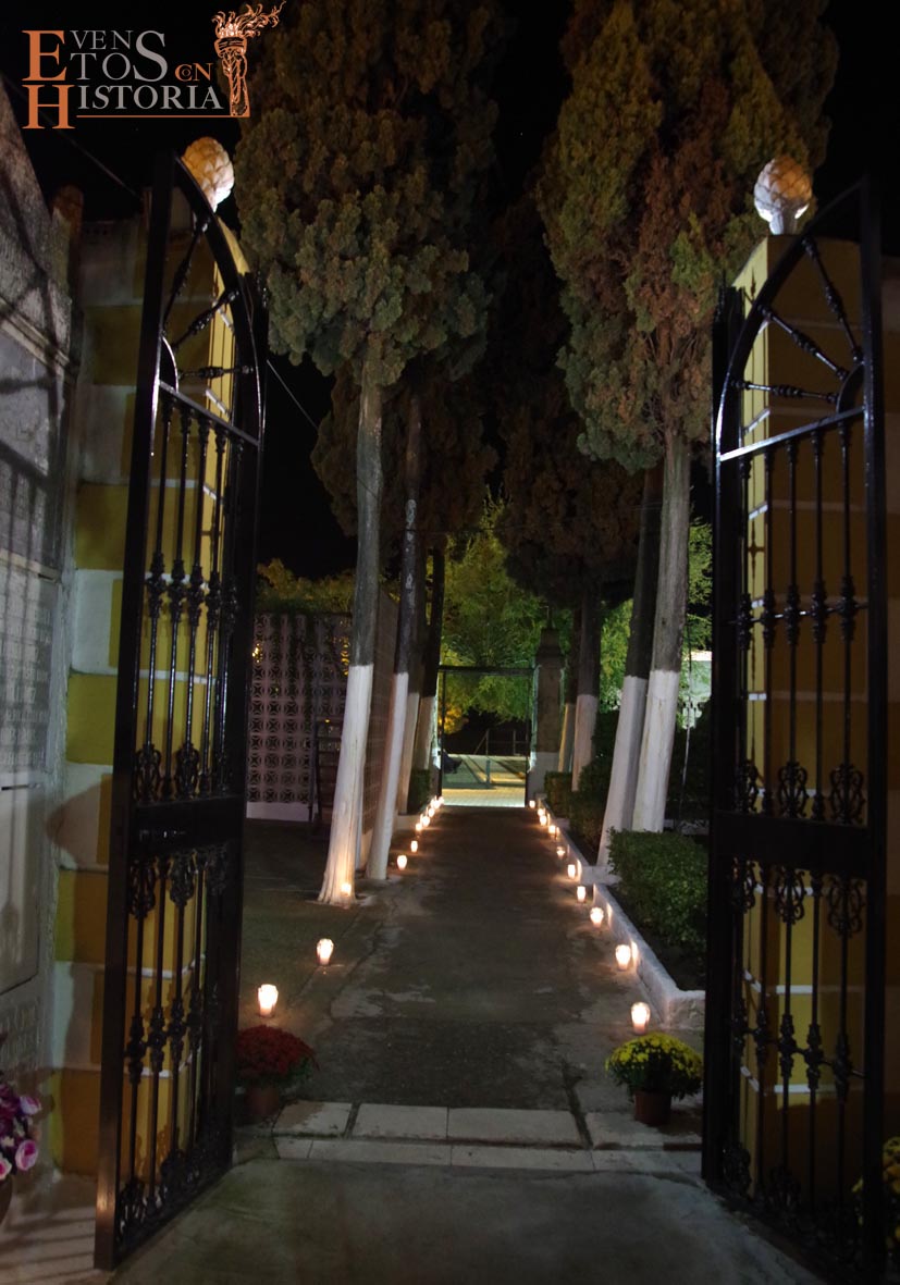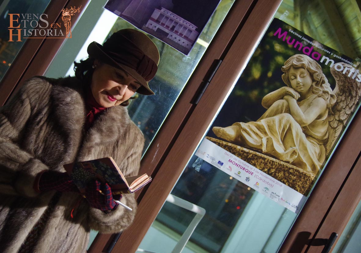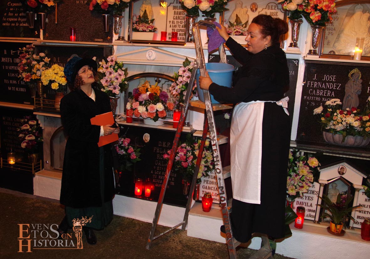 Continúa el recorrido en una atmósfera mágica entre tenues luces de velas que alumbran los nichos y Dolores «la Santera» irrumpe con su mensaje que habla de tradición en el mes de Todos los Santos. A pocos metros, esperaba en su silla «la maestra», Mª Carmen Corpas. La encontramos ensimismada eligiendo a los actores para su próxima obra de teatro. Cuando vio a los visitantes, les contó su gran pasión, la enseñanza a niños de párvulos que marcaría su vida y la de muchos monturqueños que aún hoy la recuerdan con cariño.