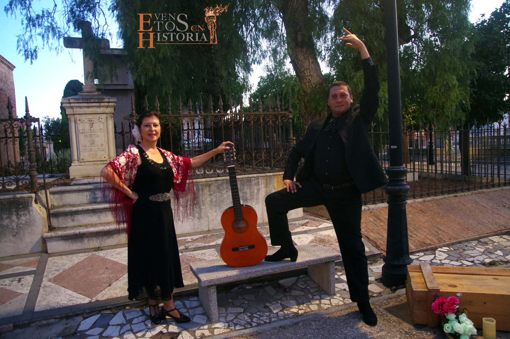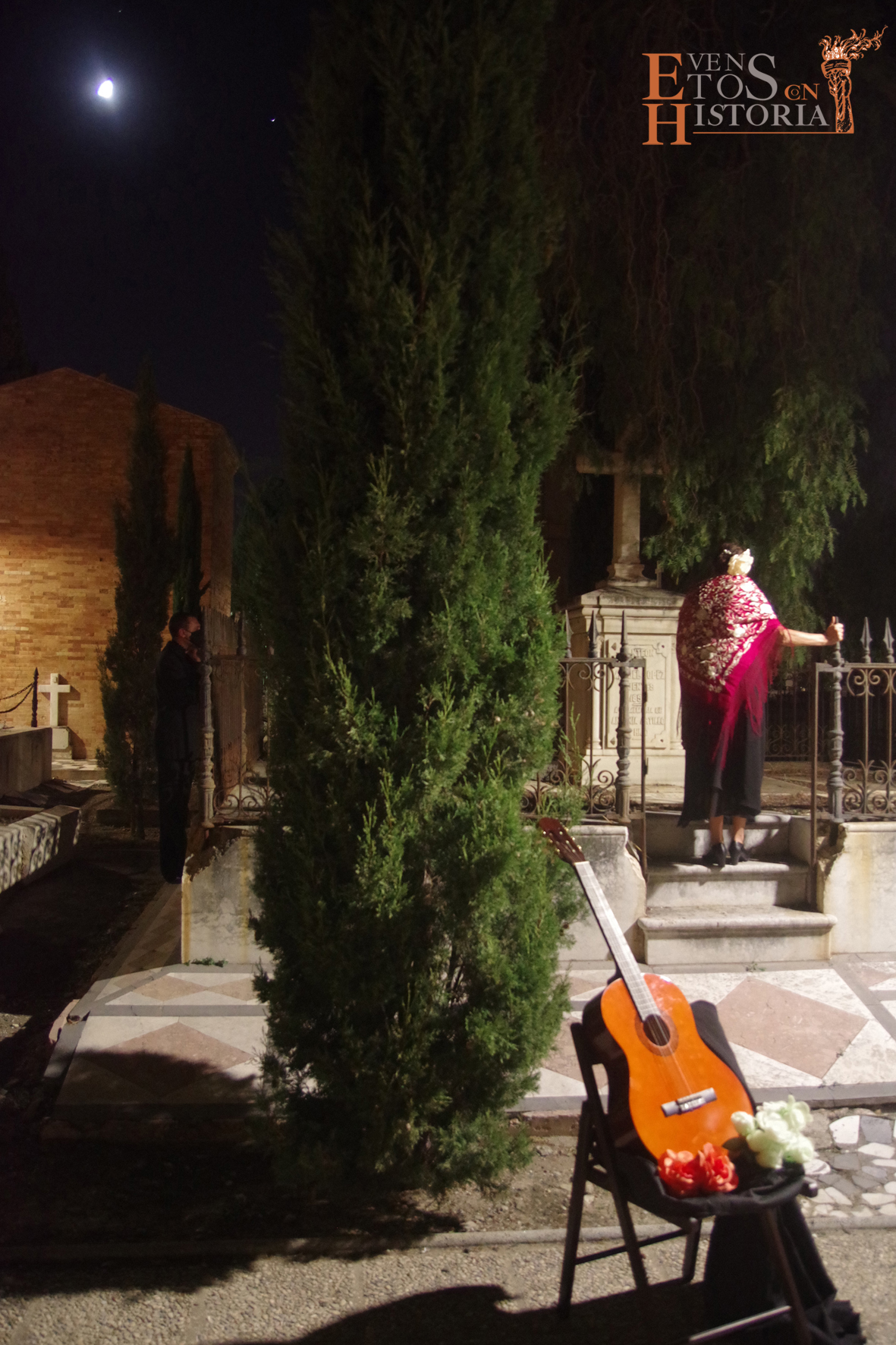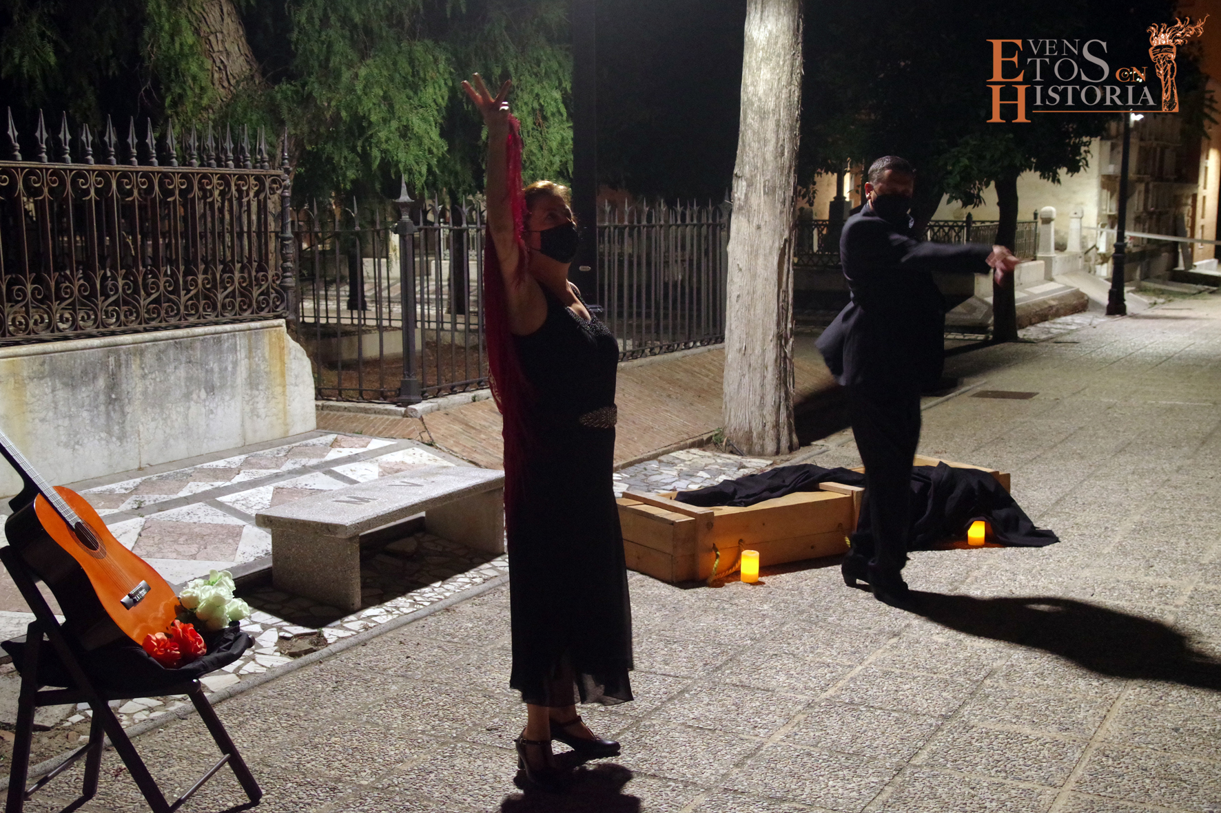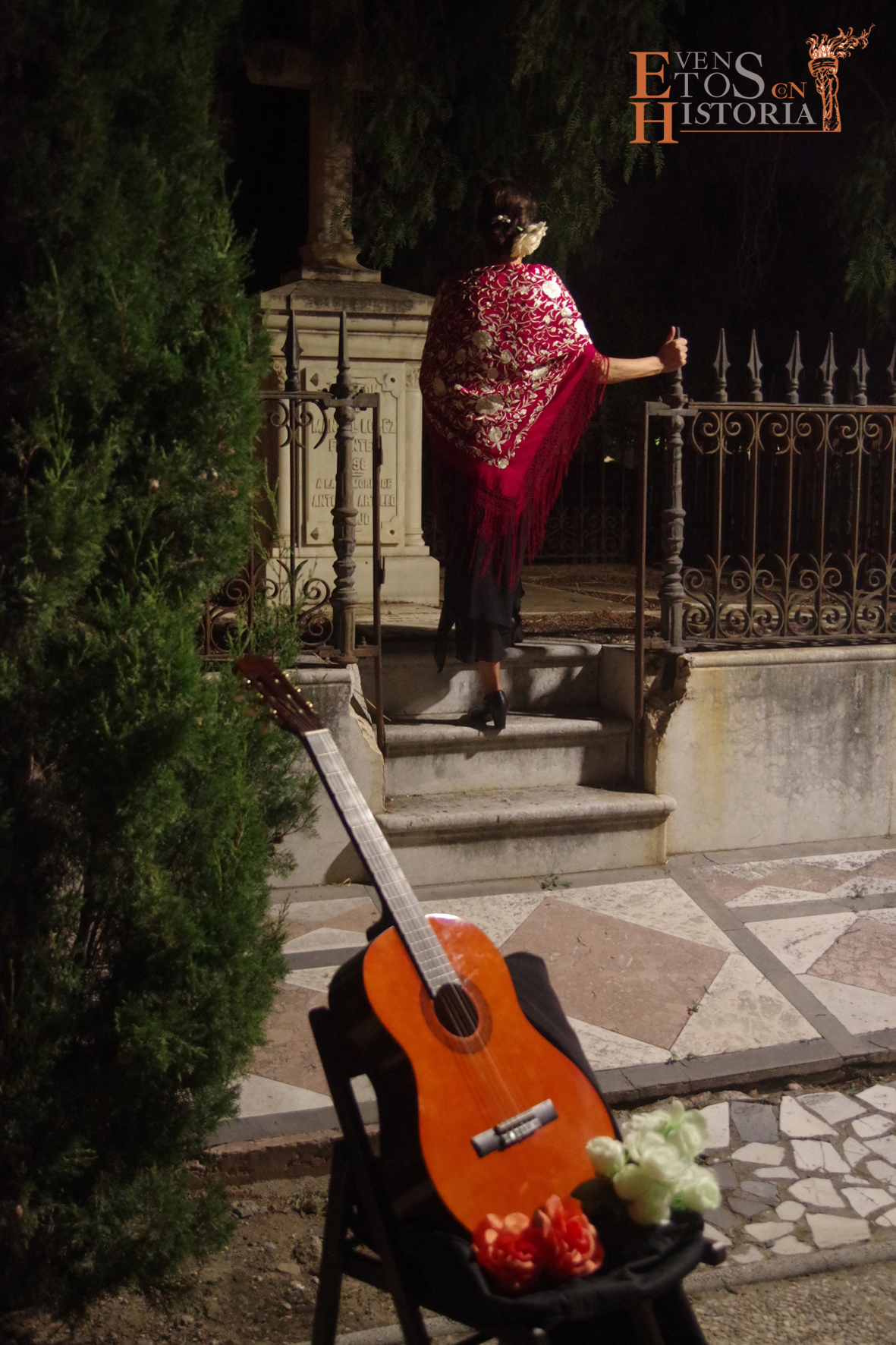 En esta velada de otoño vivimos el romanticismo de José de Espronceda con su Canción a la Muerte. También acudió fiel a su cita, él, Salvador Rueda, morador del cementerio junto a otros ilustres. Una batalla y dos nombres: Quevedo y Góngora, dos máximos exponentes del Siglo de Oro de nuestras letras, dejaron boquiabiertos al personal con el grado sumo al que llevaron la lengua castellana en sus admirables sonetos. Juan Ruiz Arcipreste de Hita, lejos de hablarnos de la muerte tan presente en el medievo, nos deleitó con unos versos de su Libro del Buen Amor, Elogio a la Mujer Chiquita. Y terminamos la noche en un emblemático punto, el Café de Chinitas. El espíritu de Lorca embrujó al público en la actuación final flamenca que adornaba su mítico poema.