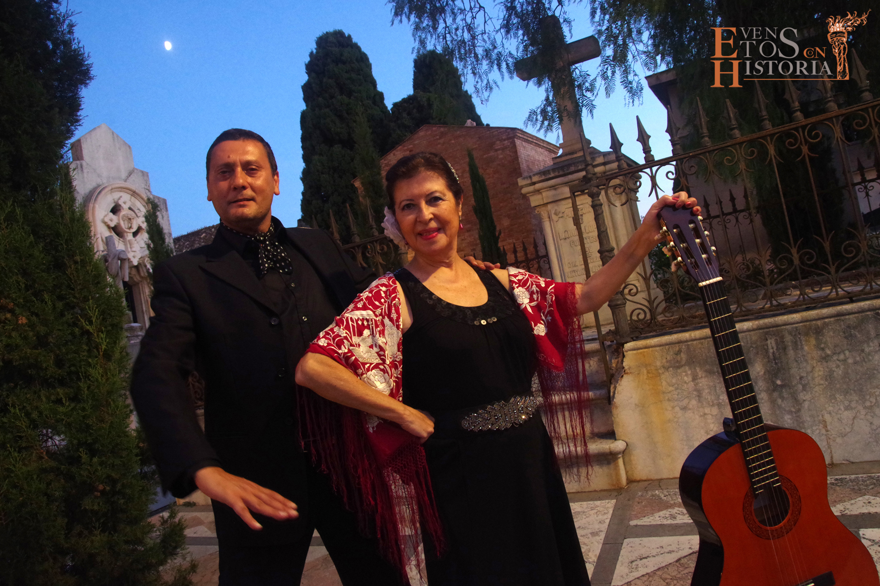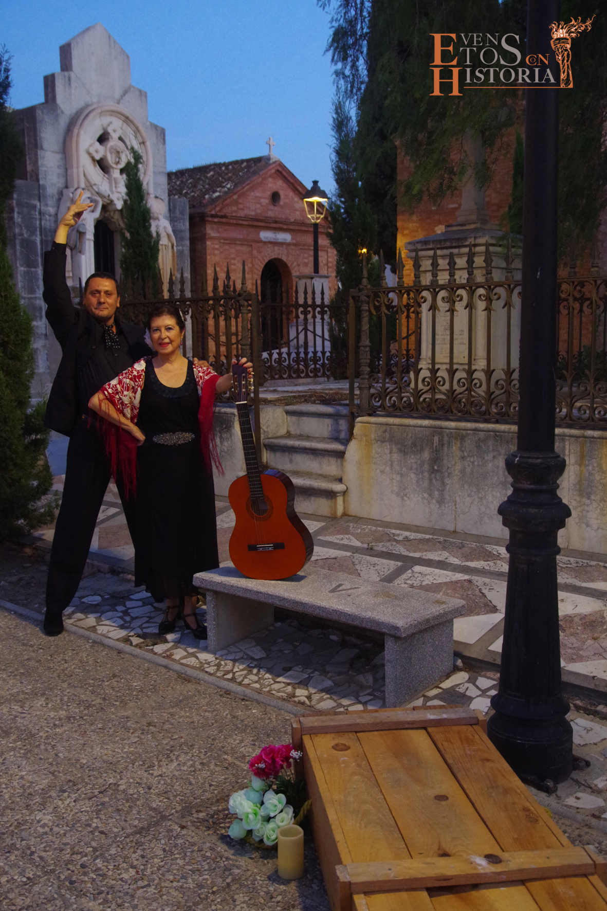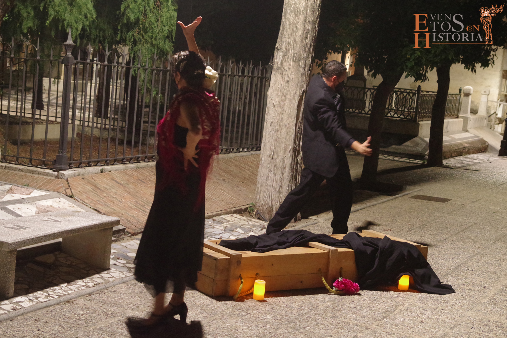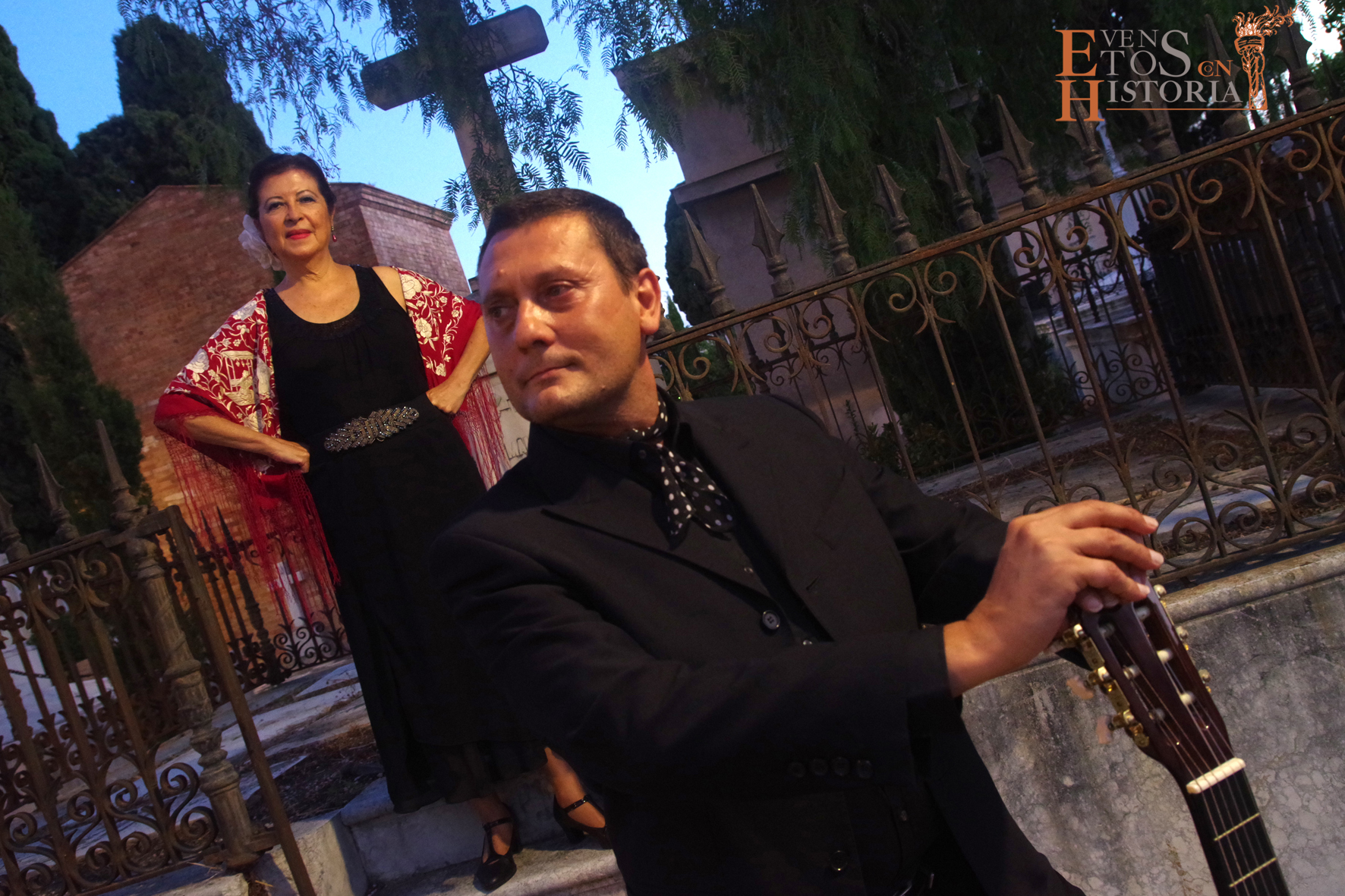 En esta velada de otoño vivimos el romanticismo de José de Espronceda con su Canción a la Muerte. También acudió fiel a su cita, él, Salvador Rueda, morador del cementerio junto a otros ilustres. Una batalla y dos nombres: Quevedo y Góngora, dos máximos exponentes del Siglo de Oro de nuestras letras, dejaron boquiabiertos al personal con el grado sumo al que llevaron la lengua castellana en sus admirables sonetos. Juan Ruiz Arcipreste de Hita, lejos de hablarnos de la muerte tan presente en el medievo, nos deleitó con unos versos de su Libro del Buen Amor, Elogio a la Mujer Chiquita. Y terminamos la noche en un emblemático punto, el Café de Chinitas. El espíritu de Lorca embrujó al público en la actuación final flamenca que adornaba su mítico poema.