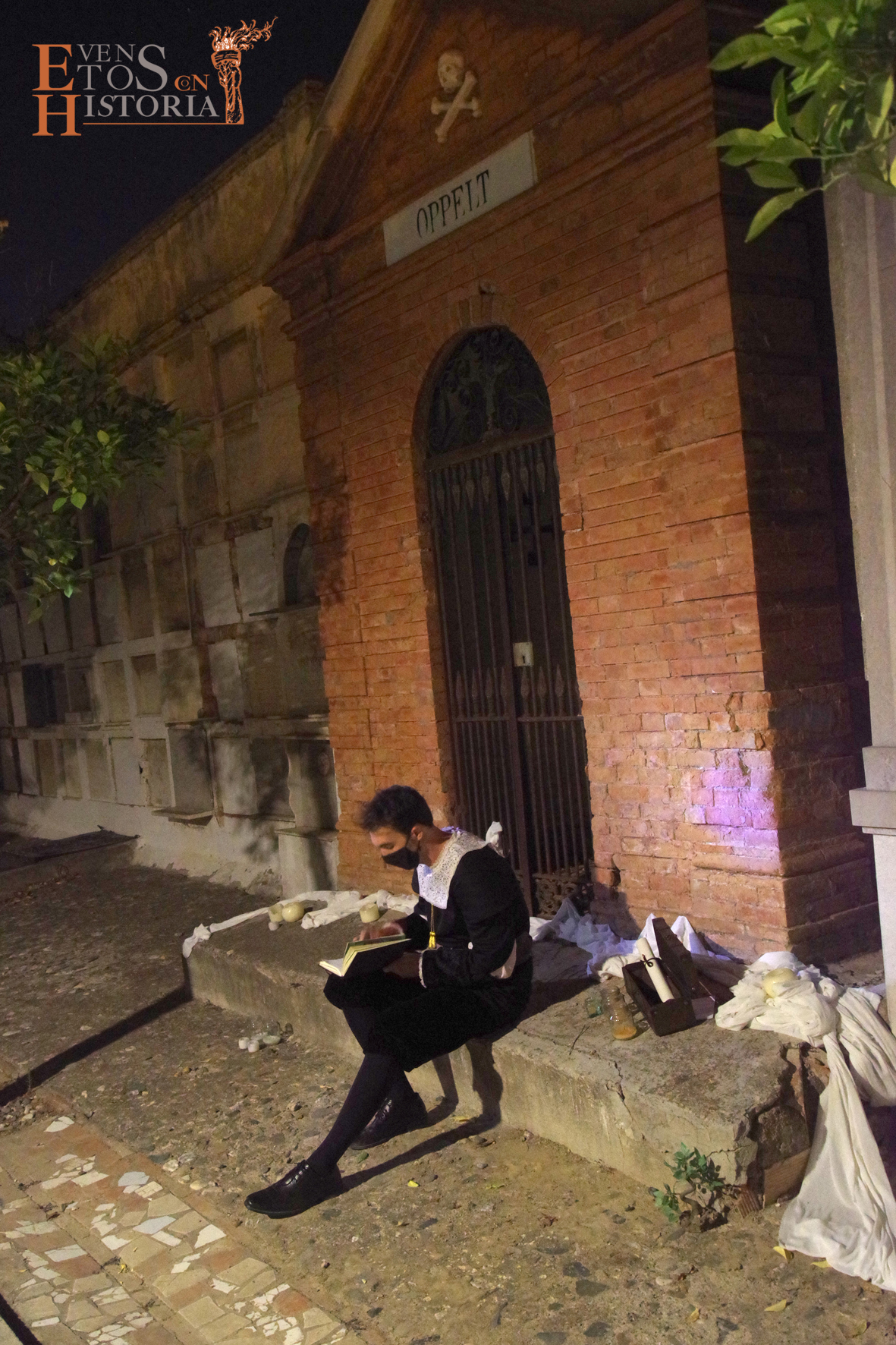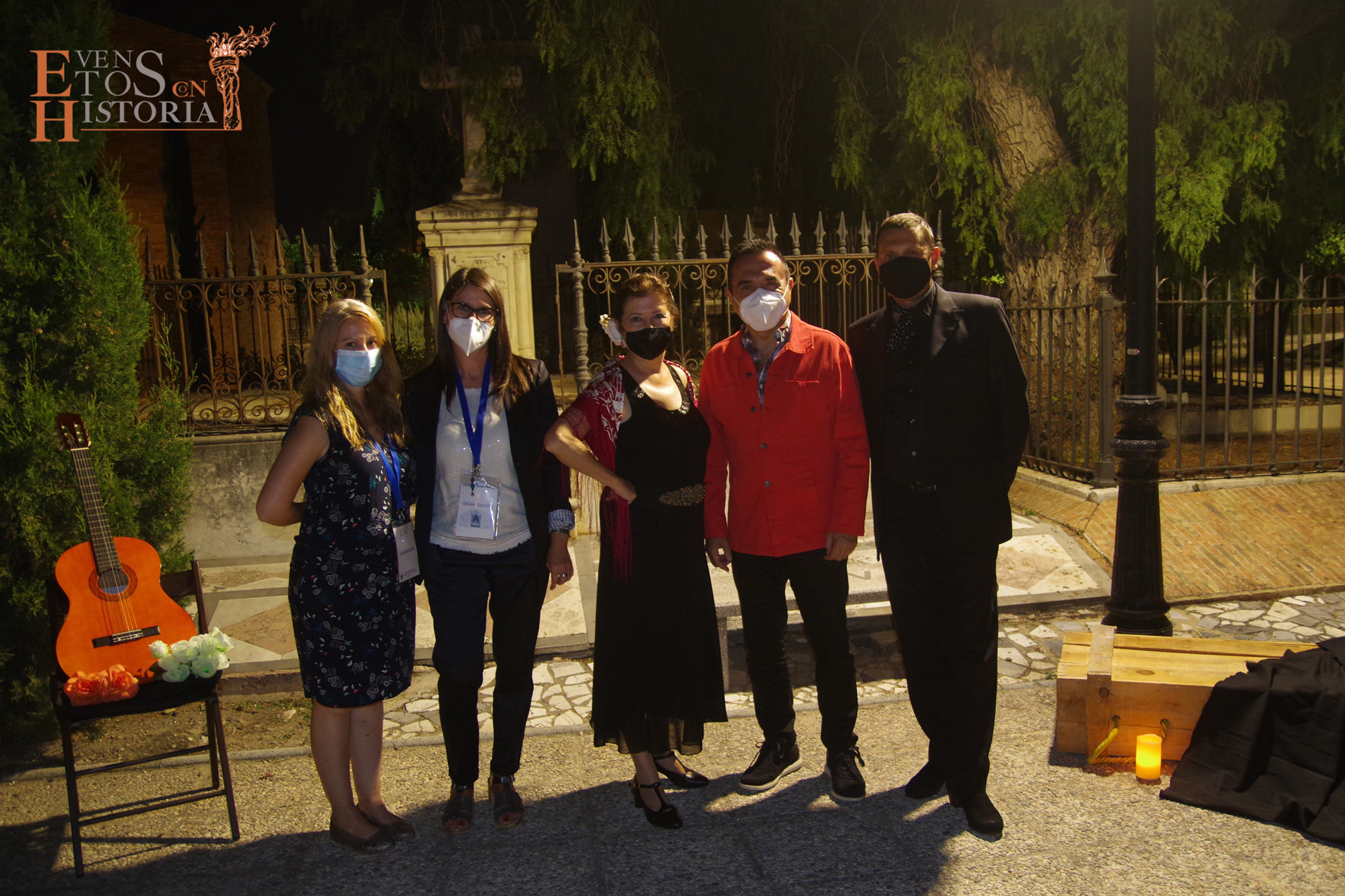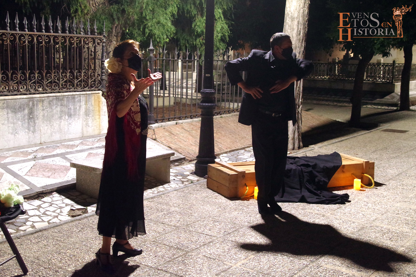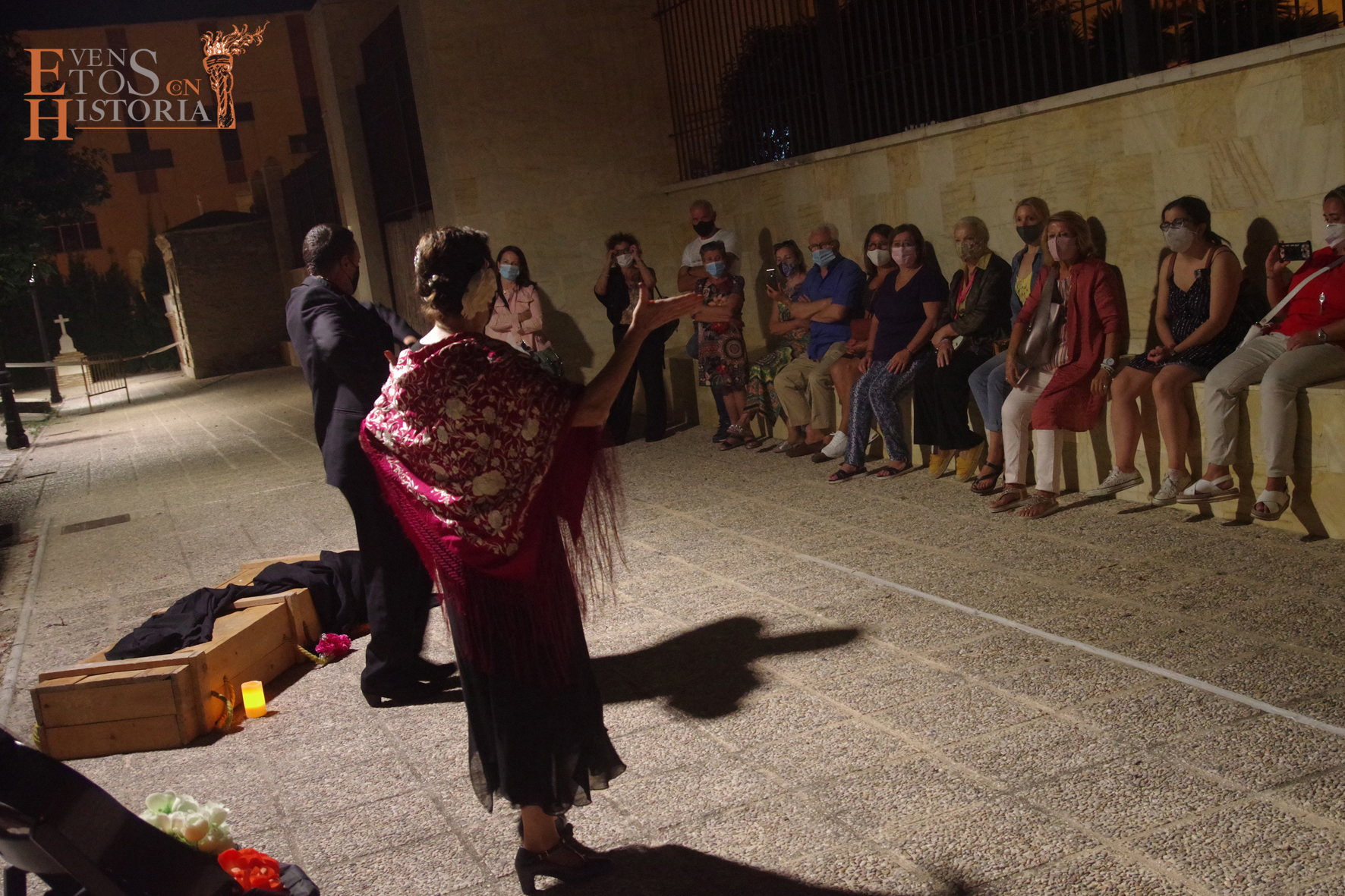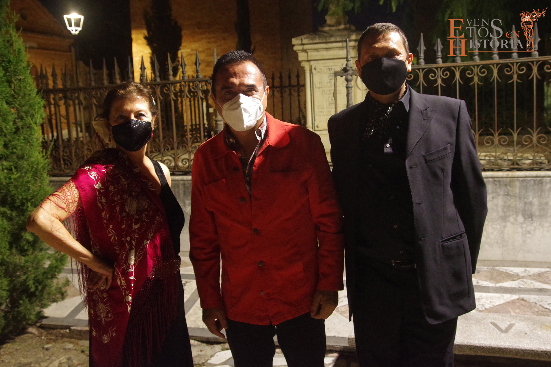 En esta velada de otoño vivimos el romanticismo de José de Espronceda con su Canción a la Muerte. También acudió fiel a su cita, él, Salvador Rueda, morador del cementerio junto a otros ilustres. Una batalla y dos nombres: Quevedo y Góngora, dos máximos exponentes del Siglo de Oro de nuestras letras, dejaron boquiabiertos al personal con el grado sumo al que llevaron la lengua castellana en sus admirables sonetos. Juan Ruiz Arcipreste de Hita, lejos de hablarnos de la muerte tan presente en el medievo, nos deleitó con unos versos de su Libro del Buen Amor, Elogio a la Mujer Chiquita. Y terminamos la noche en un emblemático punto, el Café de Chinitas. El espíritu de Lorca embrujó al público en la actuación final flamenca que adornaba su mítico poema.