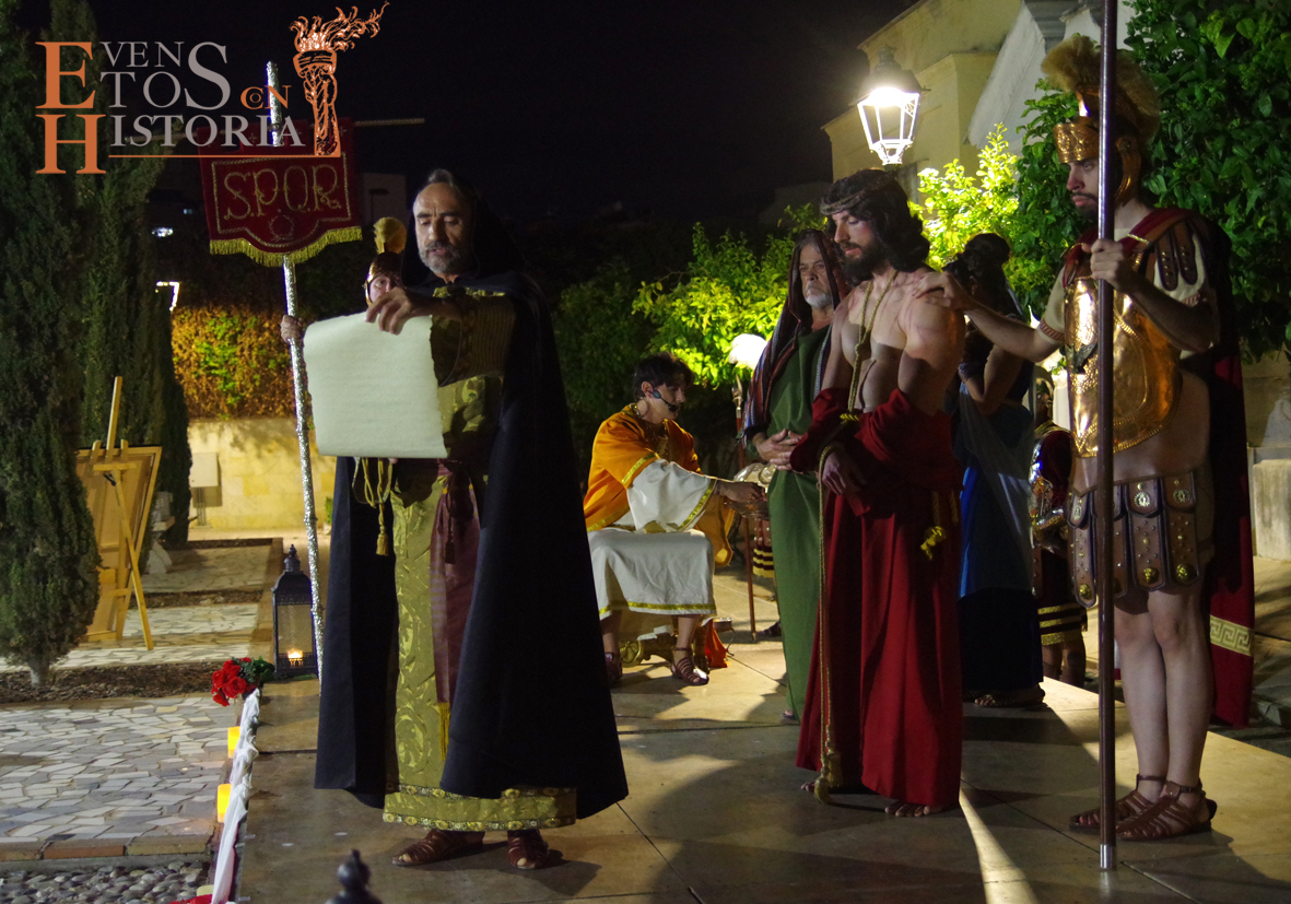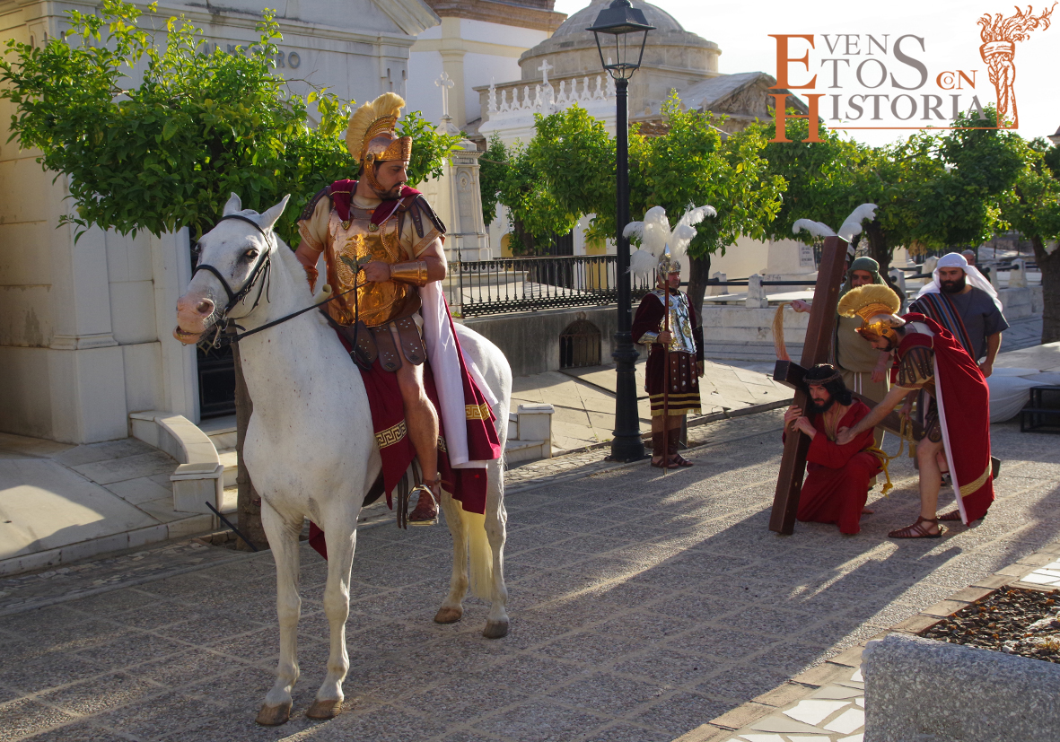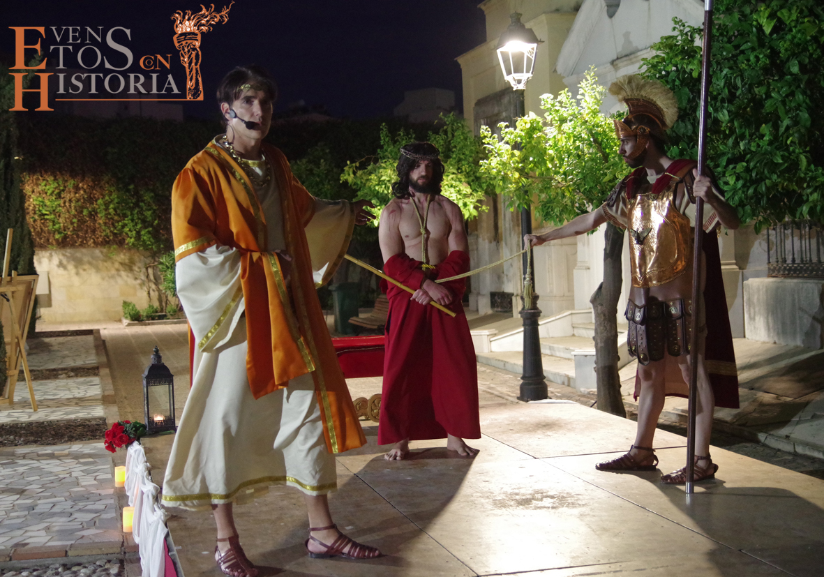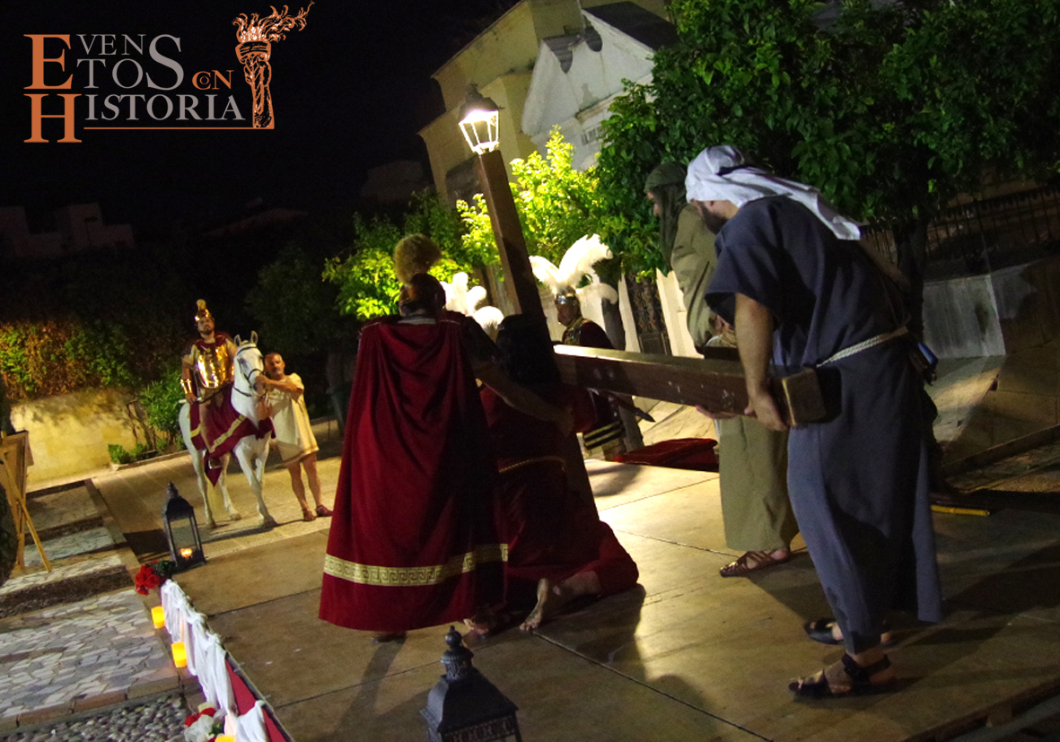 Y llegó la apoteosis. En Córdoba entraba a escena el centurión montado a caballo para recoger la sentencia de Pilatos. Los sayones entraban con la cruz para ponérsela al hombro al nazareno. Entran los dos ladrones, Dimas y Gestas. Comienza la comitiva en su caminar hacia el Calvario acompañada por la guardia romana, desde el punto del escenario hasta metros más allá donde se perdía a lo lejos el varón de dolores entre tumbas y nichos que preludiaban su muerte.