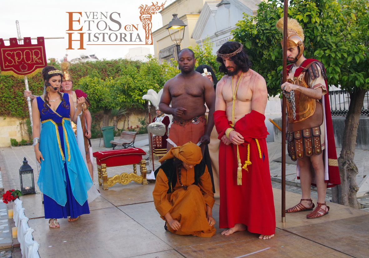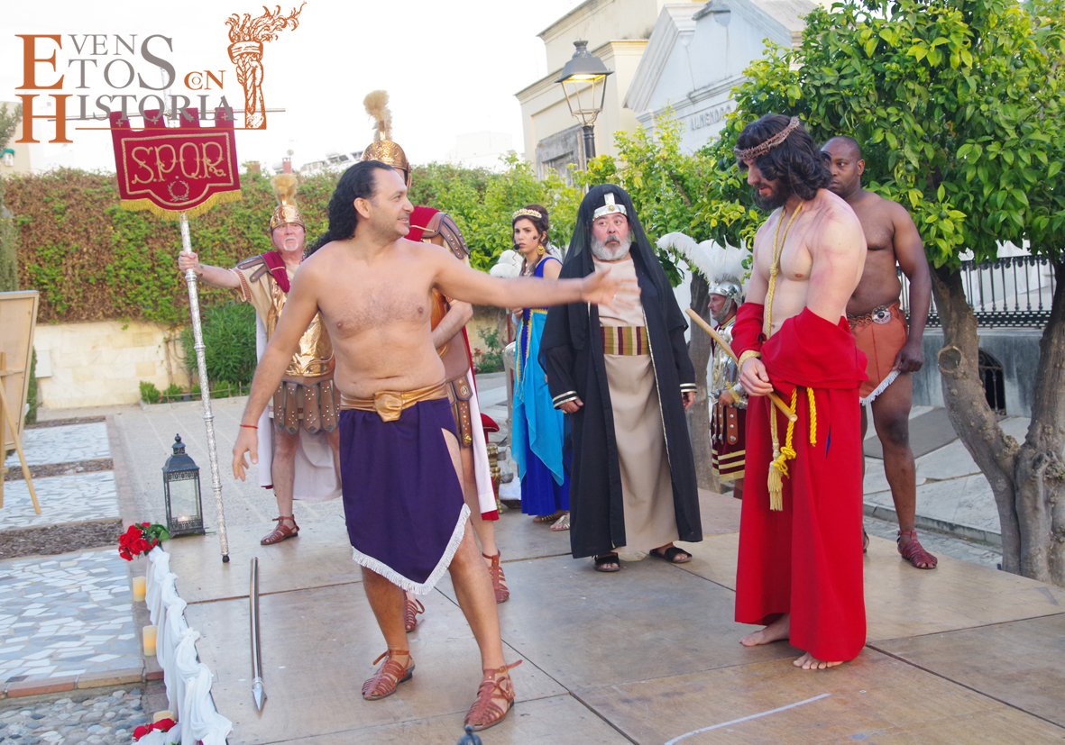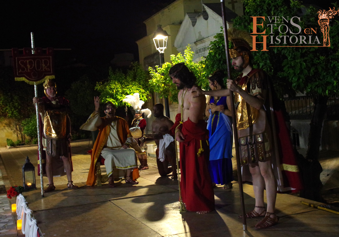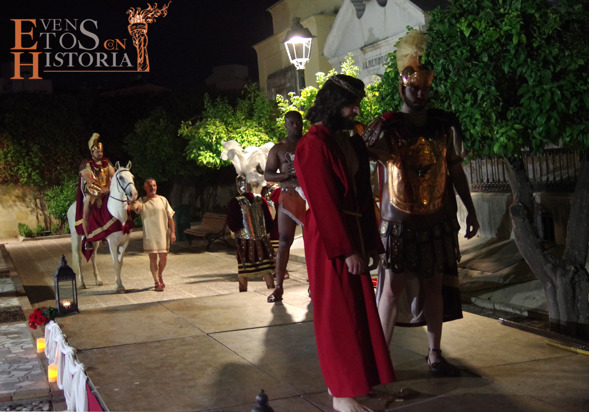 Y llegó la apoteosis. En Córdoba entraba a escena el centurión montado a caballo para recoger la sentencia de Pilatos. Los sayones entraban con la cruz para ponérsela al hombro al nazareno. Entran los dos ladrones, Dimas y Gestas. Comienza la comitiva en su caminar hacia el Calvario acompañada por la guardia romana, desde el punto del escenario hasta metros más allá donde se perdía a lo lejos el varón de dolores entre tumbas y nichos que preludiaban su muerte.