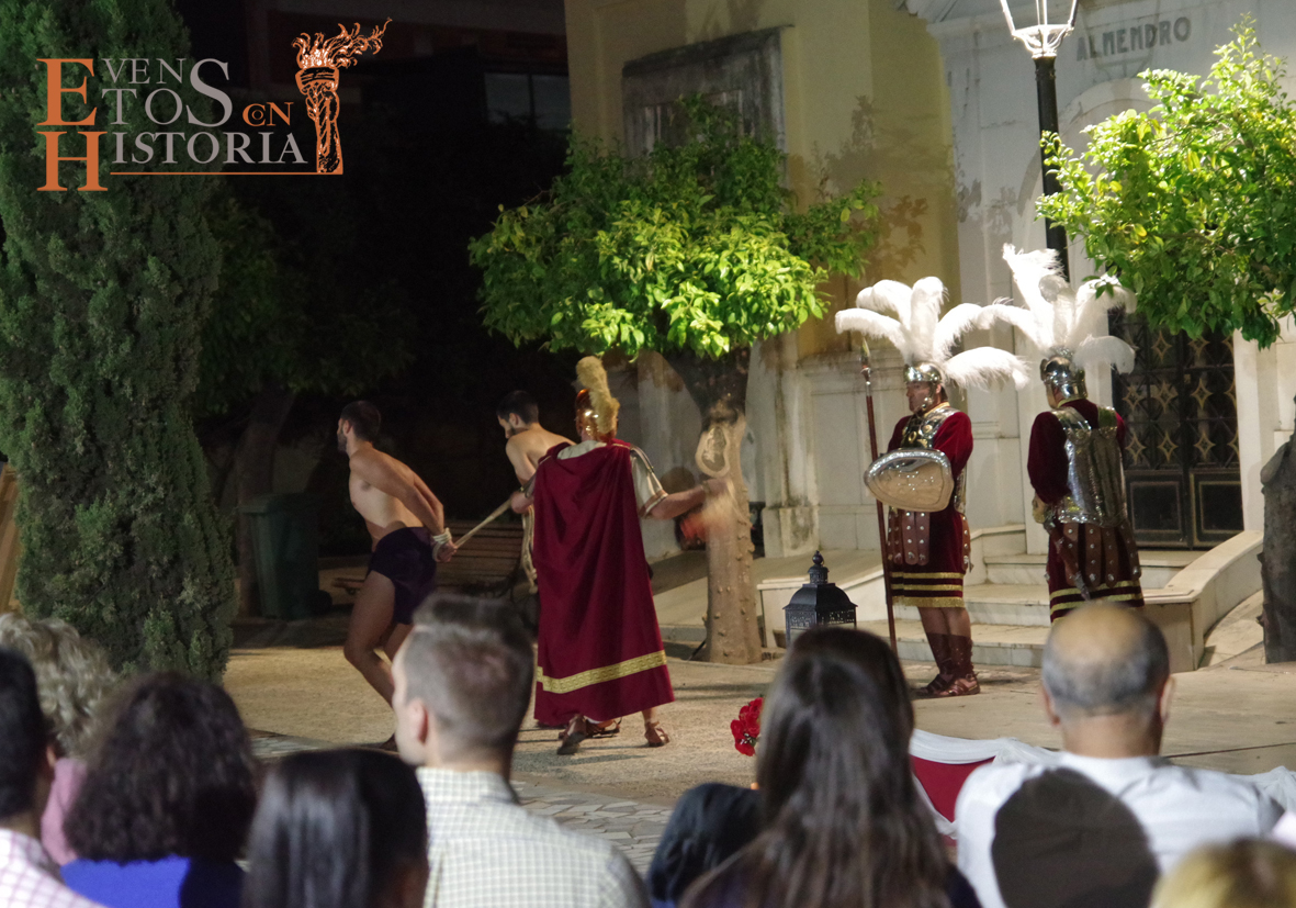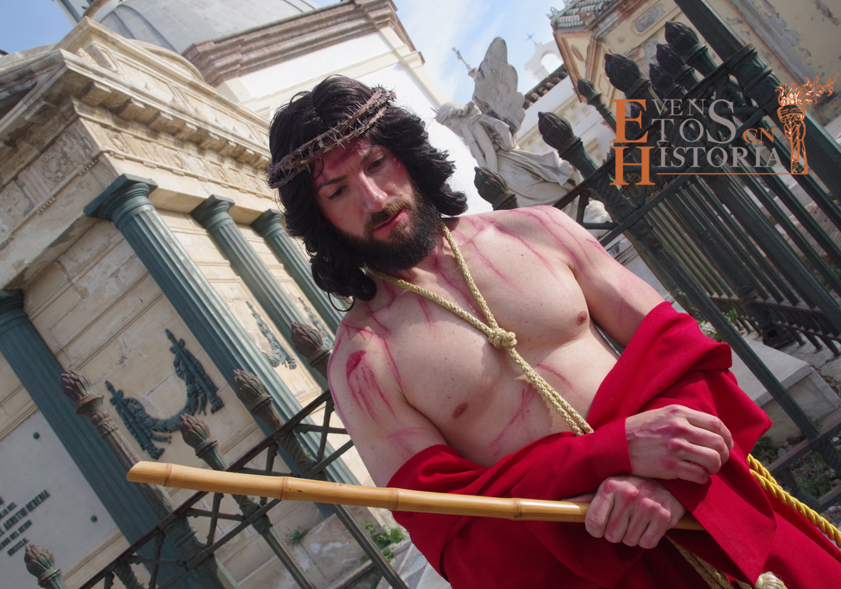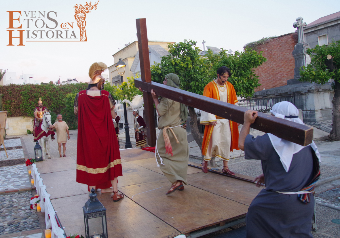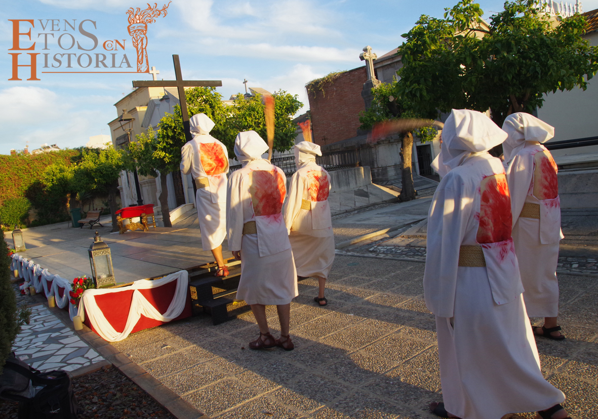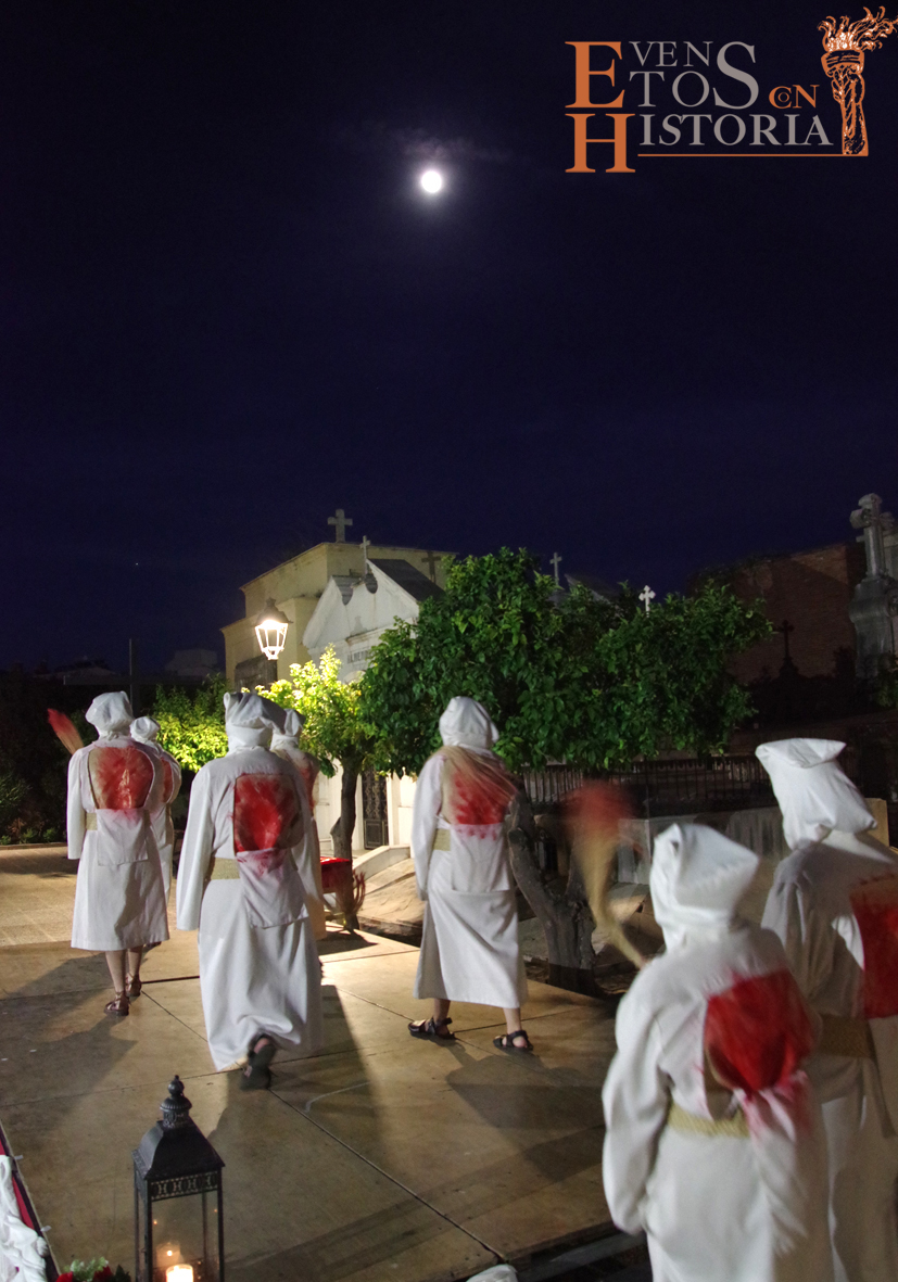 Desde la entrada al cementerio, el camino hacia el lugar de la representación estaba custodiado por soldados romanos. Ya acomodado el público, tras las palabras del presentador del acto, Juan Carlos Galeote, la procesión de un grupo de flagelantes introducía al conferenciante. Comienza su discurso y este se ve interrumpido por unas voces que suenan a lo lejos. Es imposible continuar, se baja del escenario y comienza el espectáculo. La pasión viviente de Cristo representada por vez primera en un camposanto.