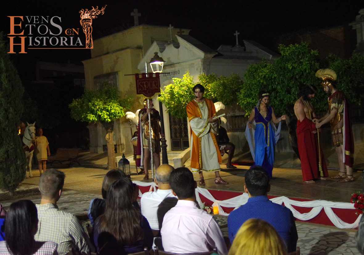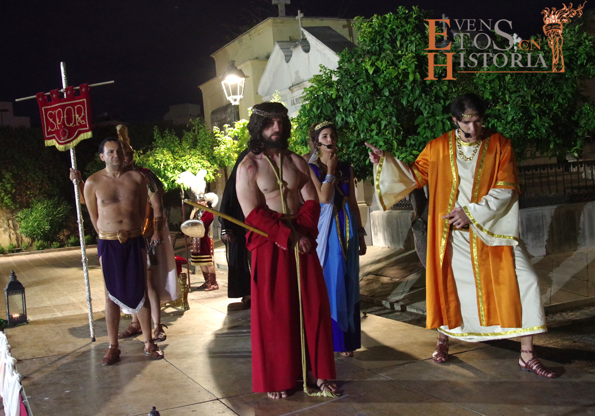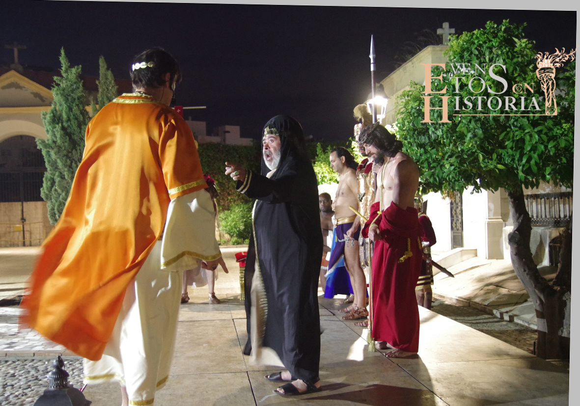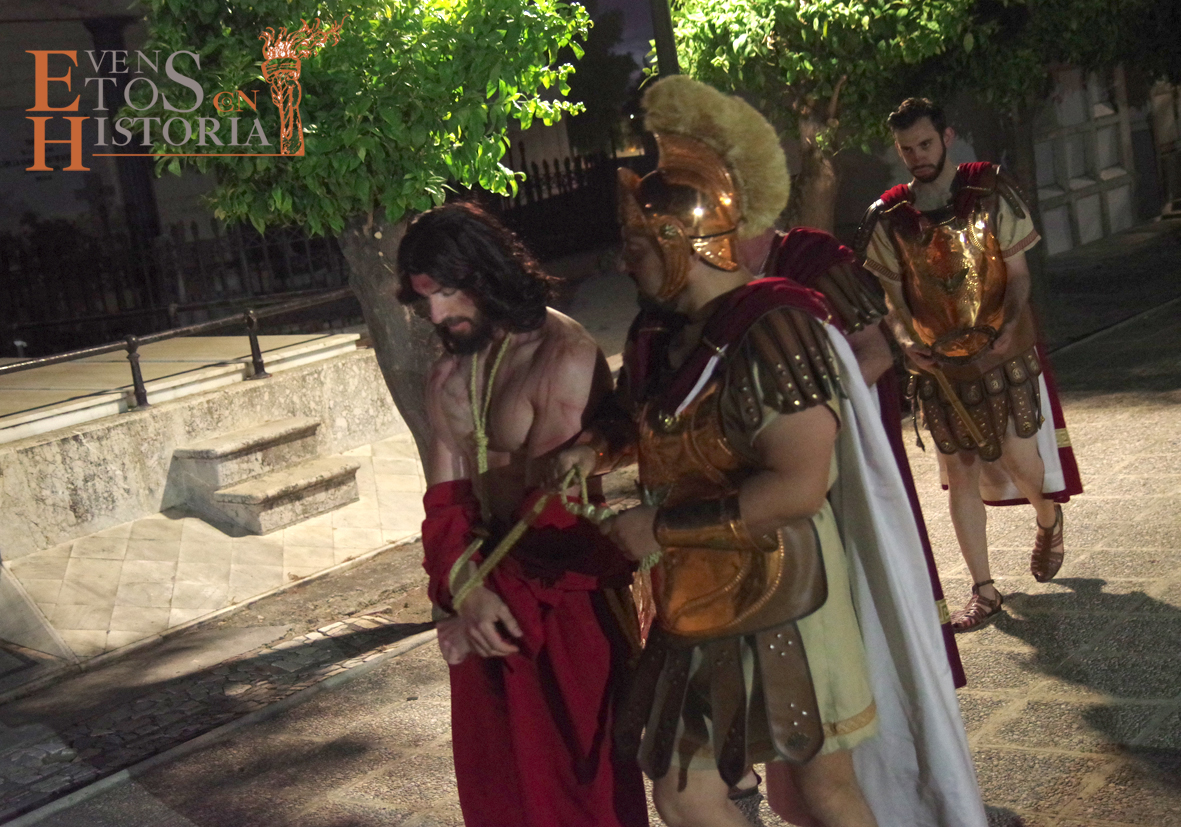 Desde la entrada al cementerio, el camino hacia el lugar de la representación estaba custodiado por soldados romanos. Ya acomodado el público, tras las palabras del presentador del acto, Juan Carlos Galeote, la procesión de un grupo de flagelantes introducía al conferenciante. Comienza su discurso y este se ve interrumpido por unas voces que suenan a lo lejos. Es imposible continuar, se baja del escenario y comienza el espectáculo. La pasión viviente de Cristo representada por vez primera en un camposanto.