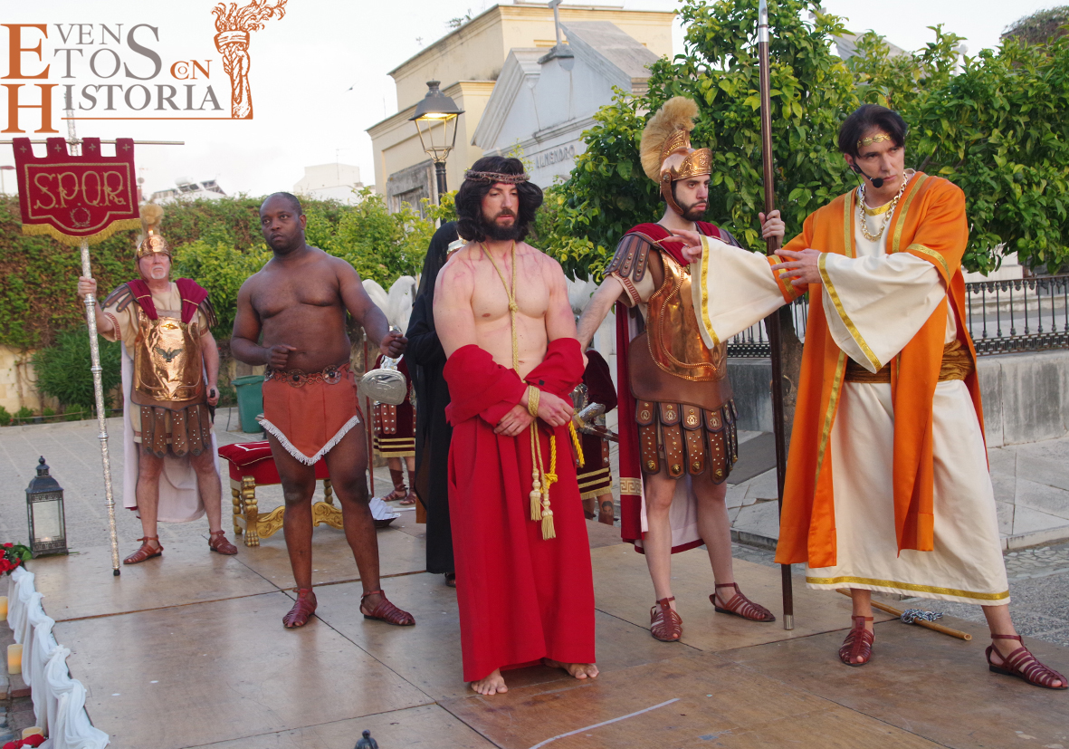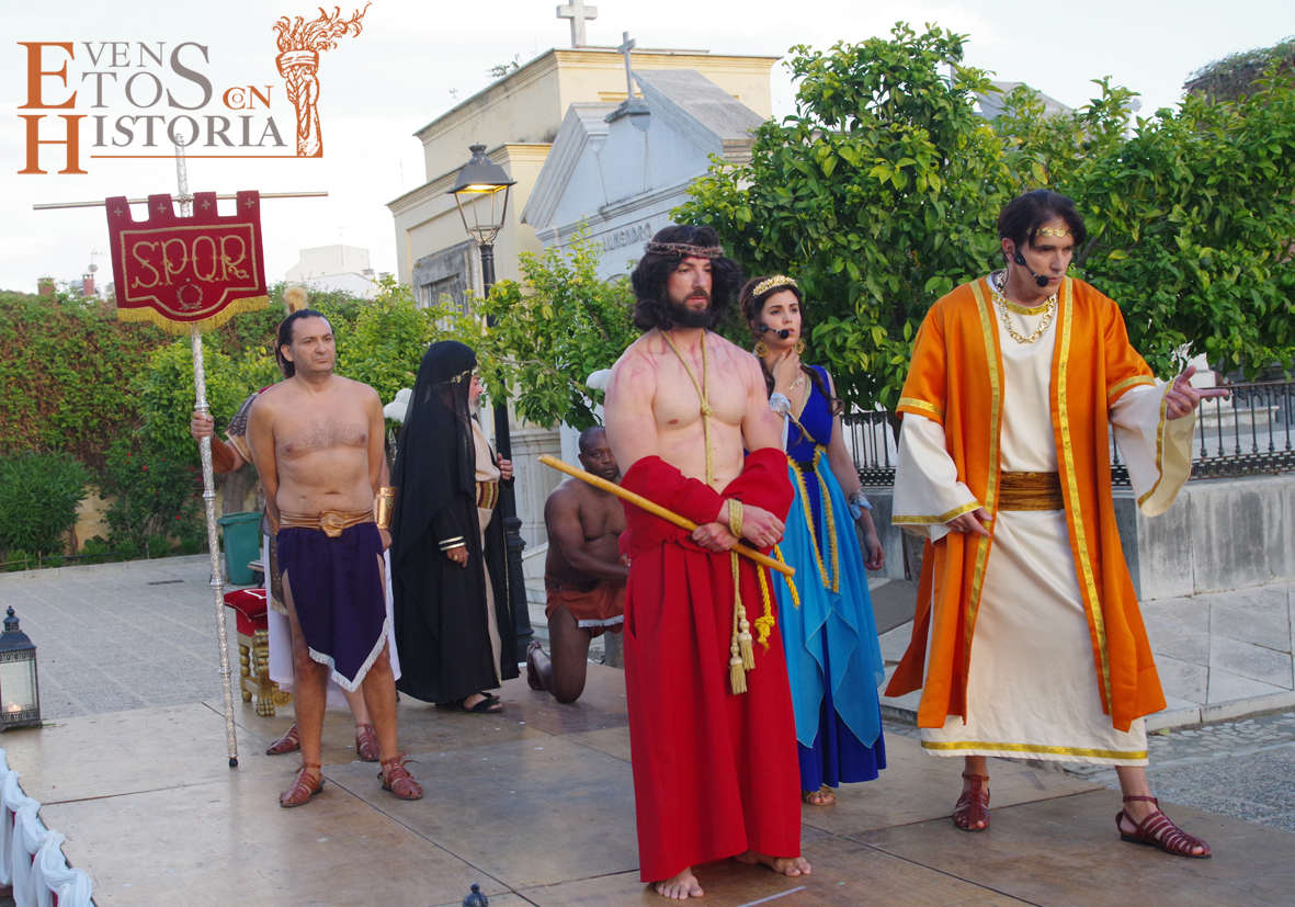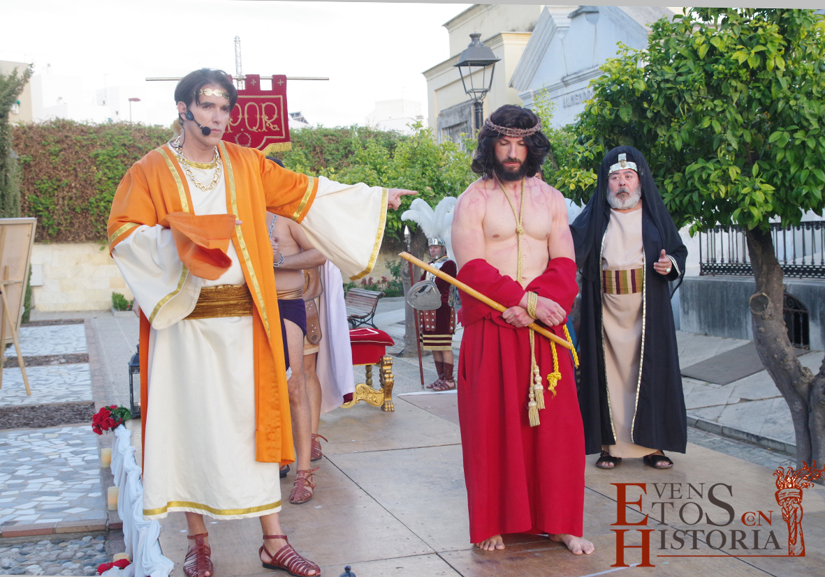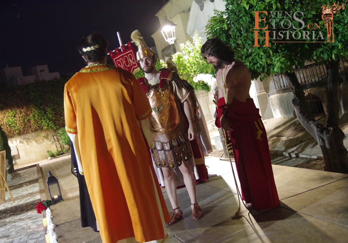 Se hizo un recorrido desde la coronación de espinas hasta el momento de la entrega de la cruz y la marcha hacia el Calvario. Se representaron los diferentes grupos escultóricos de diez localidades andaluzas cuando los personajes del auto sacramental quedaban literalmente congelados. Ya no eran de carne y hueso, eran esculturas vivientes. Eduardo así, subido en los tronos, en los pasos, nos dio una lección magistral sobre las características de cada grupo escultórico, paseando entre sus personajes y sintiendo el aliento de Pilatos o la serenidad que transmitía el Galileo con su mirada cabizbaja.