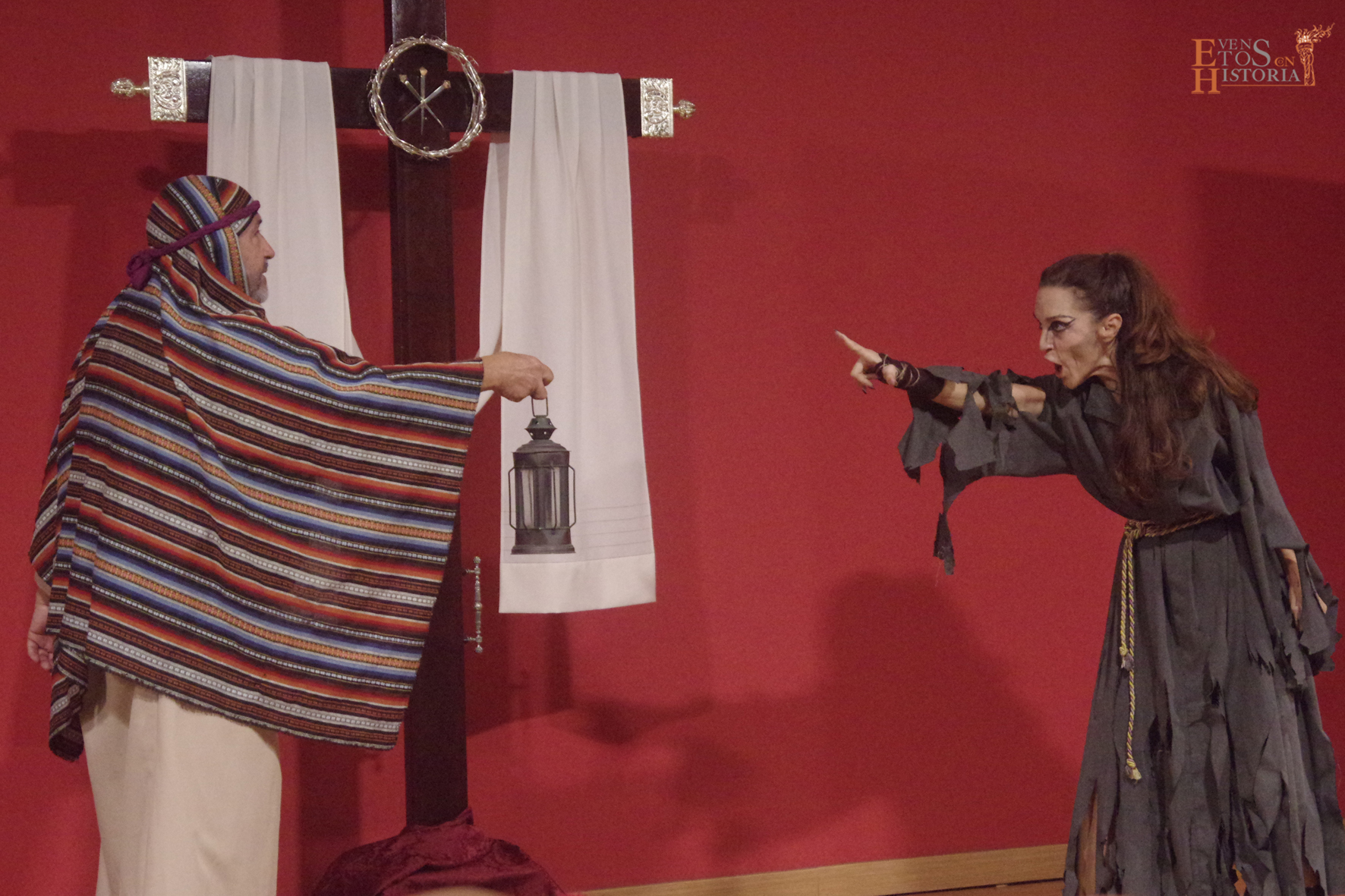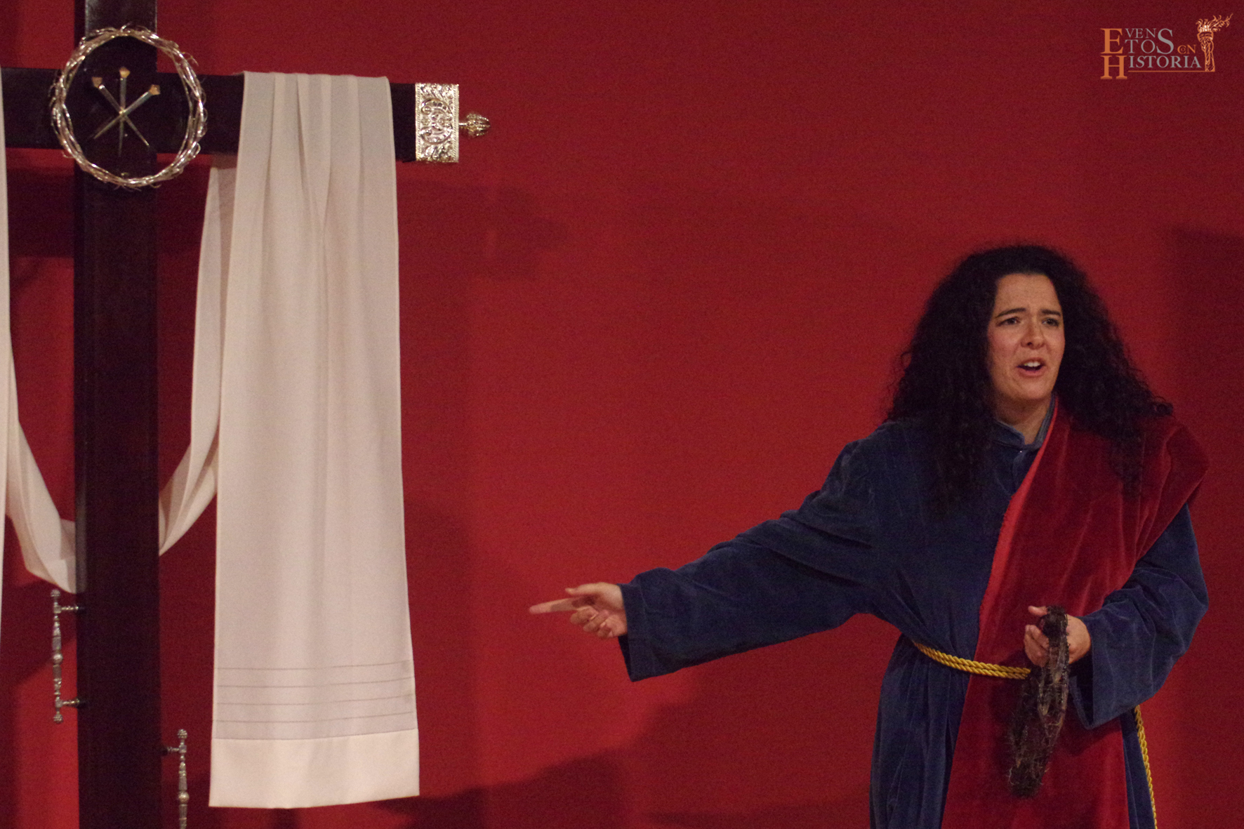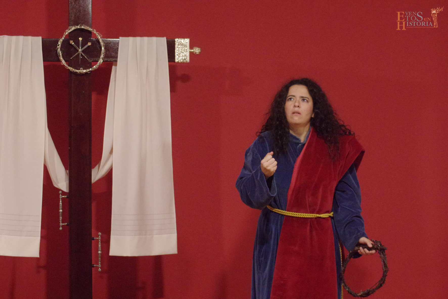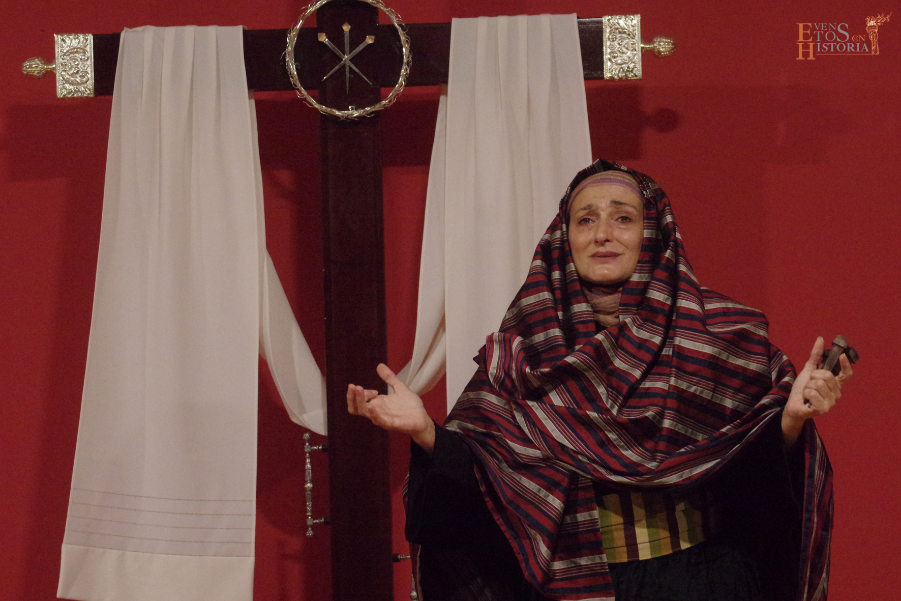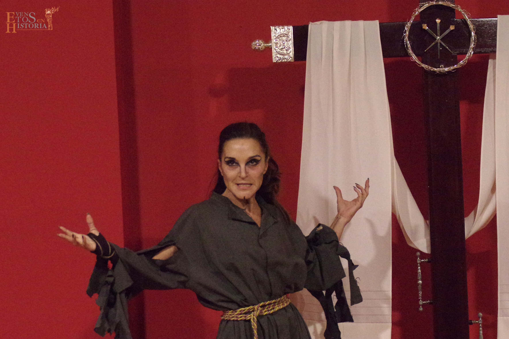 Nos trasladamos al monte Calvario ante una cruz desnuda, momentos después de la bajada de Cristo, sin nadie… todo era silencio y desolación. Y fueron entrando uno a uno cada testigo de los hechos que marcaron la historia final del Maestro introducidos por un narrador de excepción, Judá Ben Hur. Así, el público se fue envolviendo en una atmósfera indescriptible con los monólogos del soldado romano arrepentido Flavio, Nicodemo, José de Arimetea, la madre María y María Magdalena. La emoción de la sala se perturbó cuando entró él, el innombrable, el Ser de Oscuridad… con tono desafiante y arrogante mostró sus armas, su poder y casi su victoria en esta eterna batalla entre el bien y el mal.