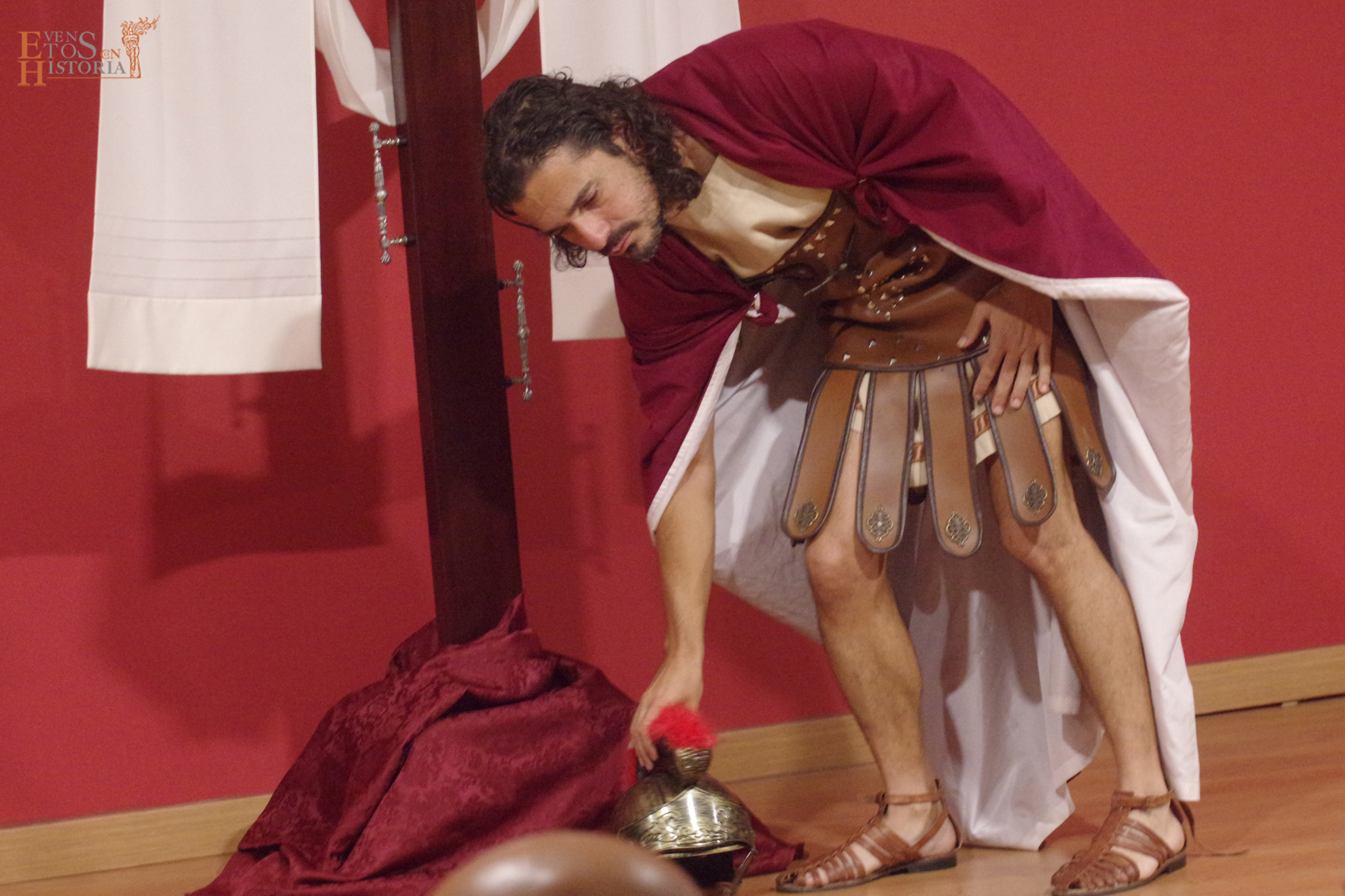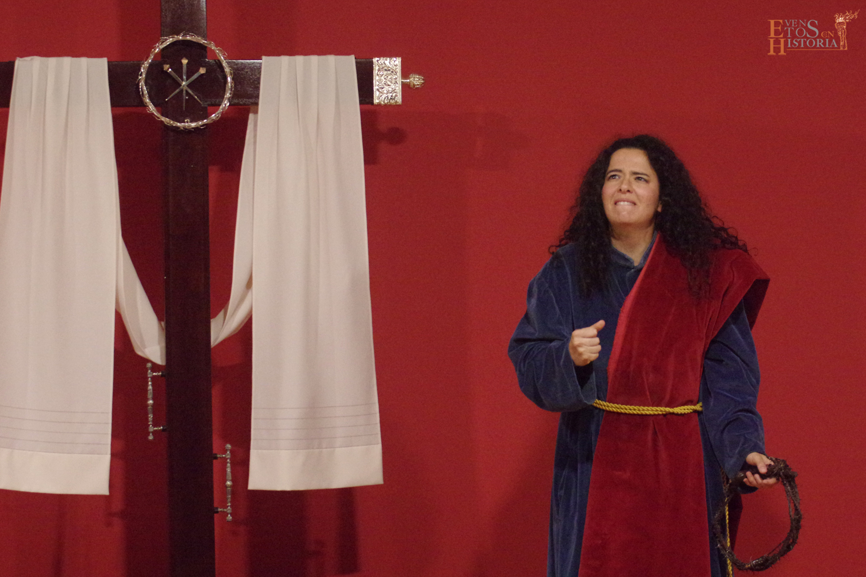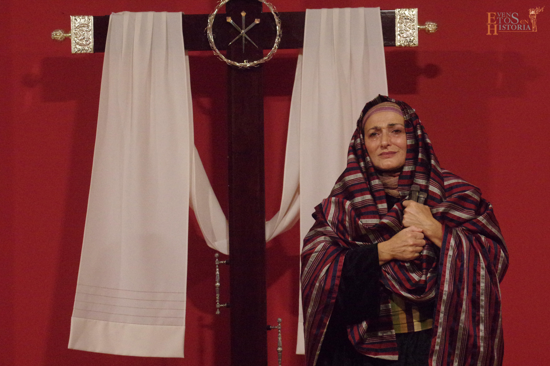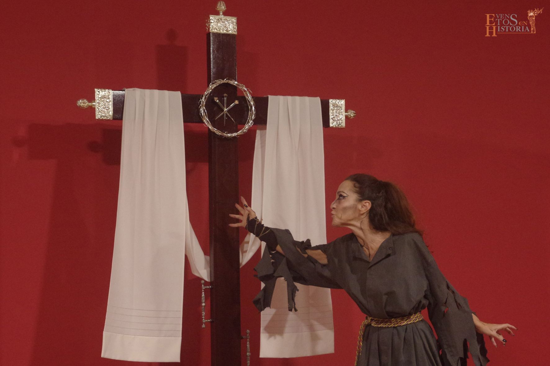 Nos trasladamos al monte Calvario ante una cruz desnuda, momentos después de la bajada de Cristo, sin nadie… todo era silencio y desolación. Y fueron entrando uno a uno cada testigo de los hechos que marcaron la historia final del Maestro introducidos por un narrador de excepción, Judá Ben Hur. Así, el público se fue envolviendo en una atmósfera indescriptible con los monólogos del soldado romano arrepentido Flavio, Nicodemo, José de Arimetea, la madre María y María Magdalena. La emoción de la sala se perturbó cuando entró él, el innombrable, el Ser de Oscuridad… con tono desafiante y arrogante mostró sus armas, su poder y casi su victoria en esta eterna batalla entre el bien y el mal.