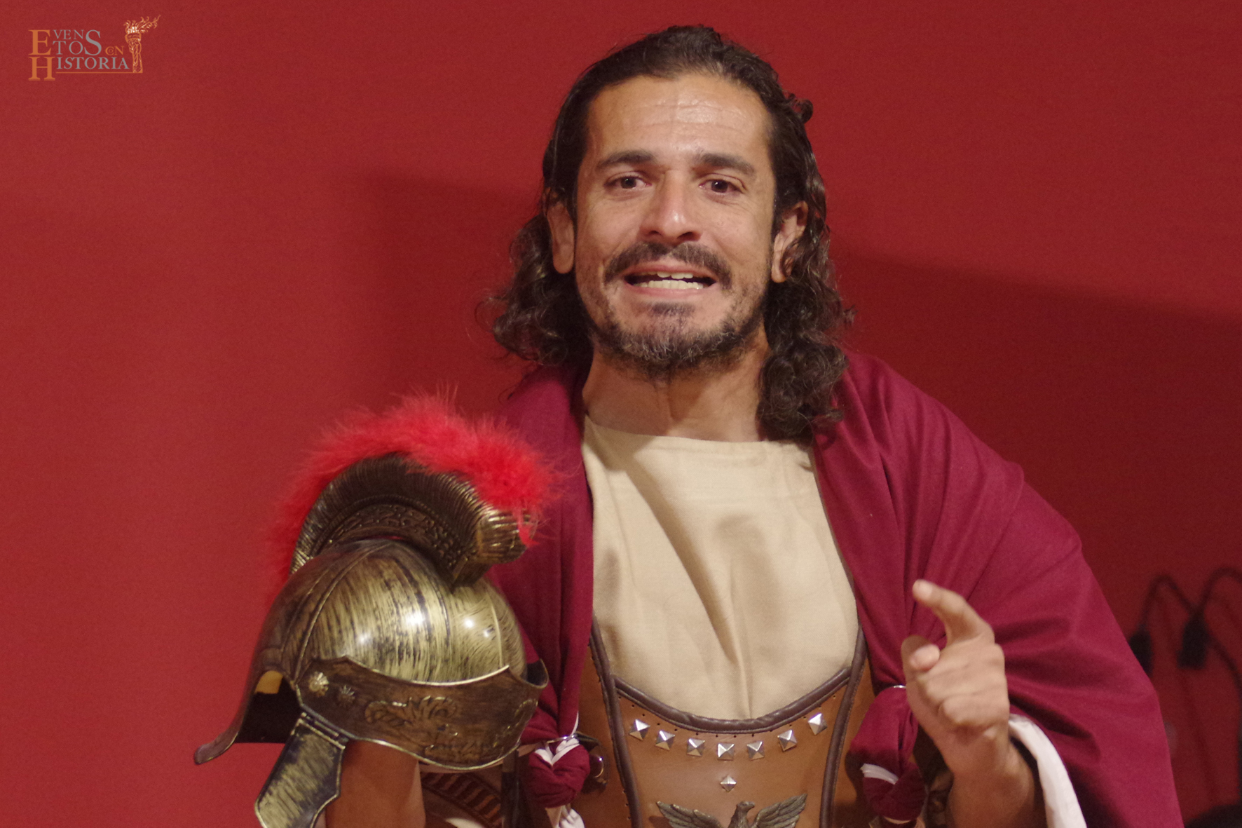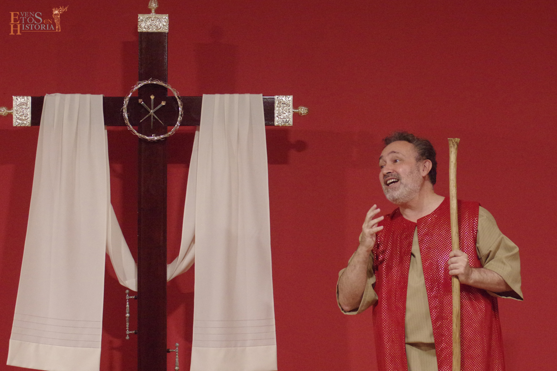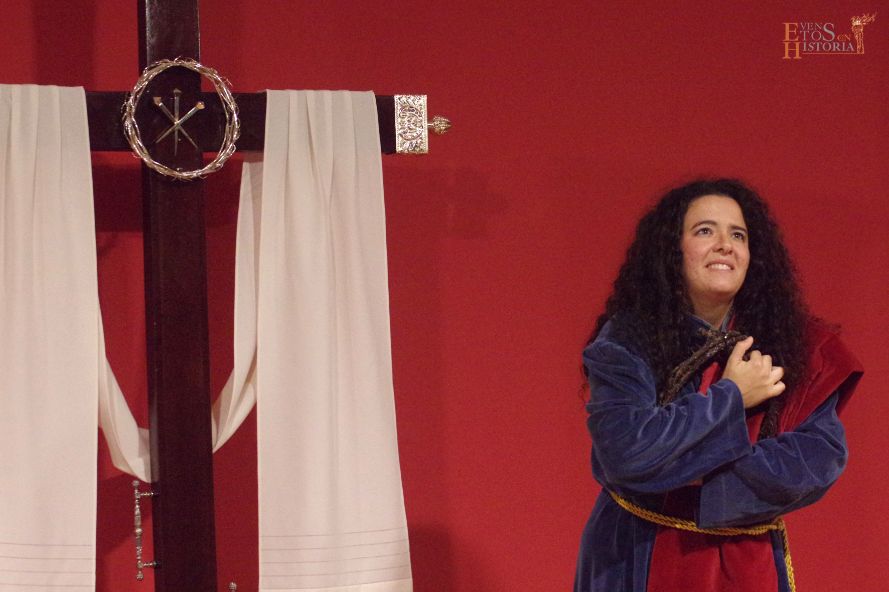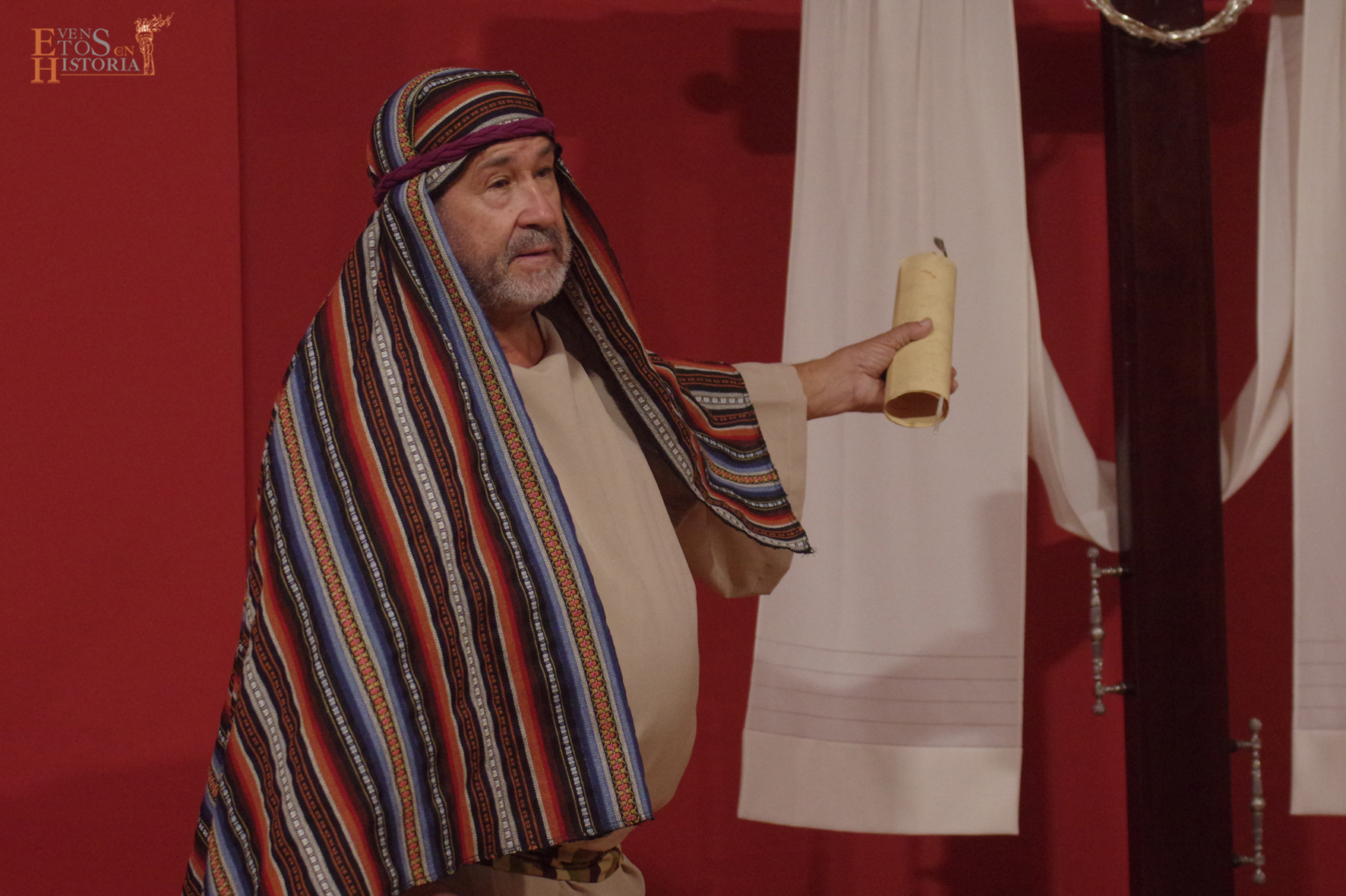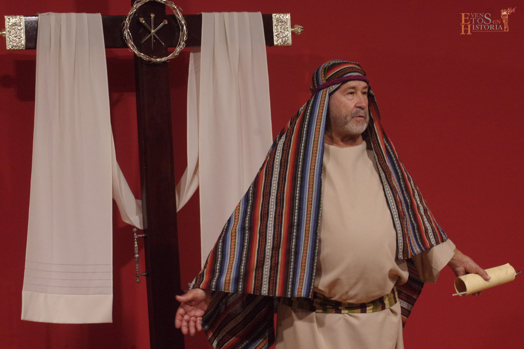 Nos trasladamos al monte Calvario ante una cruz desnuda, momentos después de la bajada de Cristo, sin nadie… todo era silencio y desolación. Y fueron entrando uno a uno cada testigo de los hechos que marcaron la historia final del Maestro introducidos por un narrador de excepción, Judá Ben Hur. Así, el público se fue envolviendo en una atmósfera indescriptible con los monólogos del soldado romano arrepentido Flavio, Nicodemo, José de Arimetea, la madre María y María Magdalena. La emoción de la sala se perturbó cuando entró él, el innombrable, el Ser de Oscuridad… con tono desafiante y arrogante mostró sus armas, su poder y casi su victoria en esta eterna batalla entre el bien y el mal.
