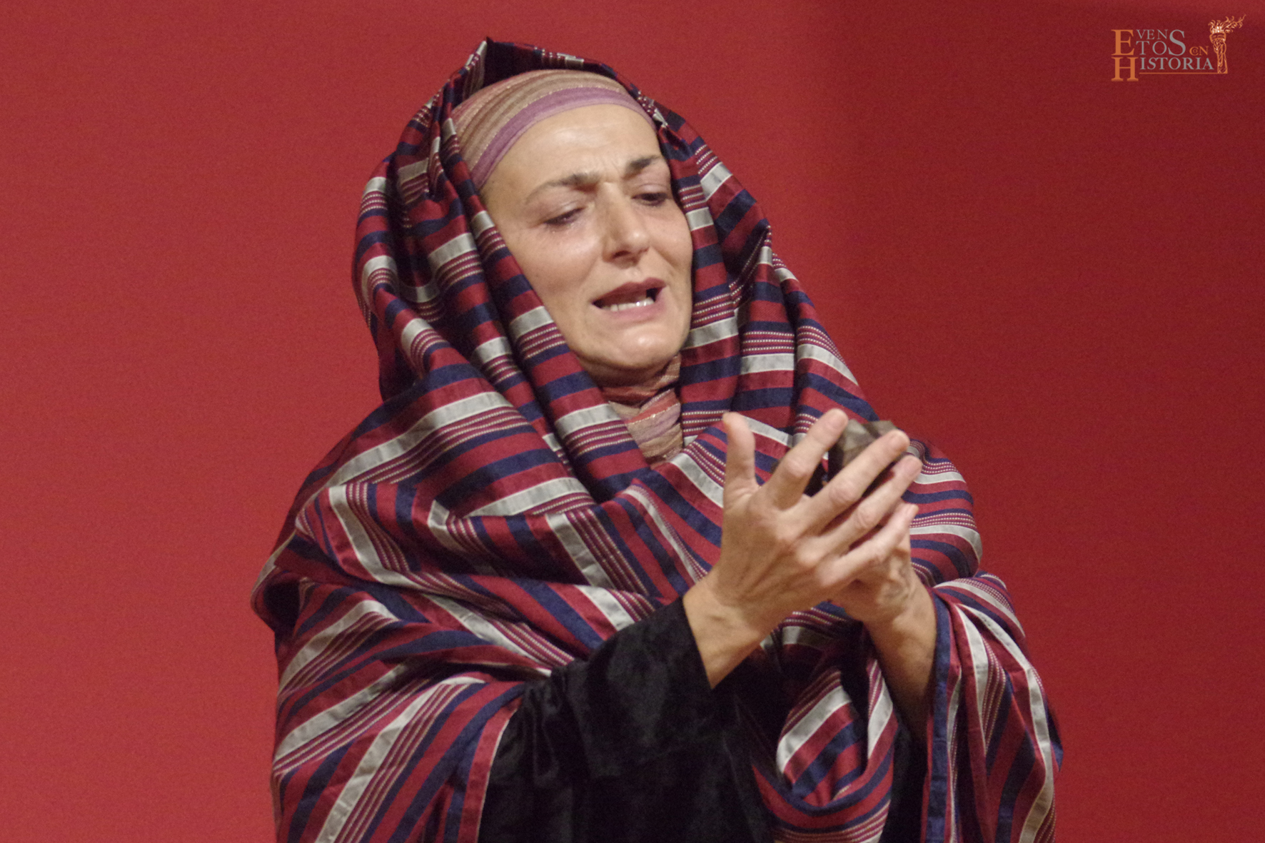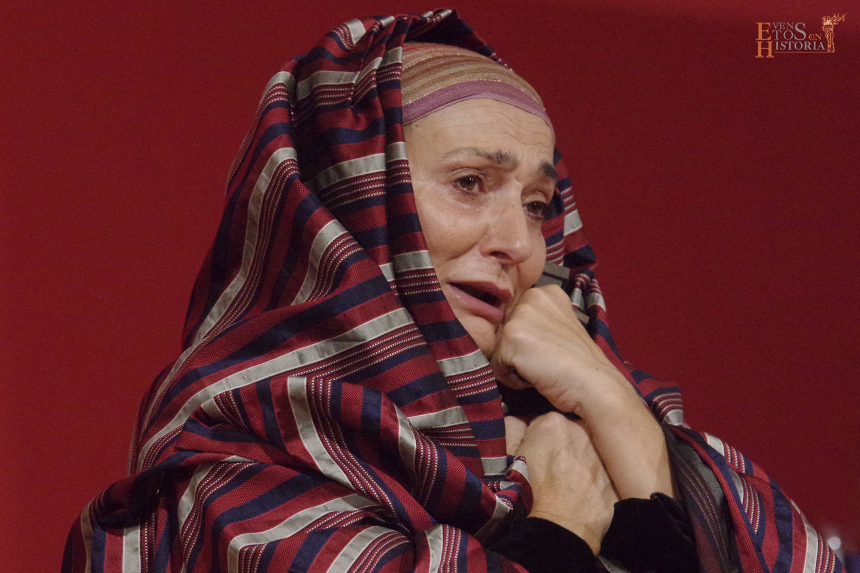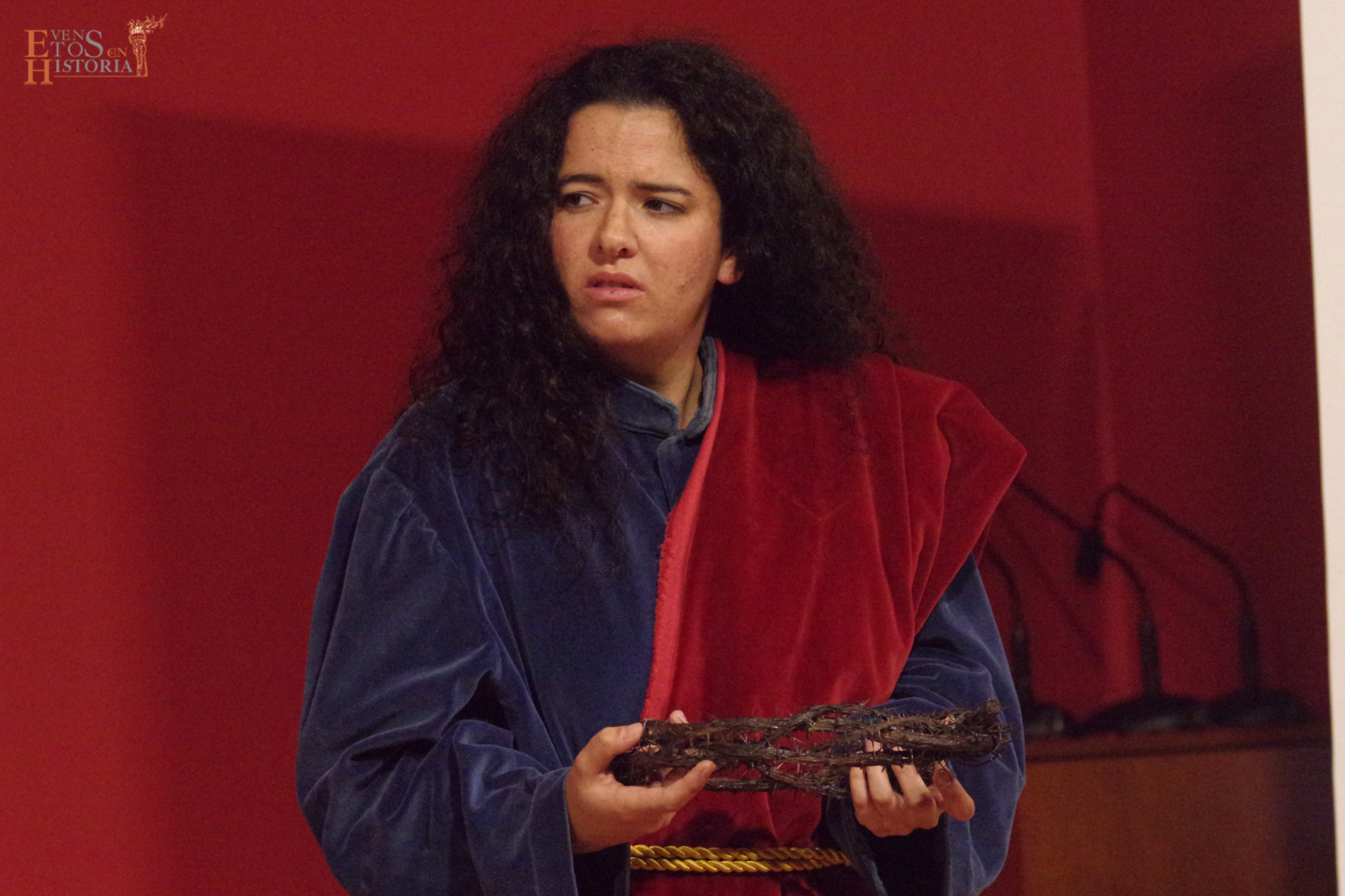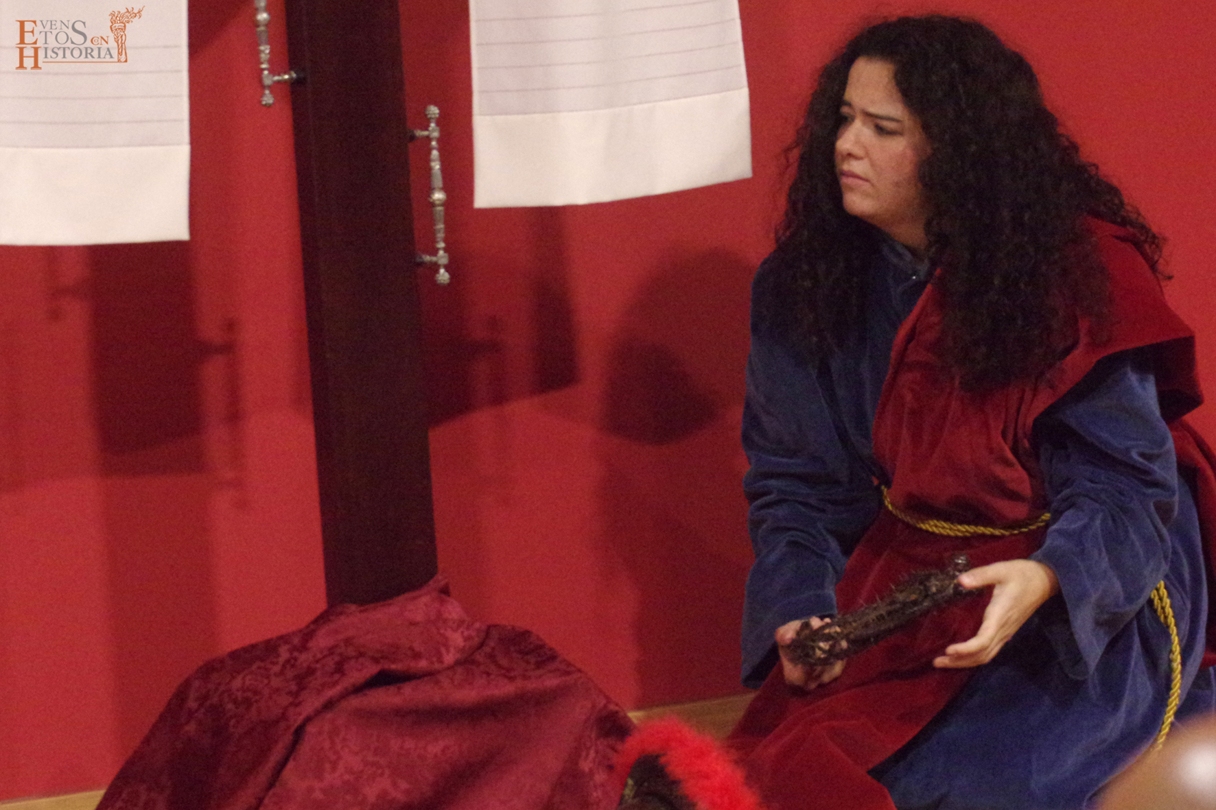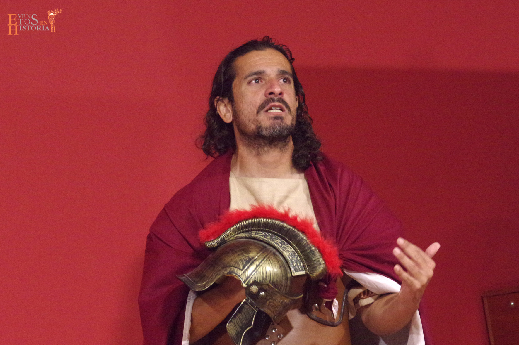 Nos trasladamos al monte Calvario ante una cruz desnuda, momentos después de la bajada de Cristo, sin nadie… todo era silencio y desolación. Y fueron entrando uno a uno cada testigo de los hechos que marcaron la historia final del Maestro introducidos por un narrador de excepción, Judá Ben Hur. Así, el público se fue envolviendo en una atmósfera indescriptible con los monólogos del soldado romano arrepentido Flavio, Nicodemo, José de Arimetea, la madre María y María Magdalena. La emoción de la sala se perturbó cuando entró él, el innombrable, el Ser de Oscuridad… con tono desafiante y arrogante mostró sus armas, su poder y casi su victoria en esta eterna batalla entre el bien y el mal.