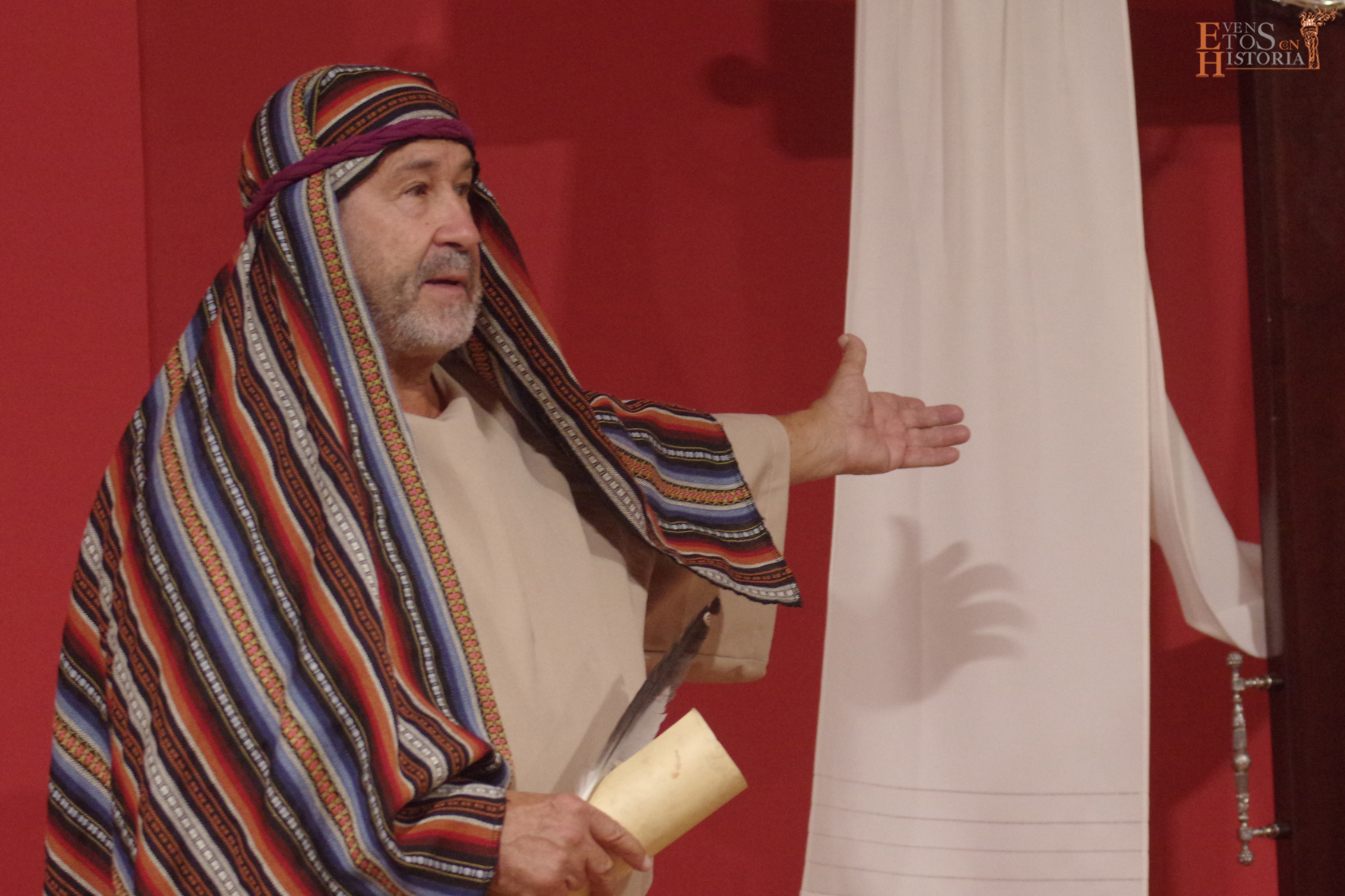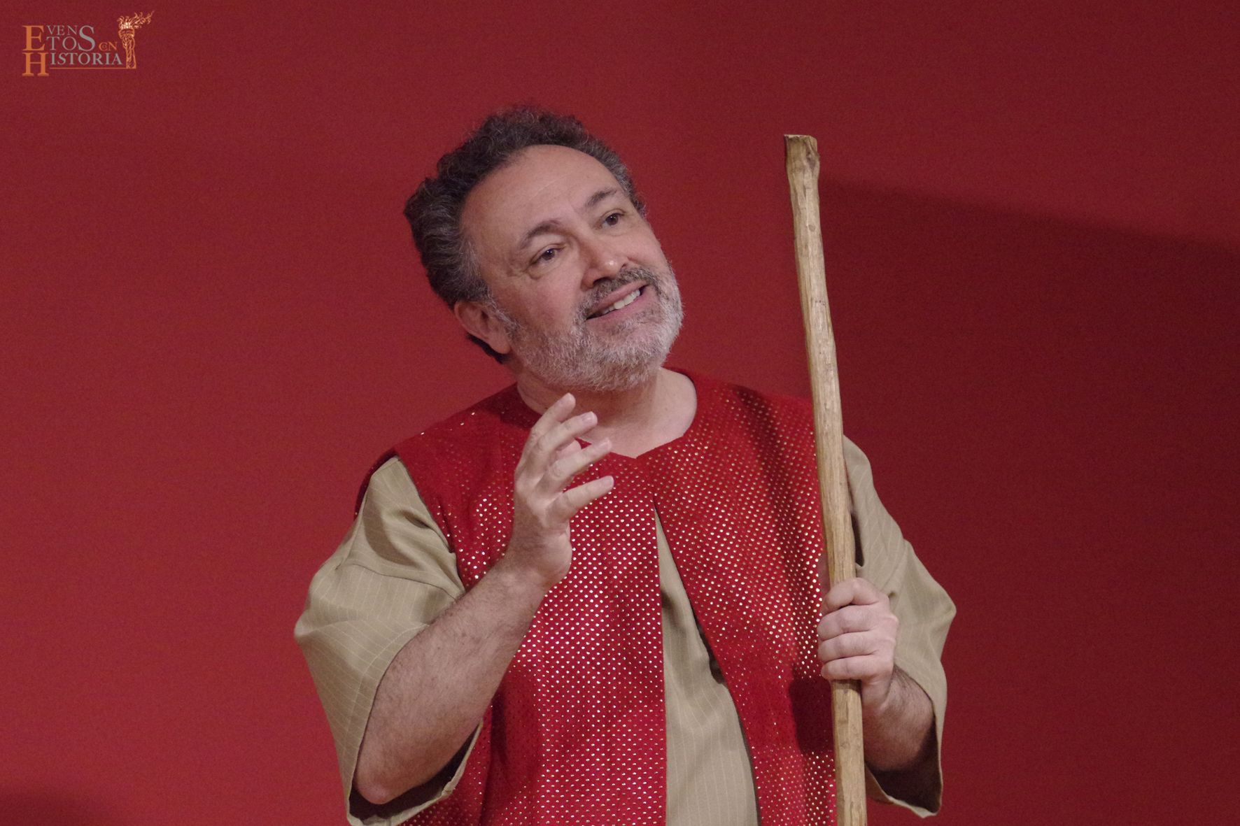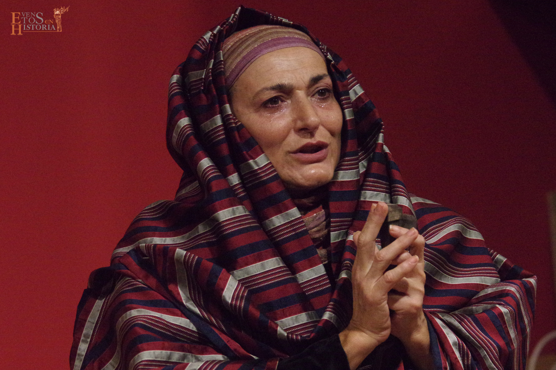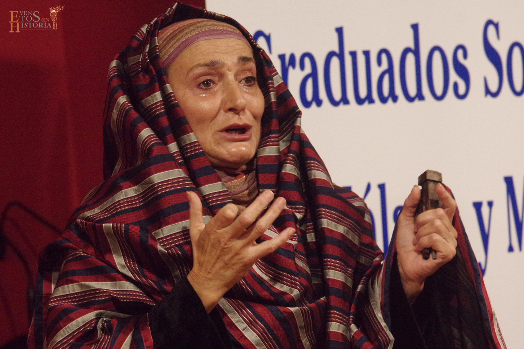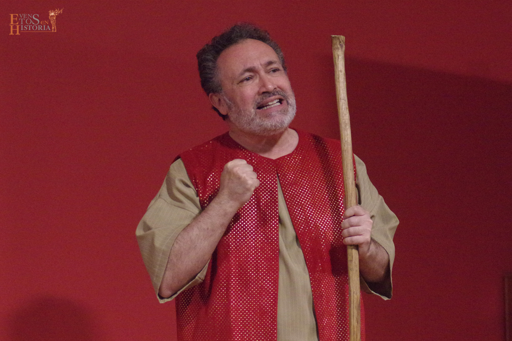 Nos trasladamos al monte Calvario ante una cruz desnuda, momentos después de la bajada de Cristo, sin nadie… todo era silencio y desolación. Y fueron entrando uno a uno cada testigo de los hechos que marcaron la historia final del Maestro introducidos por un narrador de excepción, Judá Ben Hur. Así, el público se fue envolviendo en una atmósfera indescriptible con los monólogos del soldado romano arrepentido Flavio, Nicodemo, José de Arimetea, la madre María y María Magdalena. La emoción de la sala se perturbó cuando entró él, el innombrable, el Ser de Oscuridad… con tono desafiante y arrogante mostró sus armas, su poder y casi su victoria en esta eterna batalla entre el bien y el mal.