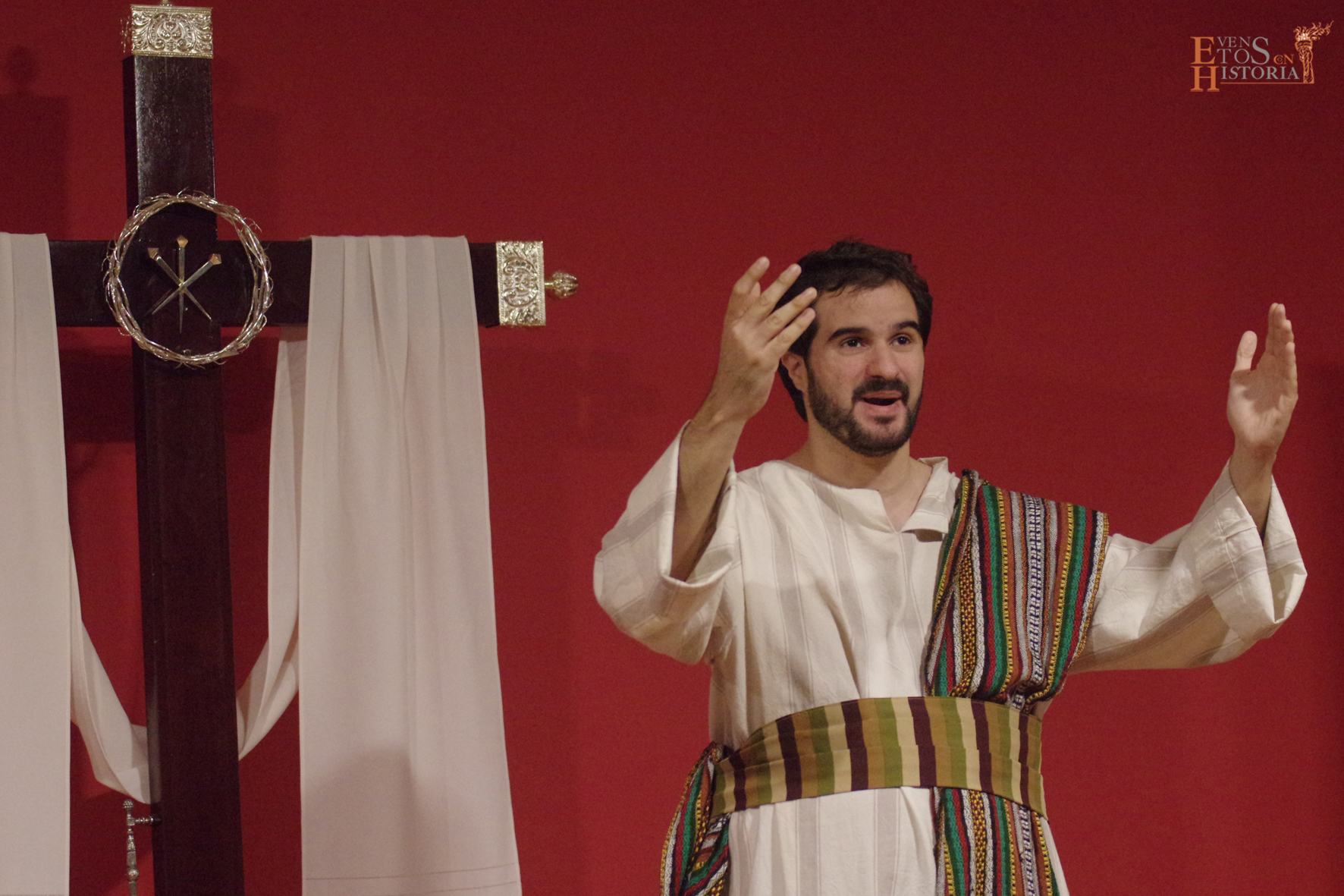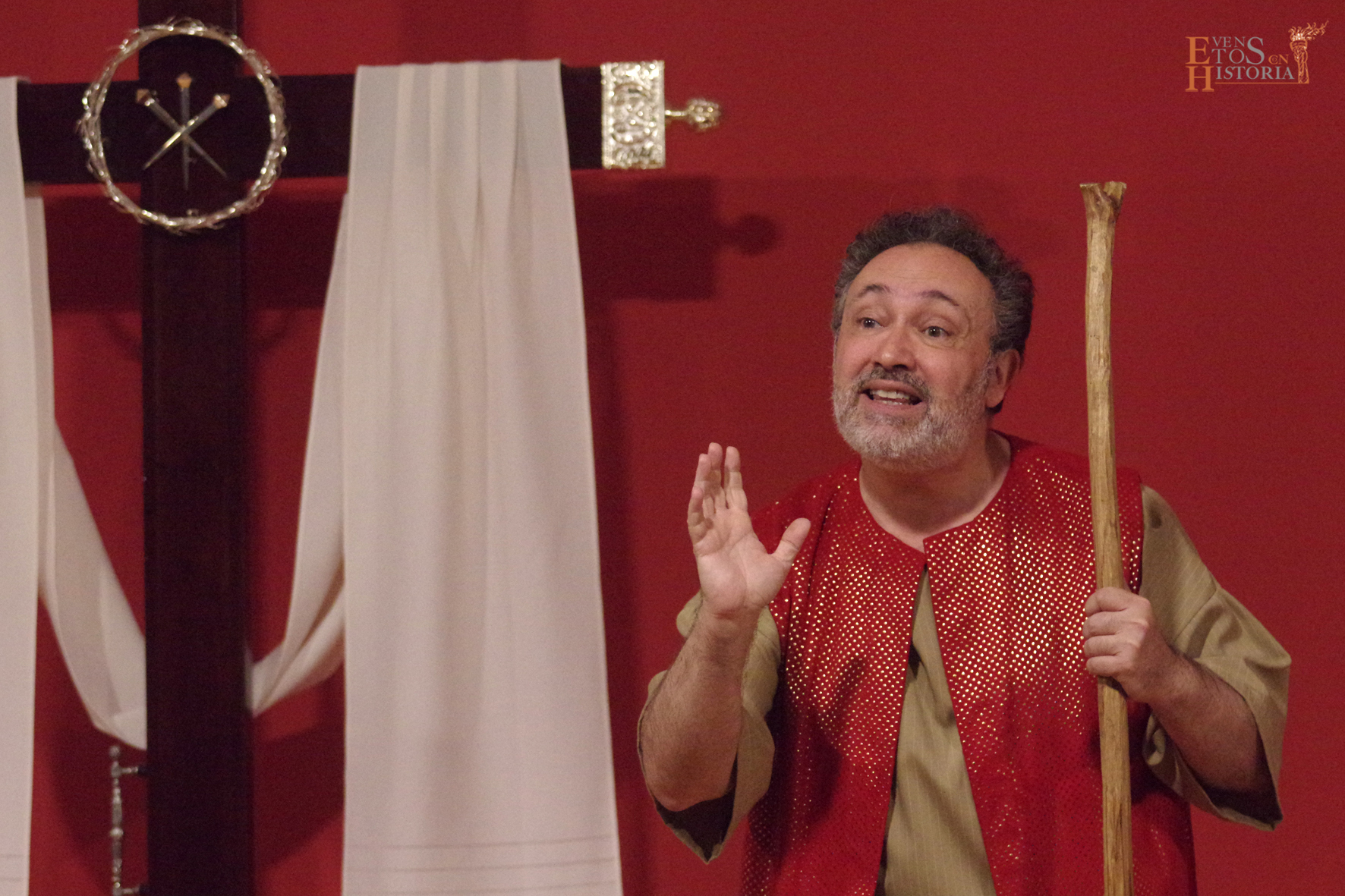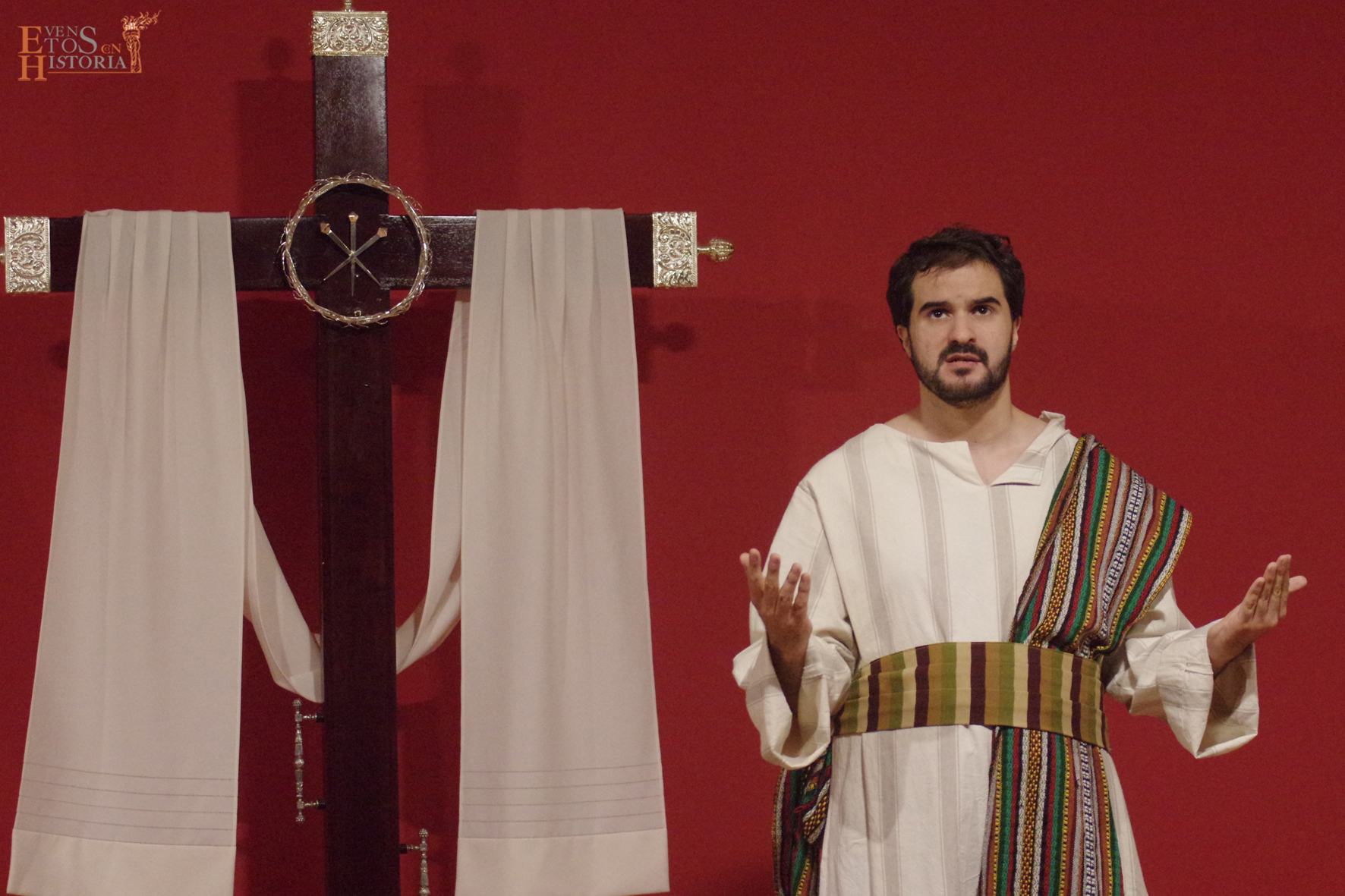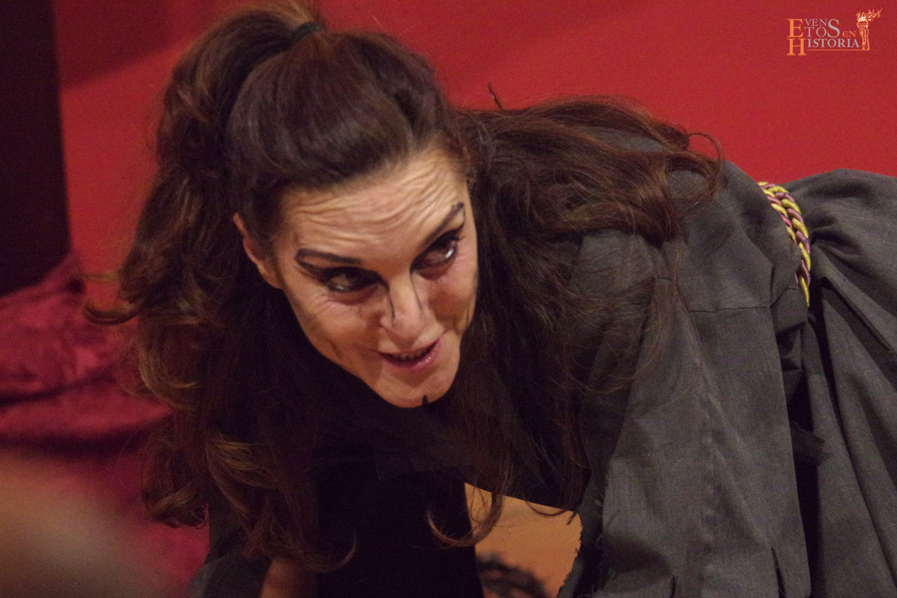 Nos trasladamos al monte Calvario ante una cruz desnuda, momentos después de la bajada de Cristo, sin nadie… todo era silencio y desolación. Y fueron entrando uno a uno cada testigo de los hechos que marcaron la historia final del Maestro introducidos por un narrador de excepción, Judá Ben Hur. Así, el público se fue envolviendo en una atmósfera indescriptible con los monólogos del soldado romano arrepentido Flavio, Nicodemo, José de Arimetea, la madre María y María Magdalena. La emoción de la sala se perturbó cuando entró él, el innombrable, el Ser de Oscuridad… con tono desafiante y arrogante mostró sus armas, su poder y casi su victoria en esta eterna batalla entre el bien y el mal.