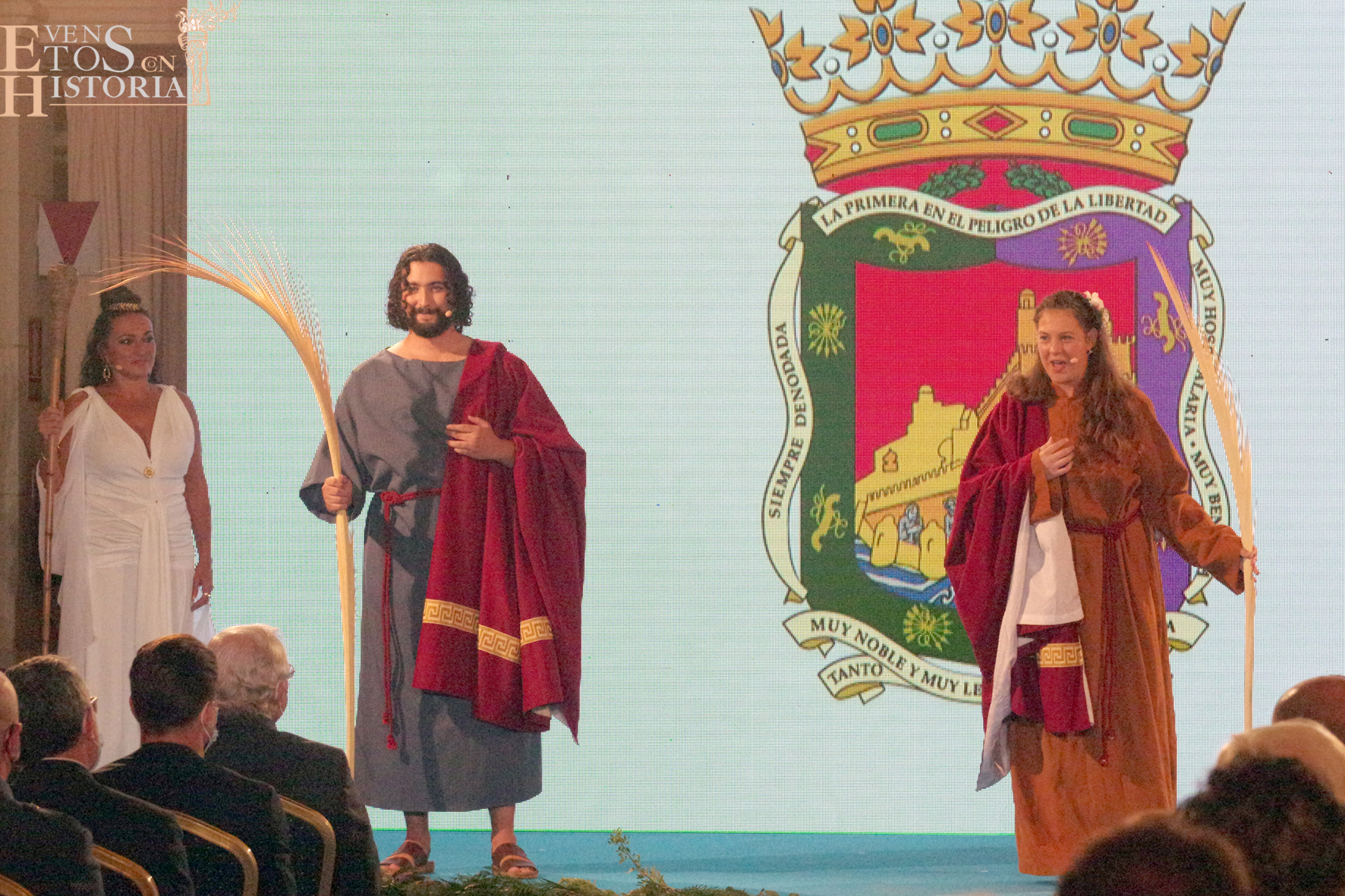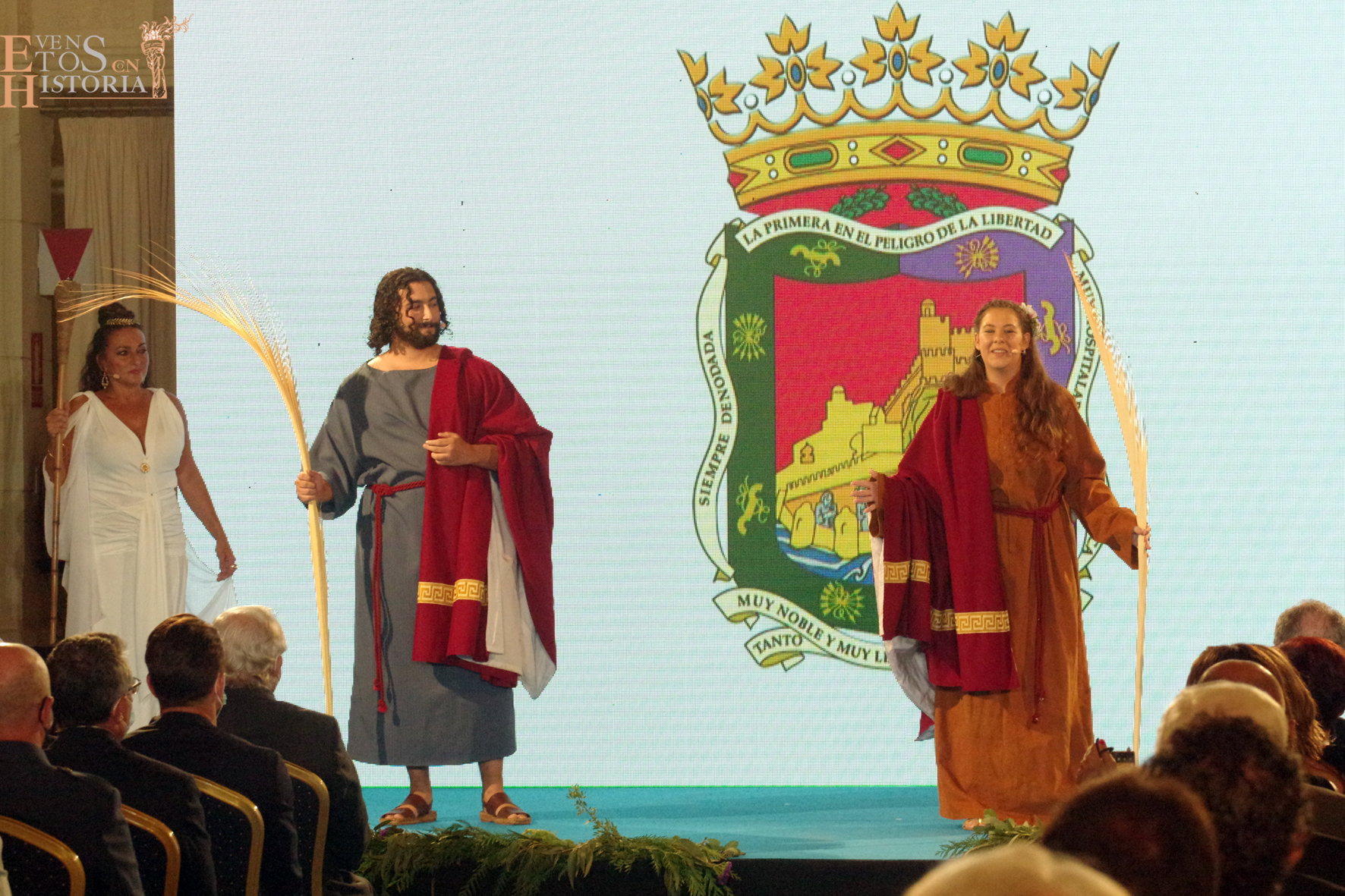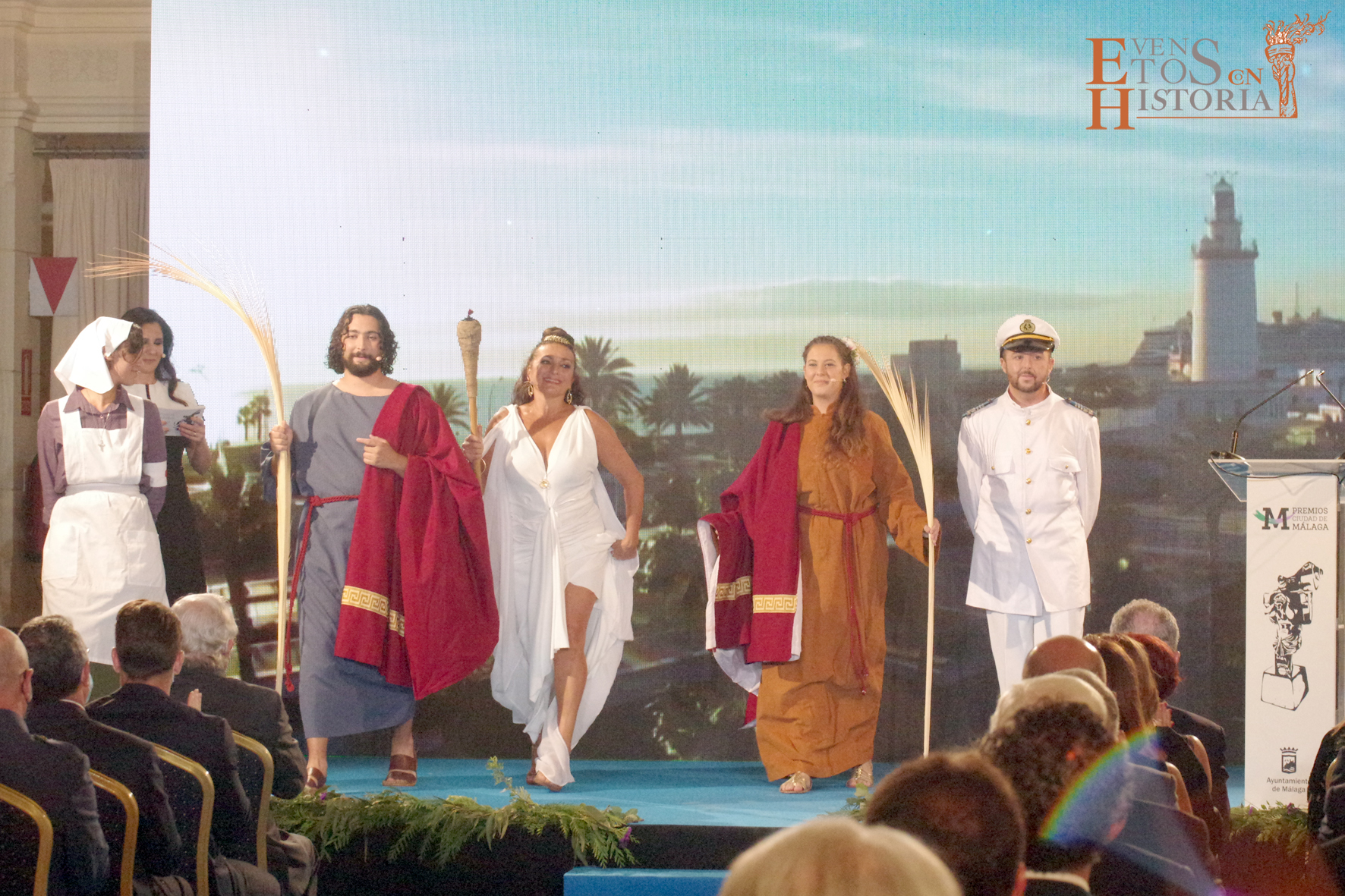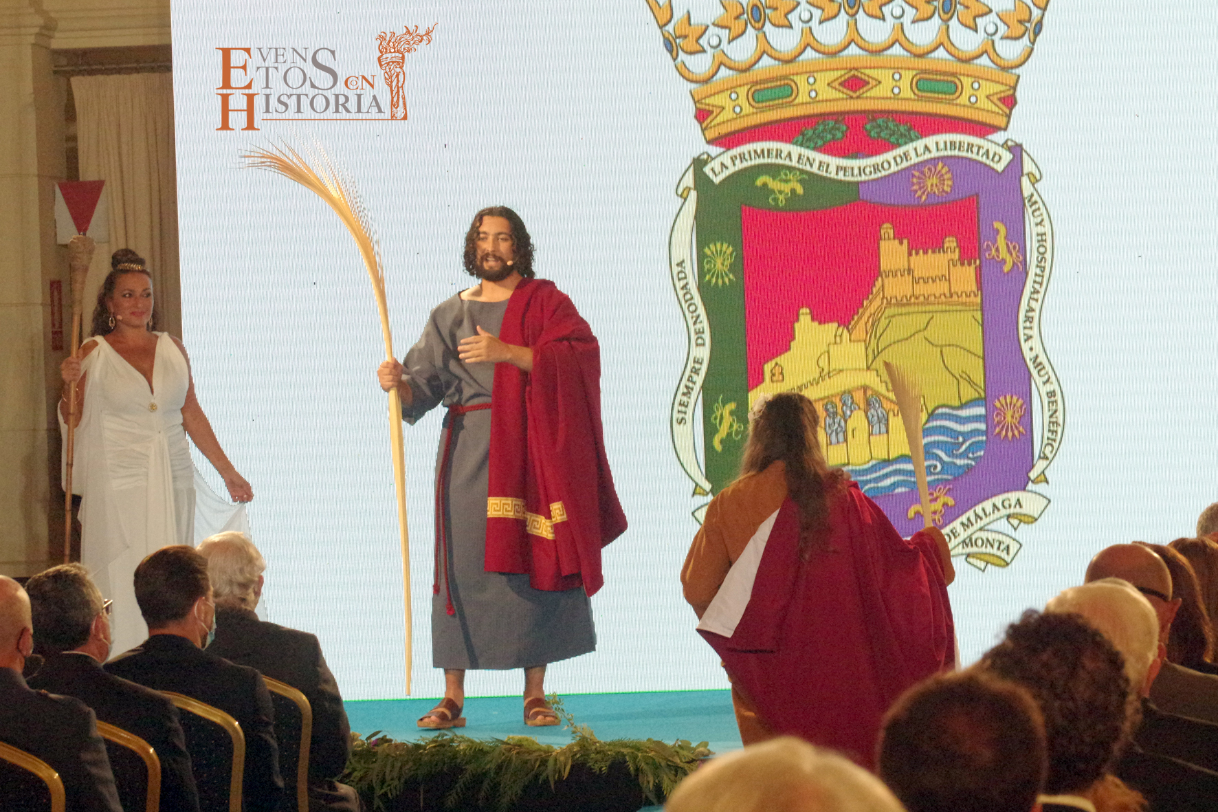 Eventos con Historia abrió la ceremonia de entrega de los galardones de los Premios Ciudad de Málaga 2021 con la teatralización del Escudo de la ciudad. La alegoría de Málaga irrumpió entre el público para contarnos su historia. Habló de cómo nació y fue evolucionando hasta ir consiguiendo todos los títulos que en la actualidad la distinguen:
