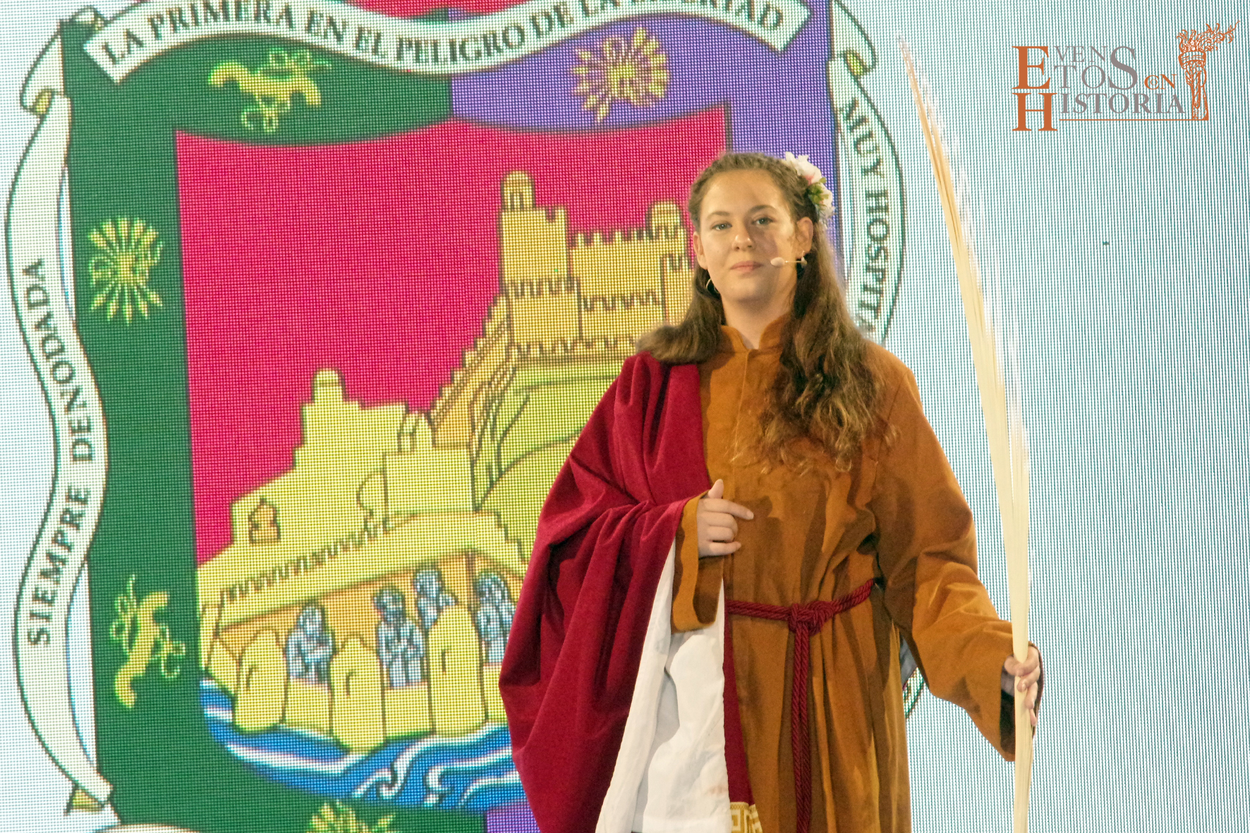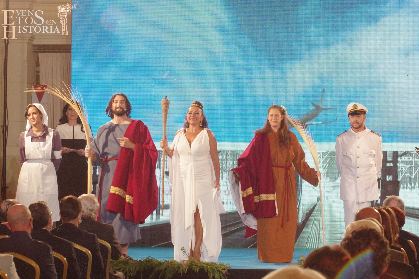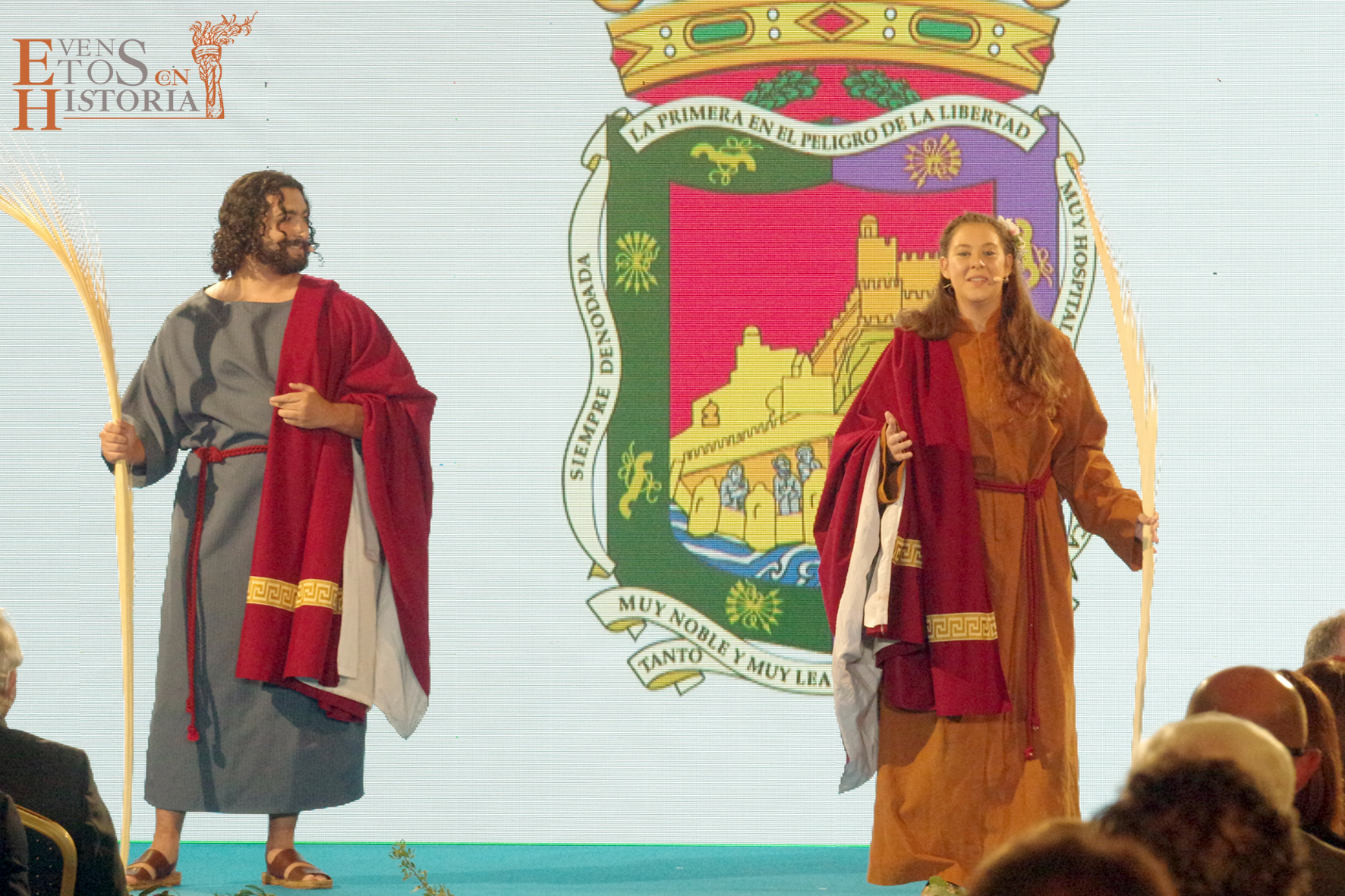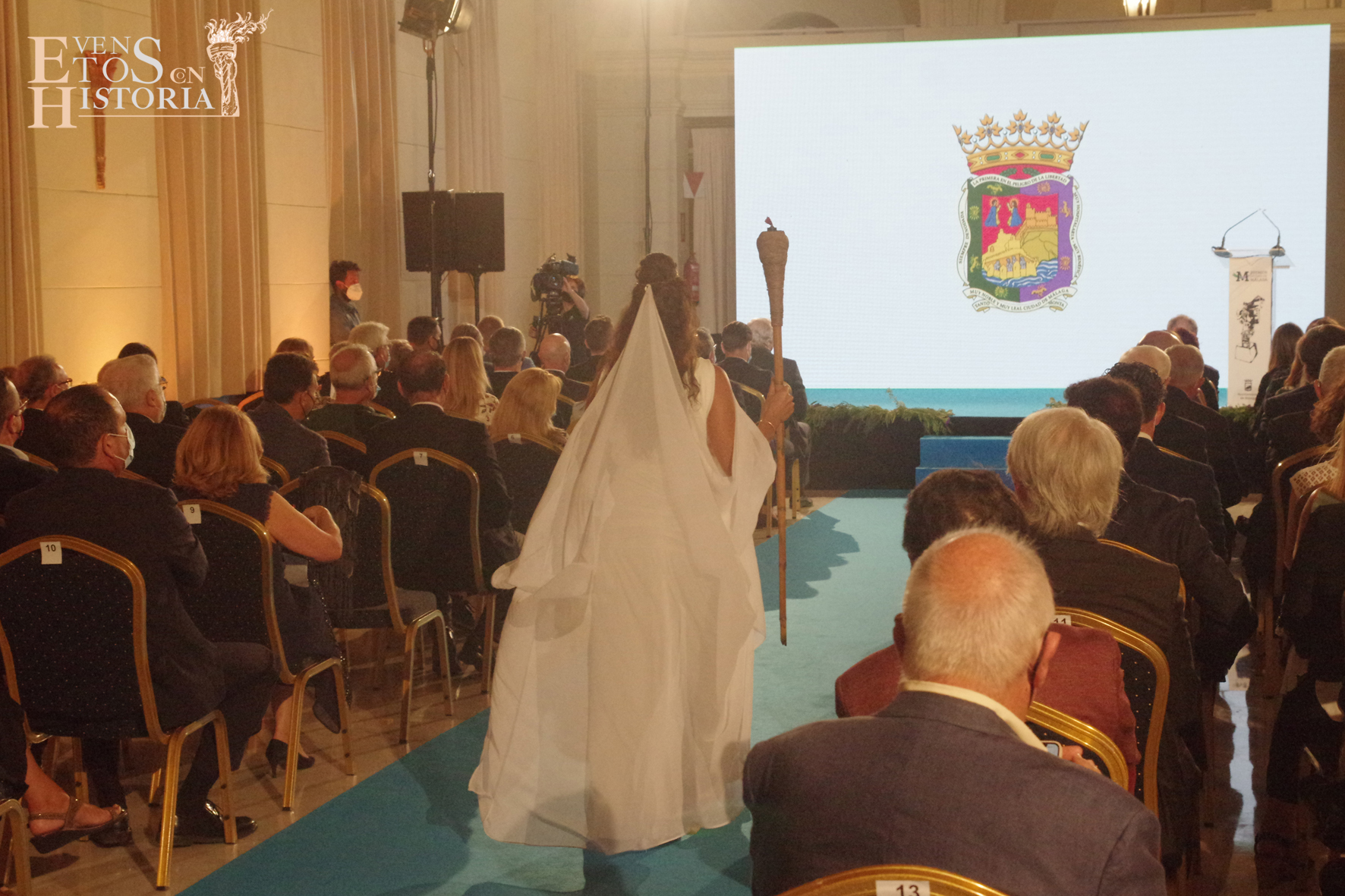 Eventos con Historia abrió la ceremonia de entrega de los galardones de los Premios Ciudad de Málaga 2021 con la teatralización del Escudo de la ciudad. La alegoría de Málaga irrumpió entre el público para contarnos su historia. Habló de cómo nació y fue evolucionando hasta ir consiguiendo todos los títulos que en la actualidad la distinguen: