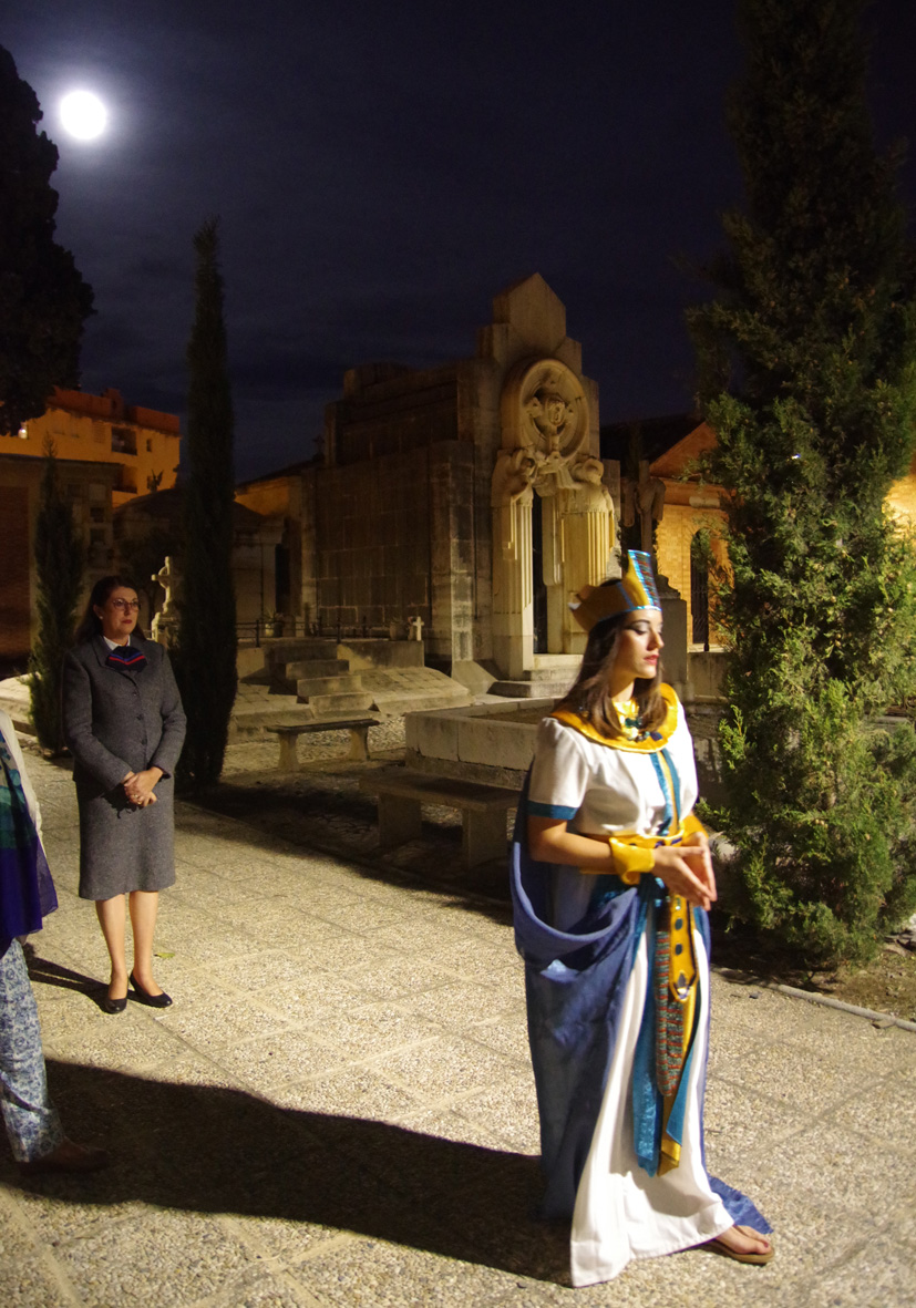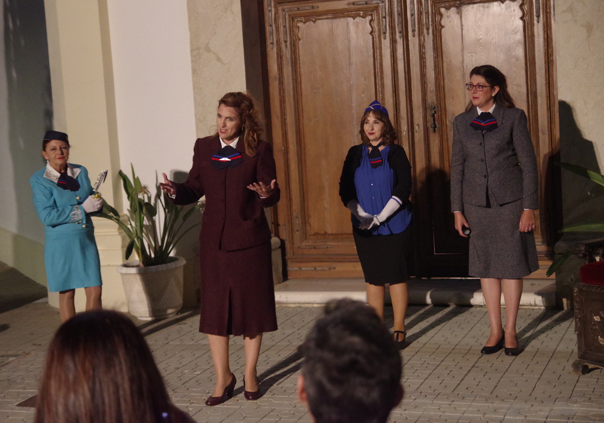 «¿Están preparados para viajar con nosotros a bordo del Zeppelin Graft?» Así invitábamos al público que se dio cita en el Cementerio Histórico San Miguel a viajar alrededor del mundo. Una maleta cargada de ilusión y ganas de aprender y disfrutar marcaba el inicio de la travesía. Apareció la tripulación, formada por cuatro azafatas del referido zeppelin de 1929: Marichín Ruiz, María Josefa Ugarte, Paloma Romero y Luisa Ruz. Ellas fueron las encargadas de conducir a los asistentes por las diferentes rutas que llevaban nada más ni nada menos que a los cinco continentes.