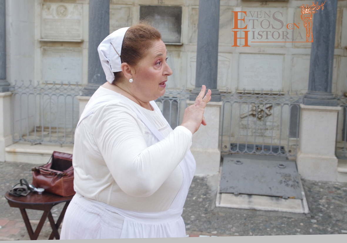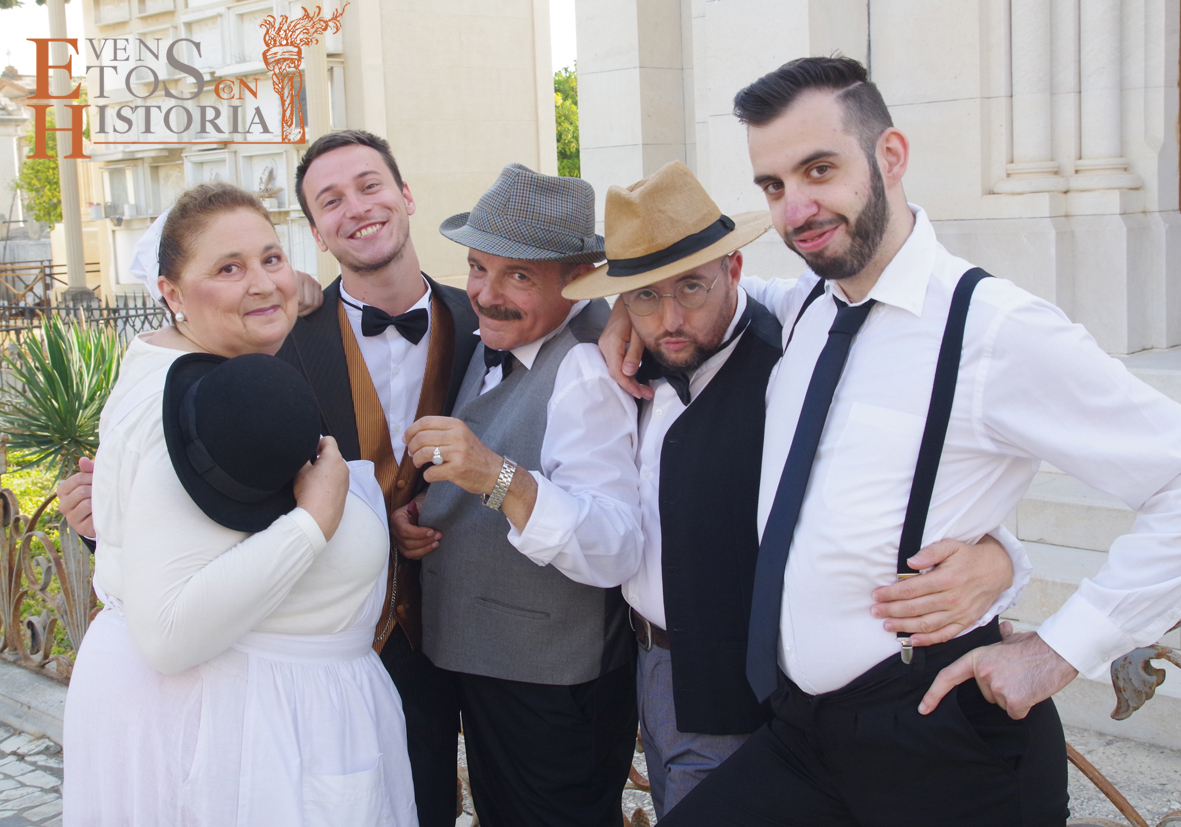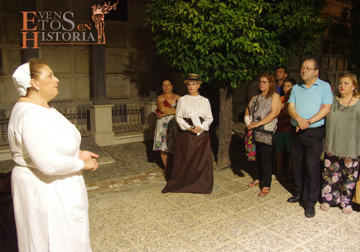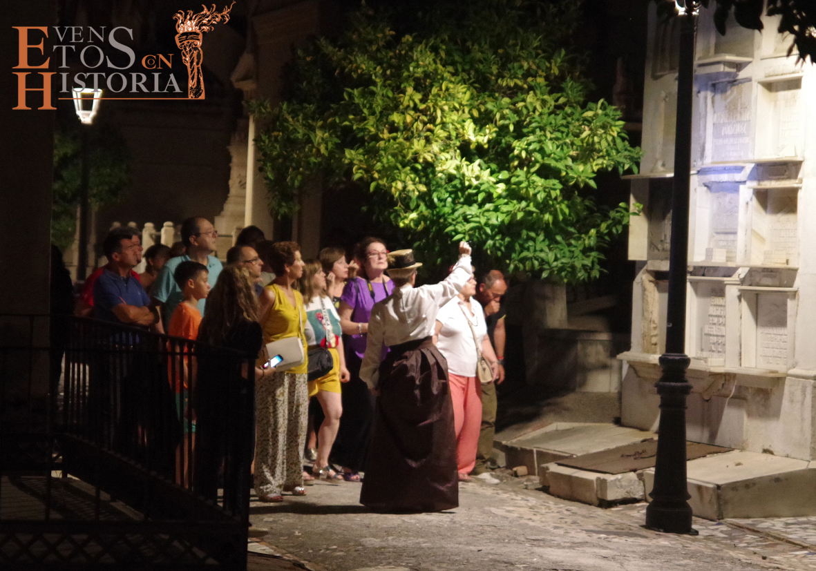 Cuatro damas del siglo XIX dieron la bienvenida a los asistentes al Congreso en el que se convirtió el camposanto, cada una de ellas especializada en una disciplina del saber: psicología, historia, comercio y matemáticas. Ellas, entre nichos y panteones, condujeron a cada grupo hasta las «salas» donde se hallaban los protagonistas de esta noche, no sin antes hablarles de la botánica, historia, simbología funeraria y algunas curiosidades y anécdotas que ellas, como moradoras del cementerio, conocen muy bien. Siempre, durante el recorrido, sonaban a lo lejos melodías procedentes de un violín en directo.